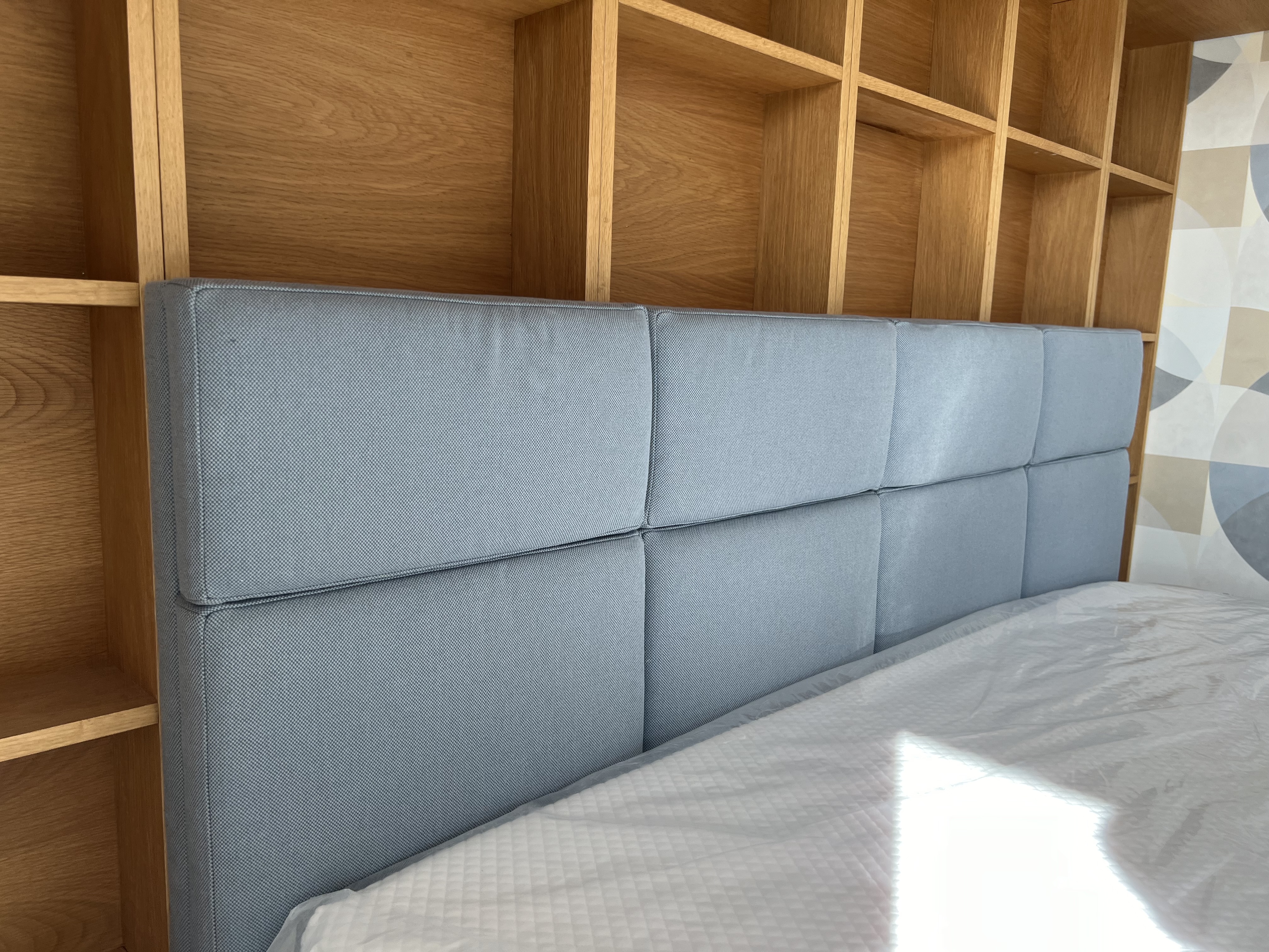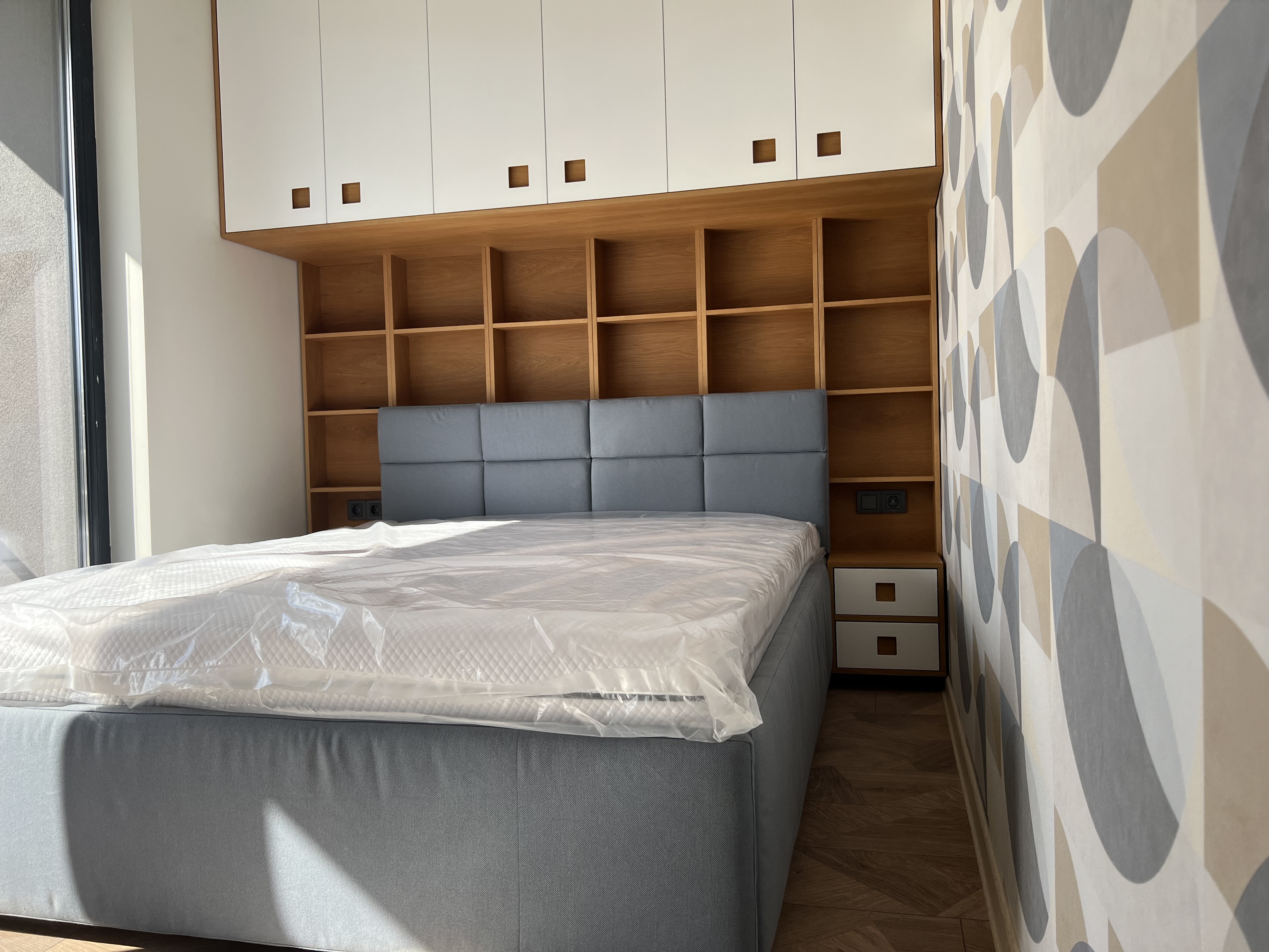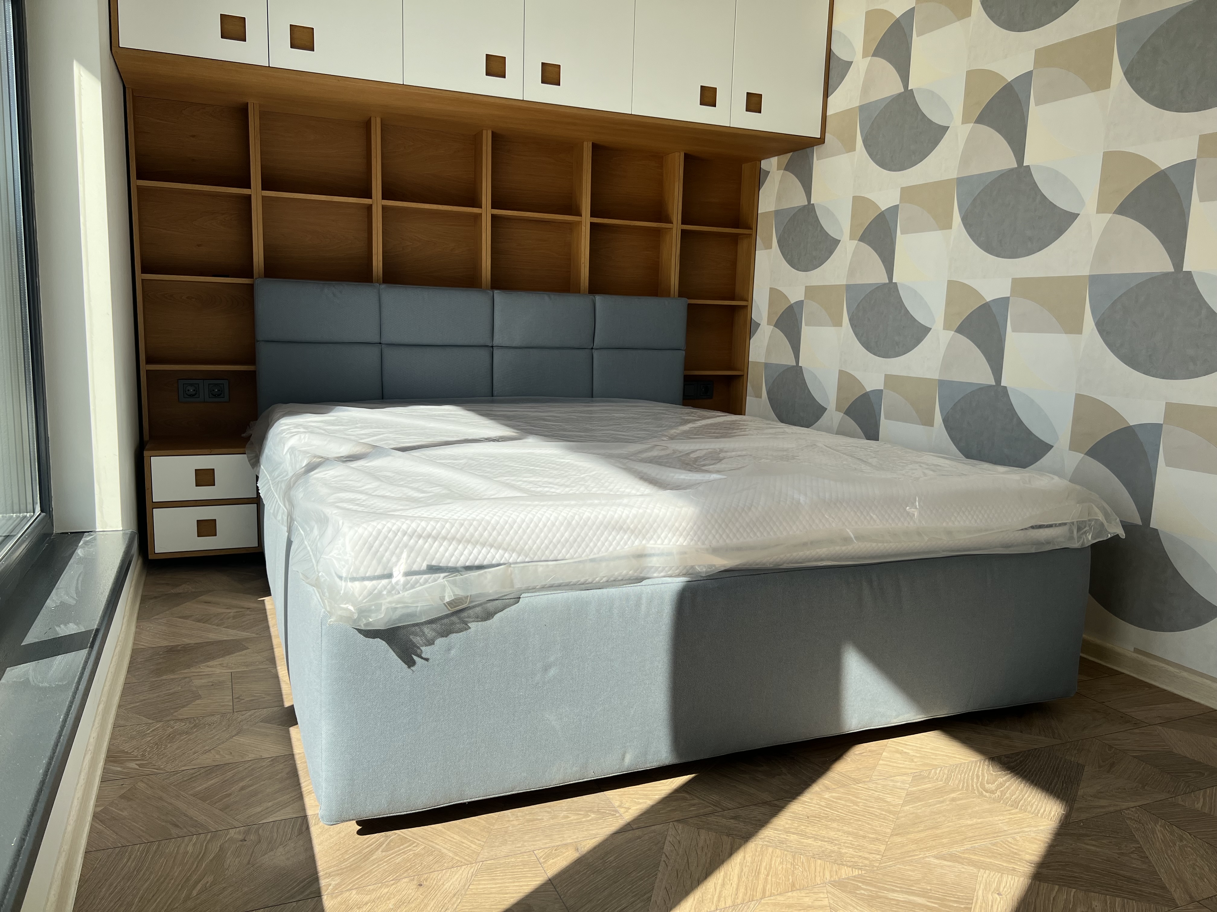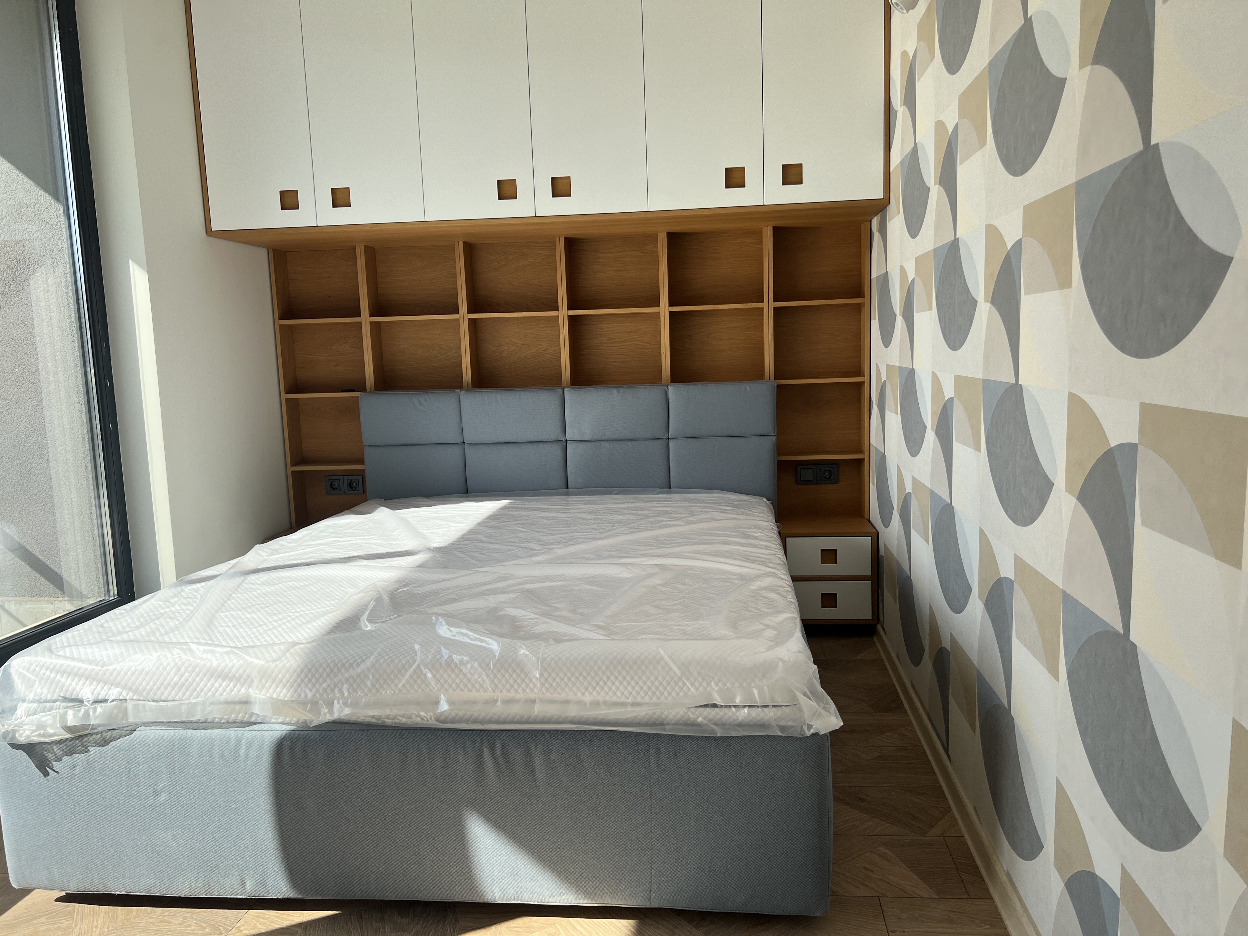 Спален комплект "Берлин", изработен от бял МДФ мат, тапицирана спалня и кафяв МДФ