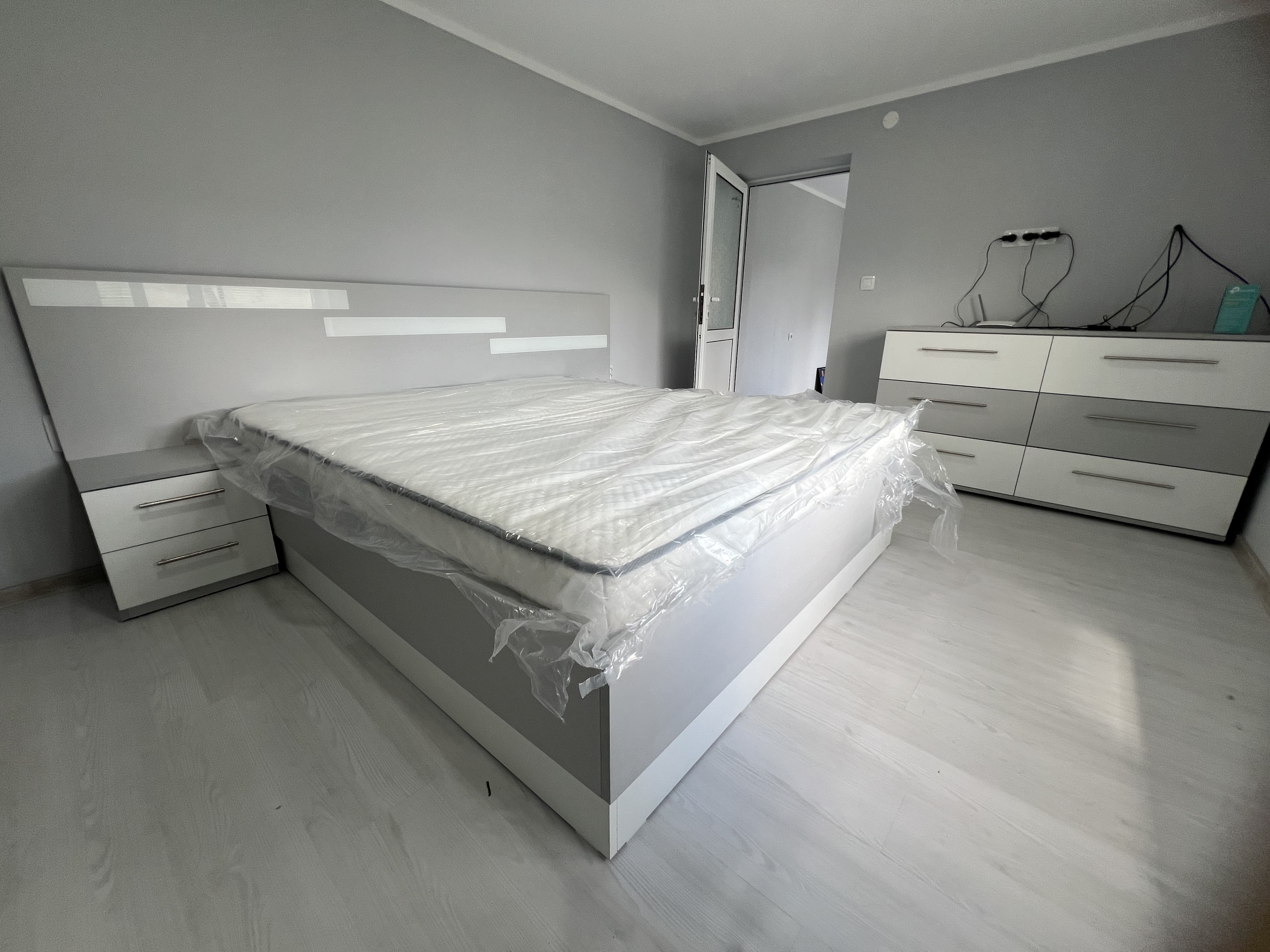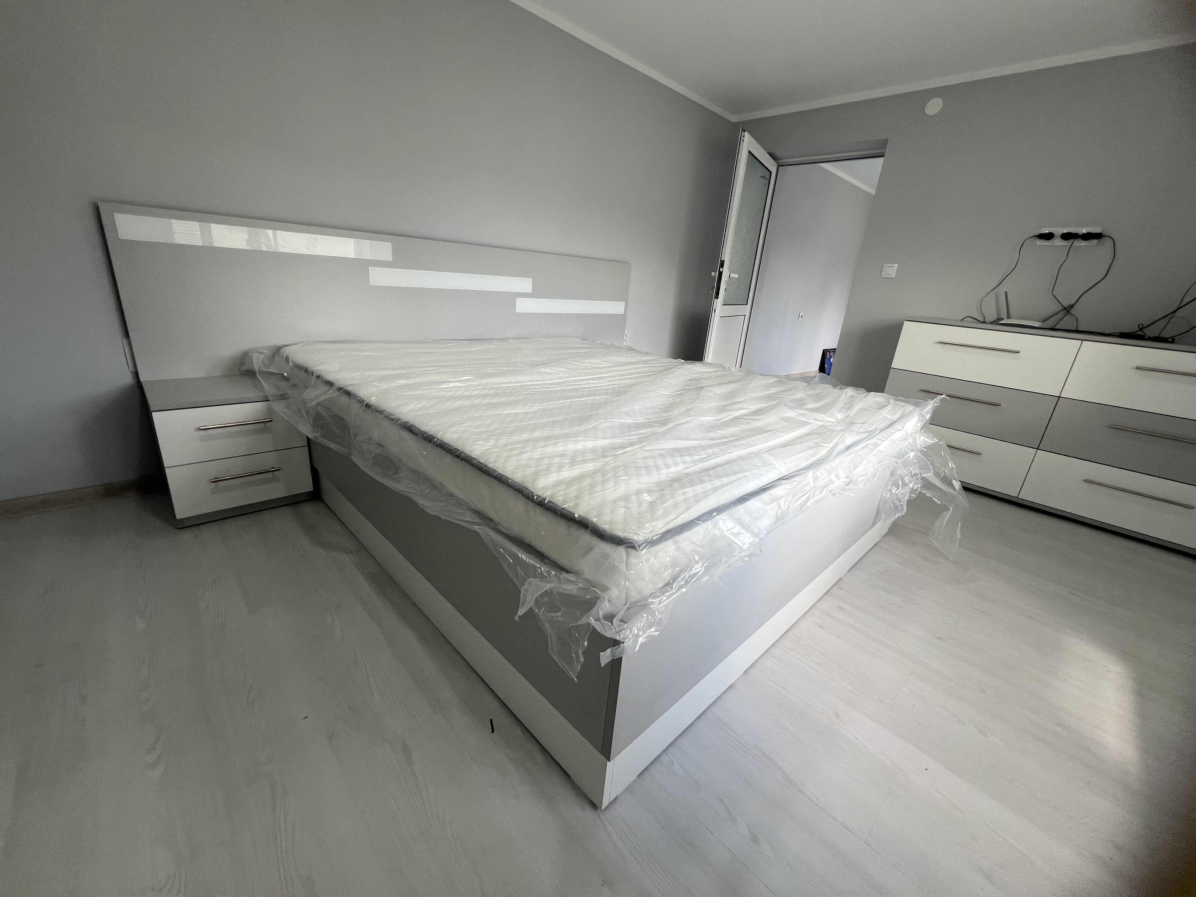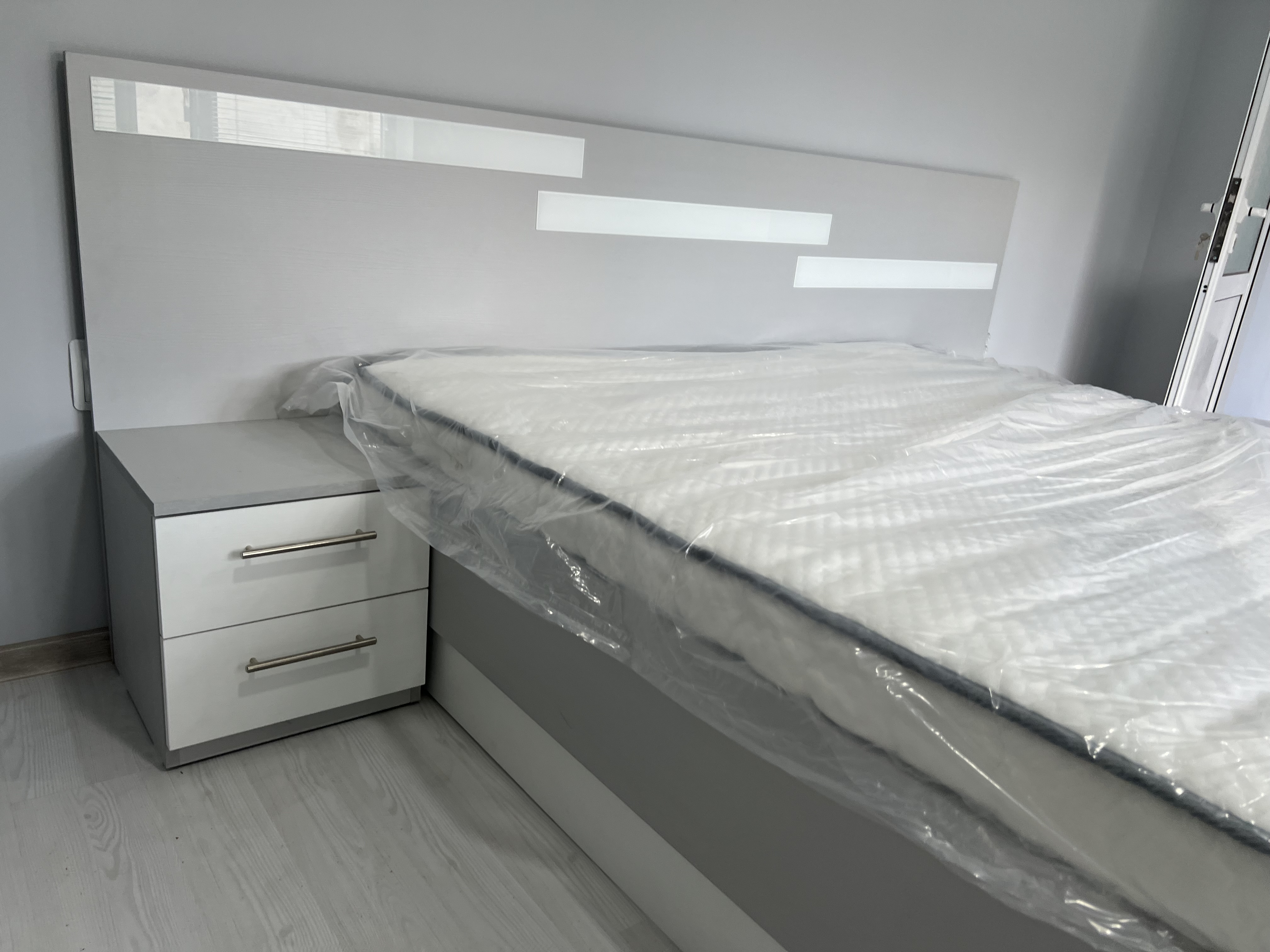 Спален комплект "Болоня", изработен от бяло дървестно ПДЧ и сив дървесен декор