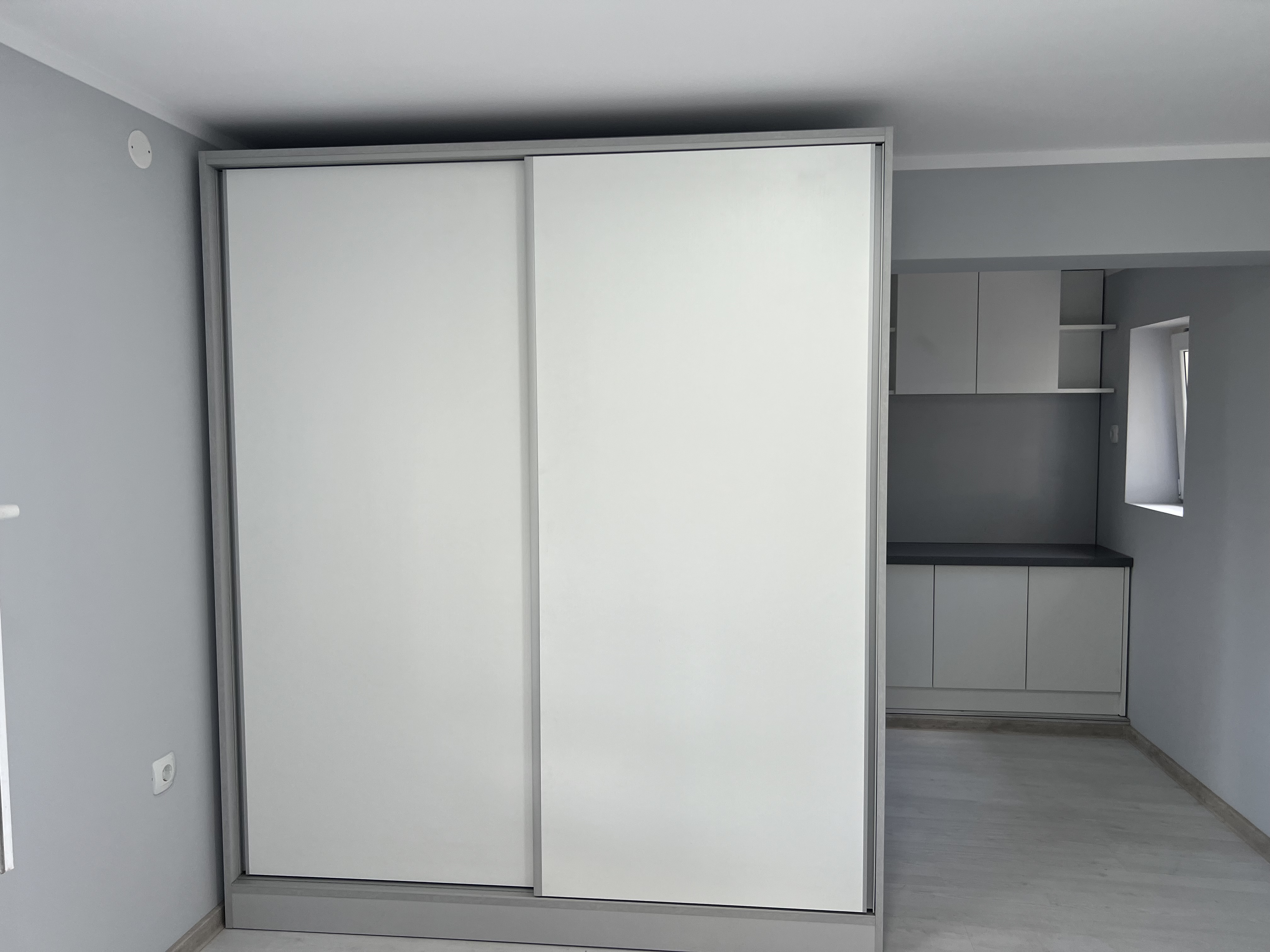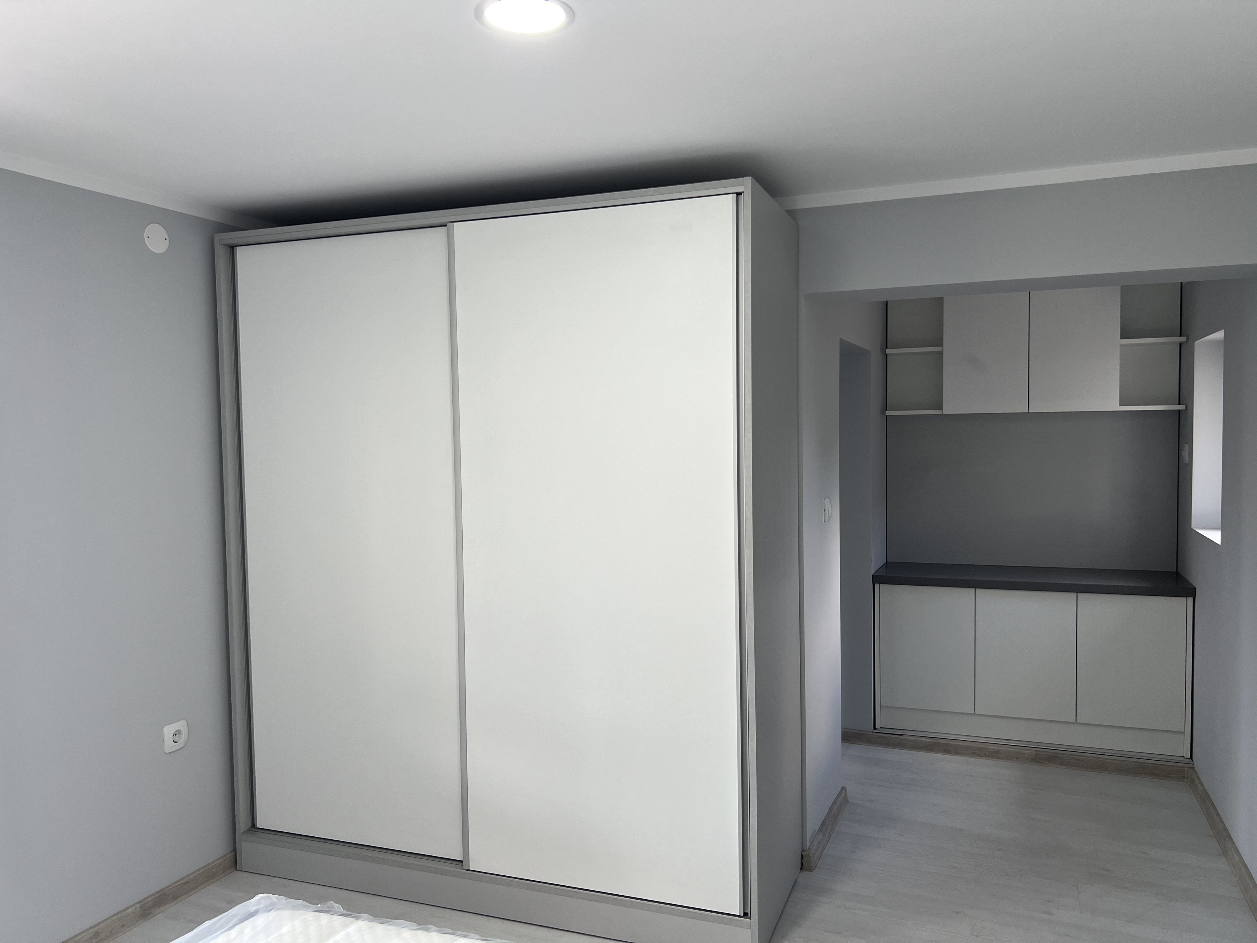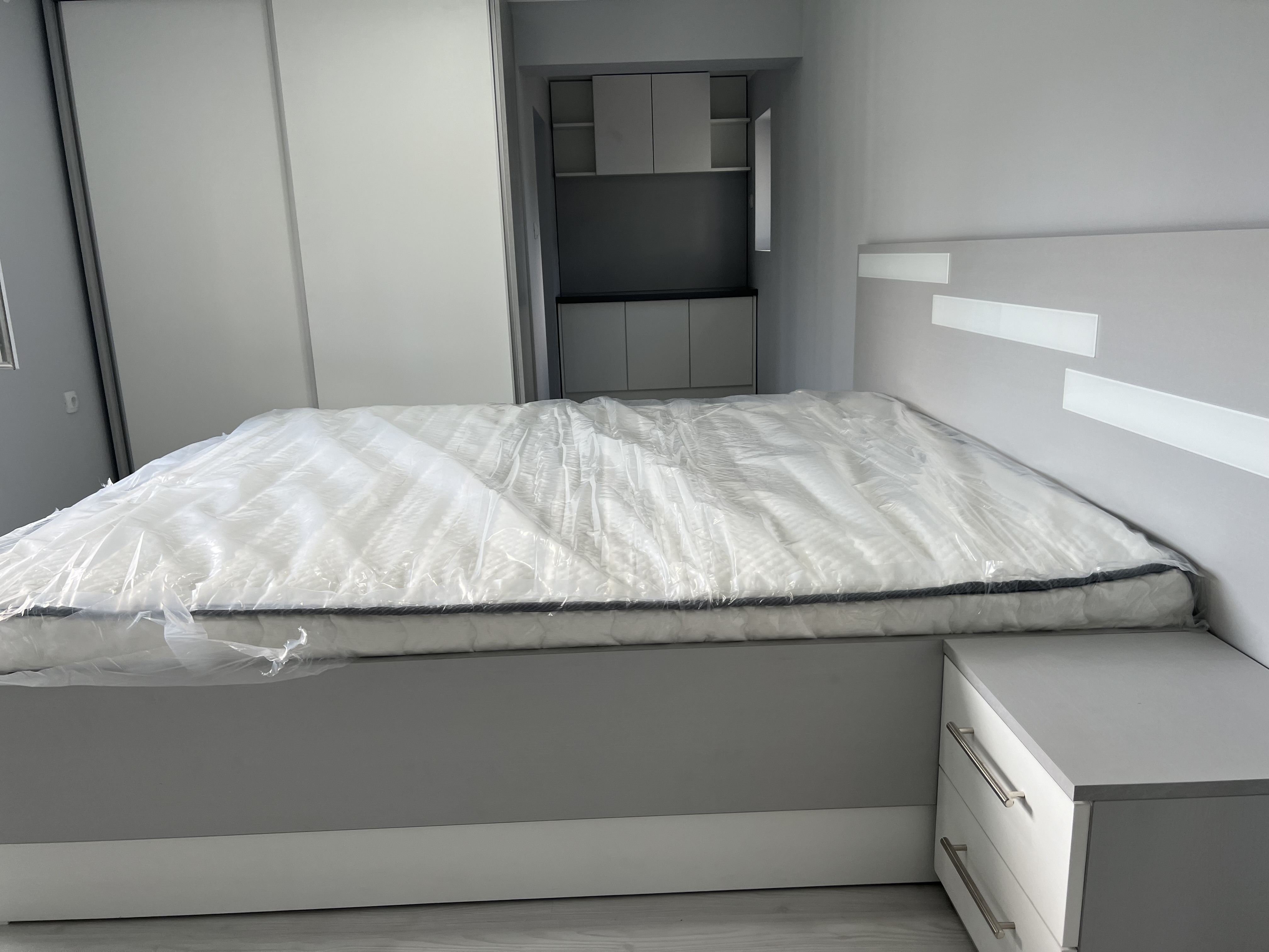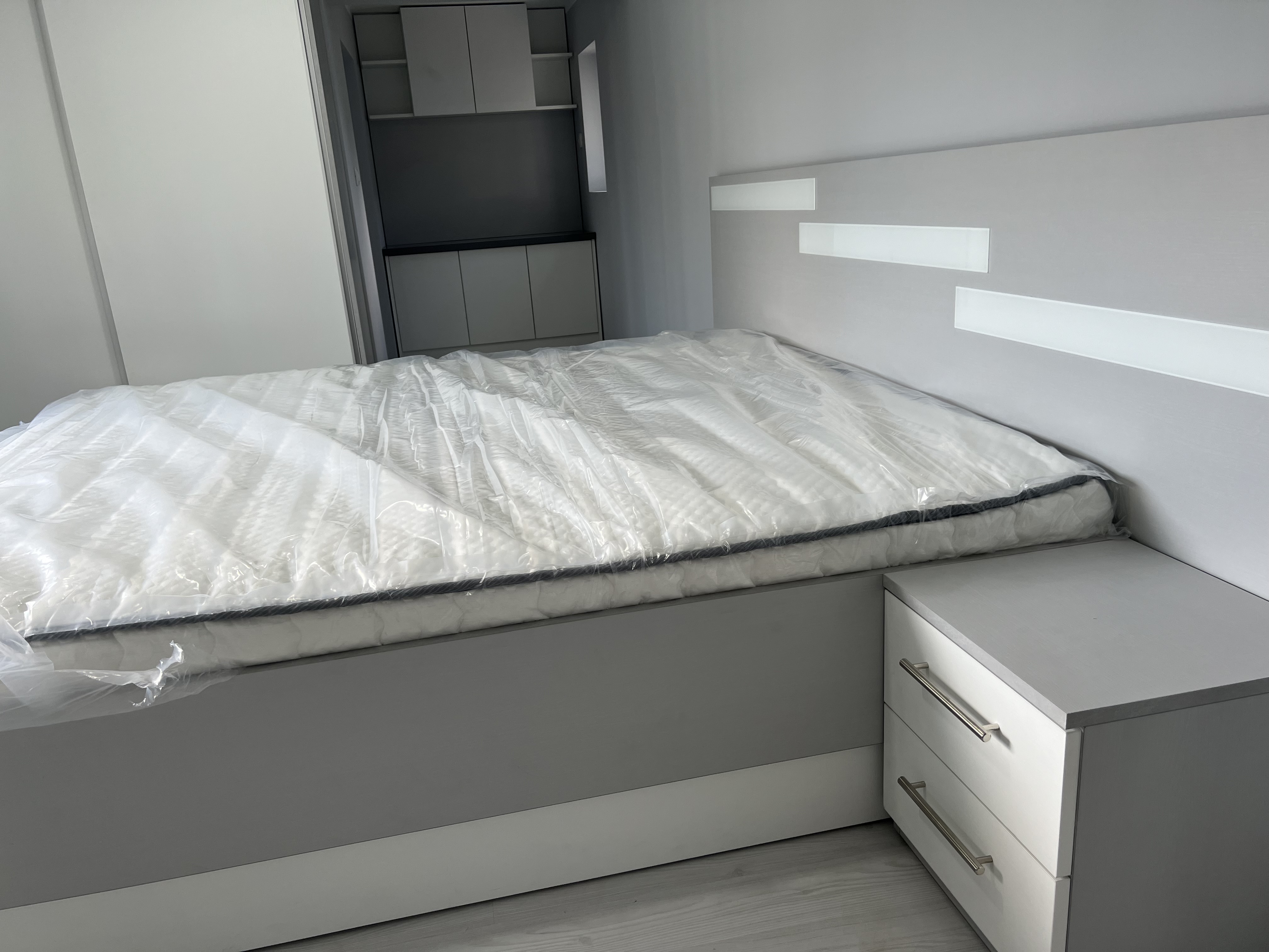 Спален комплект "Болоня", изработен от бяло дървестно ПДЧ и сив дървесен декор