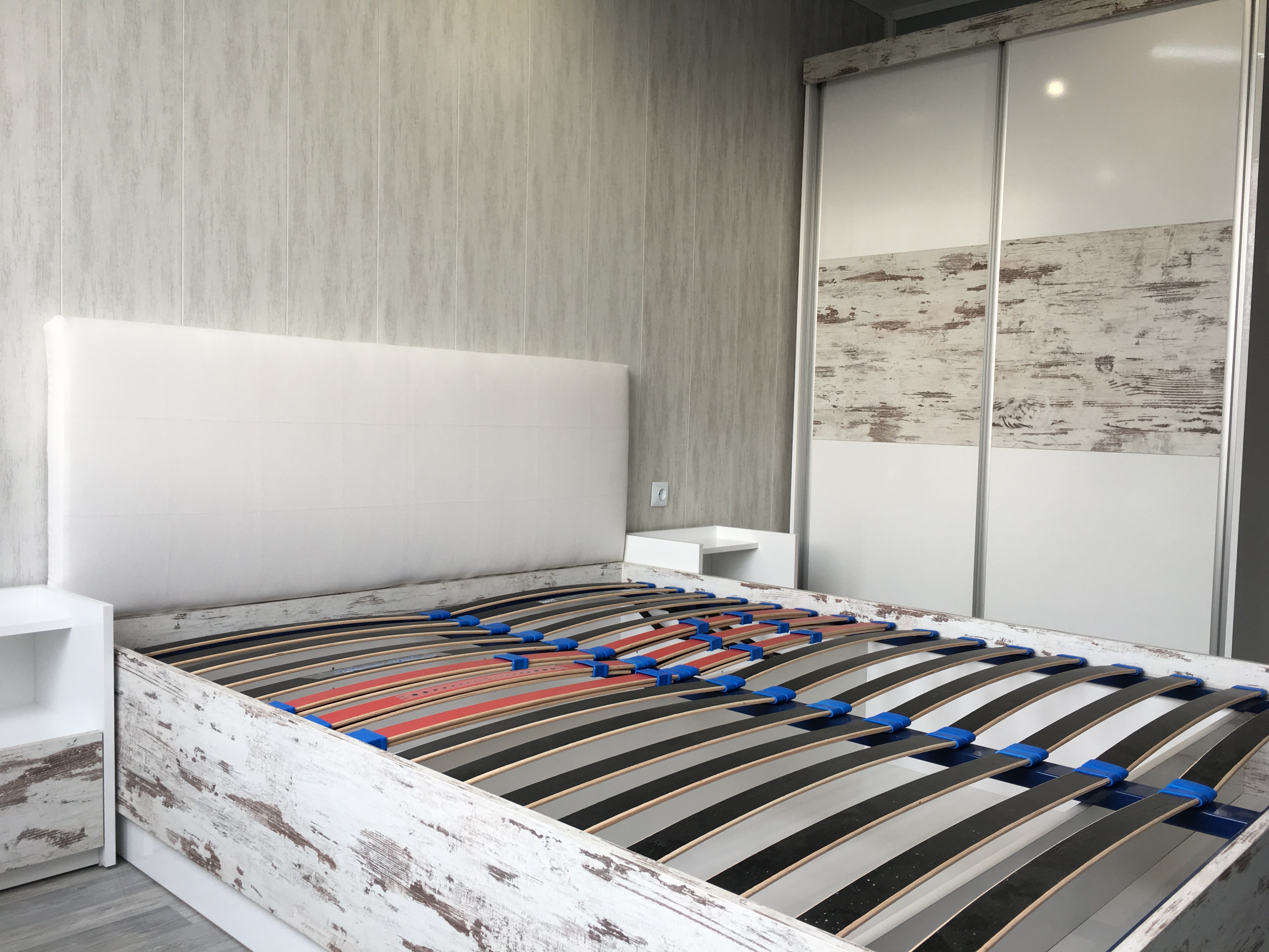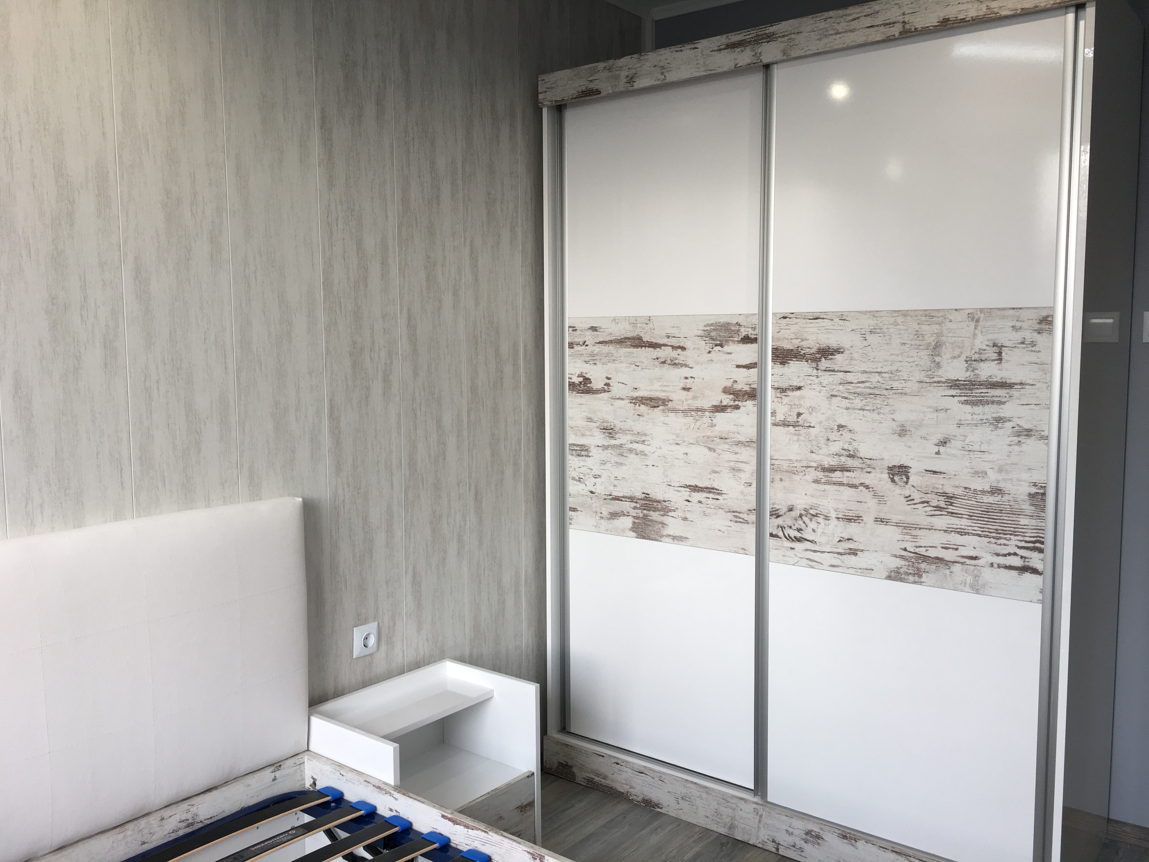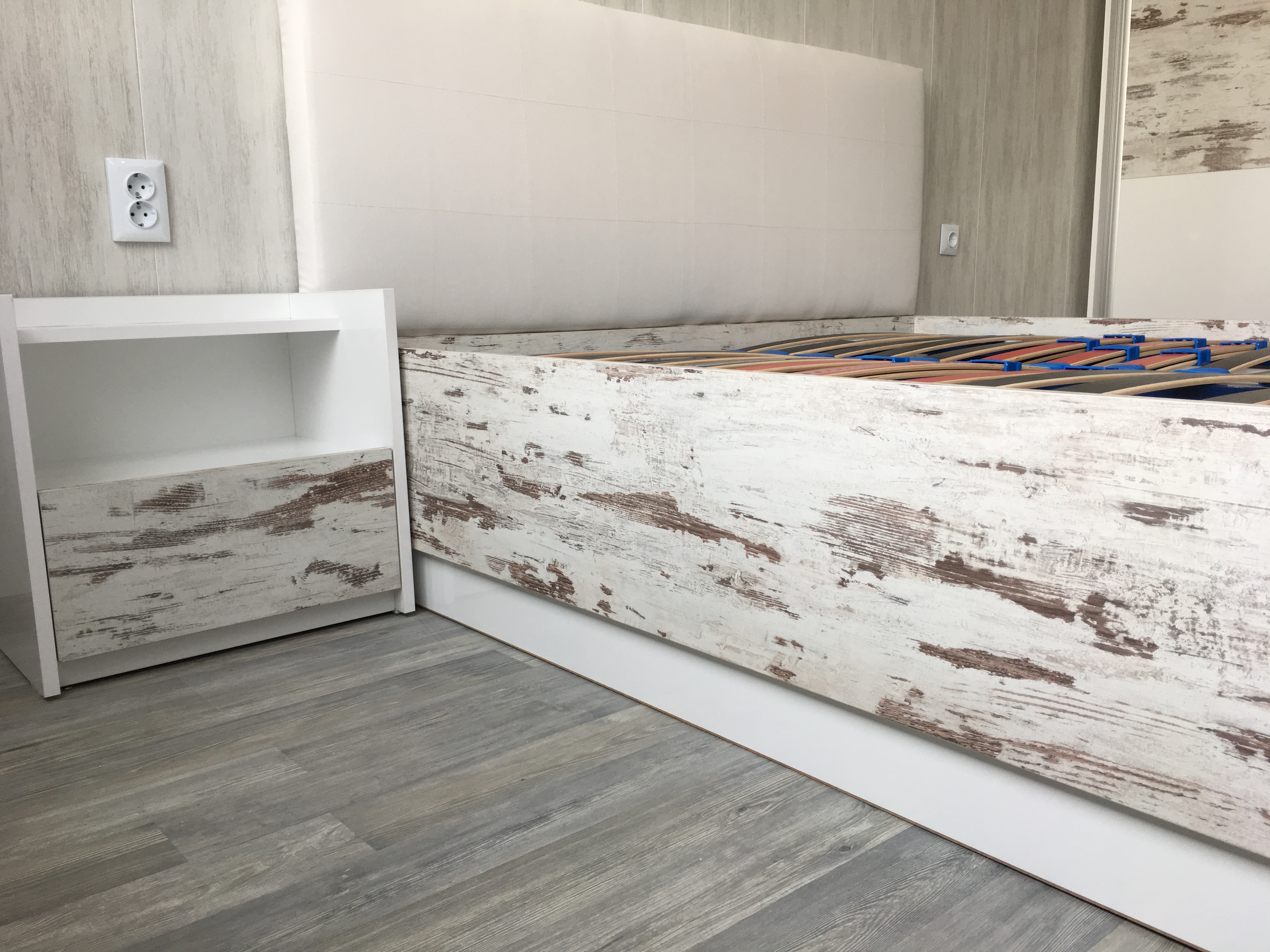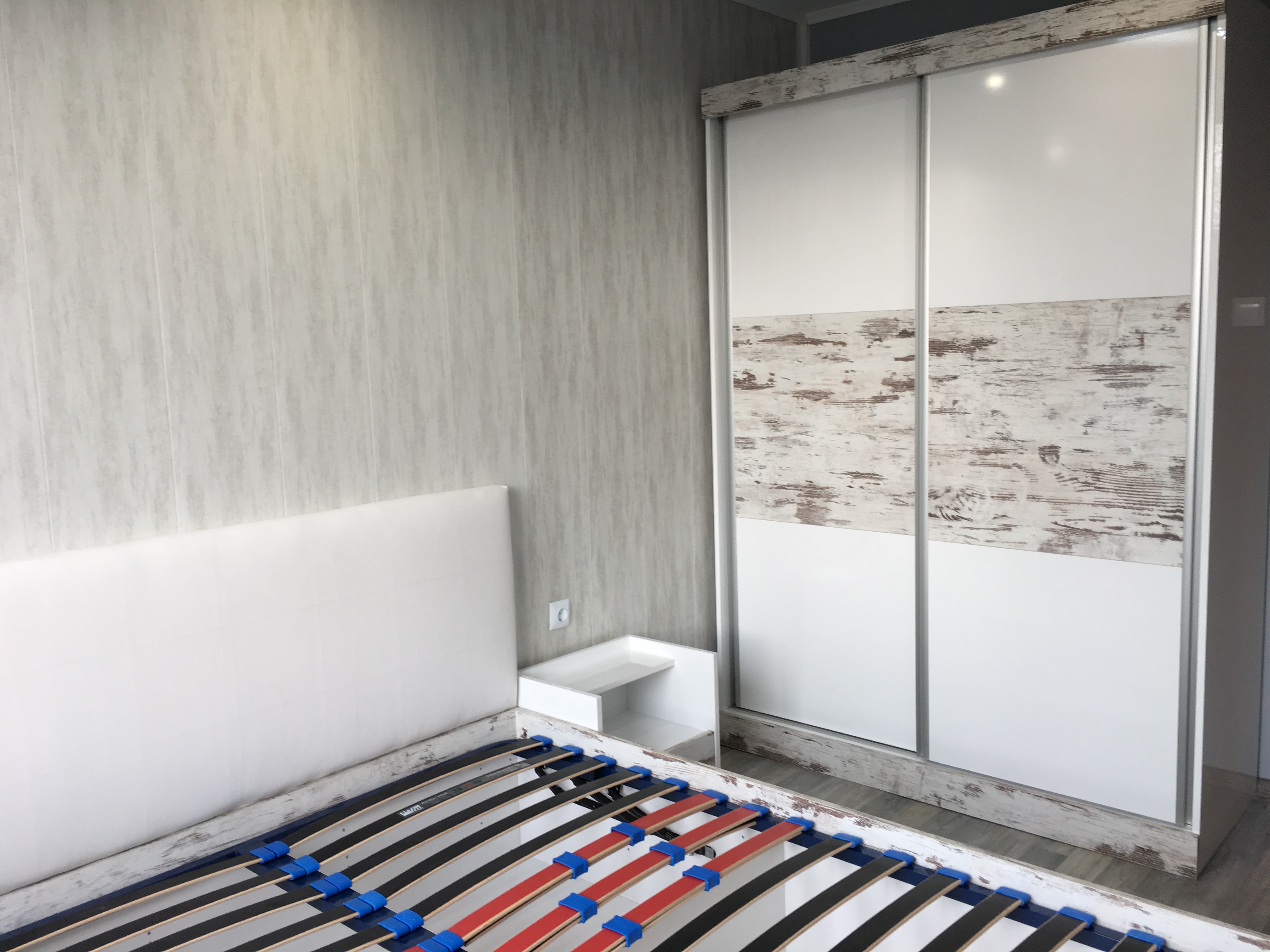 Спалня с бял гланц и старинно дърво