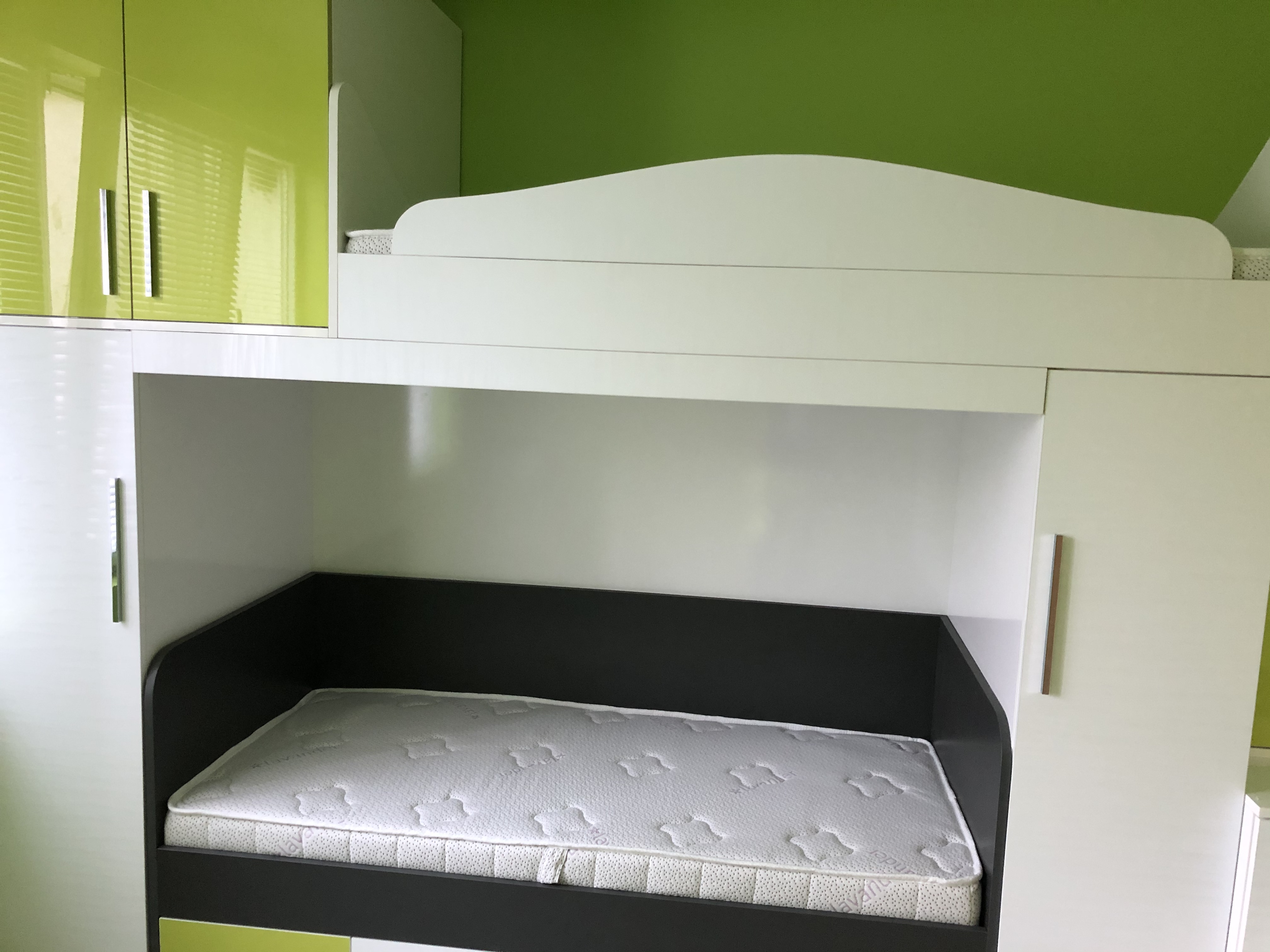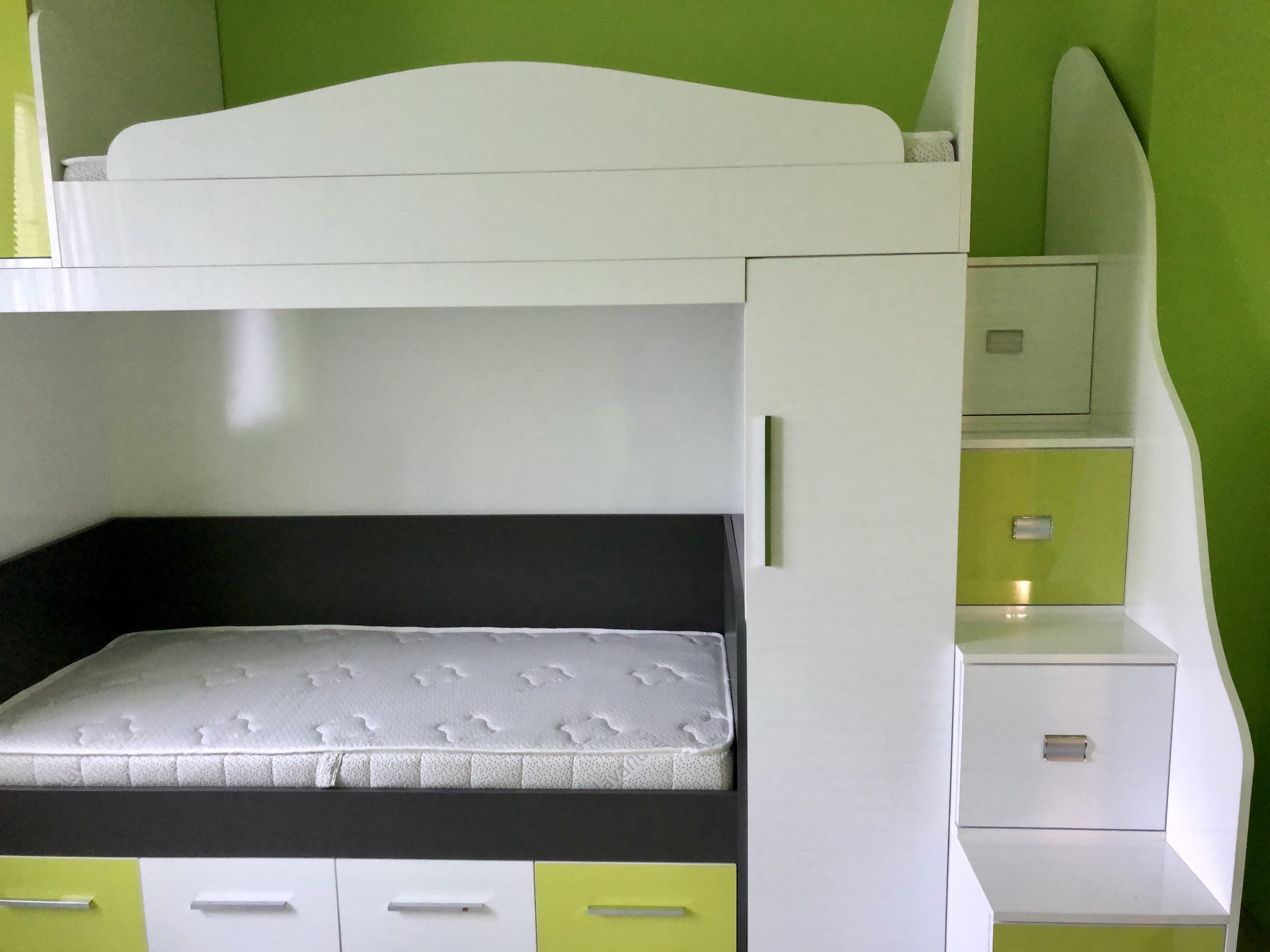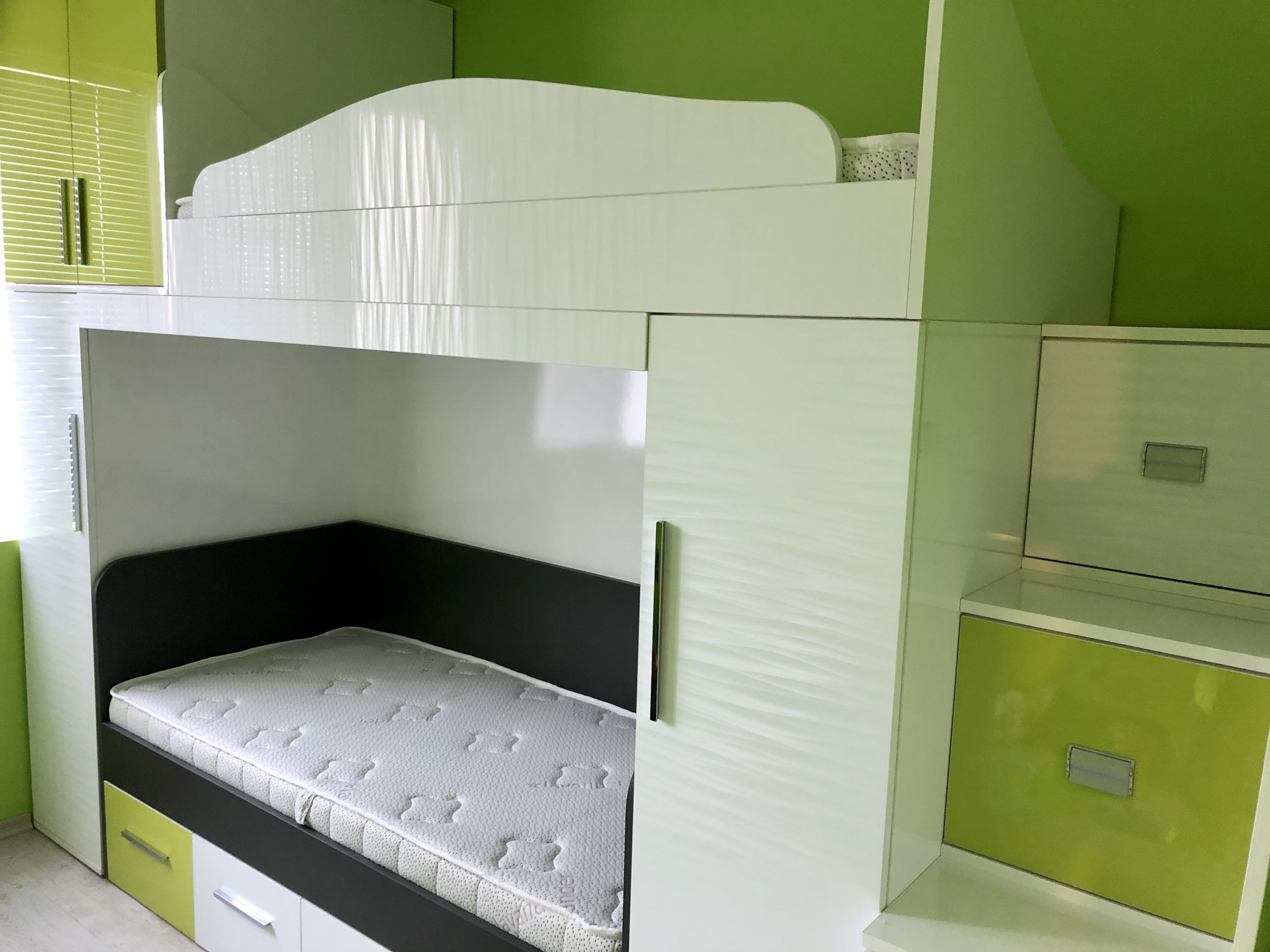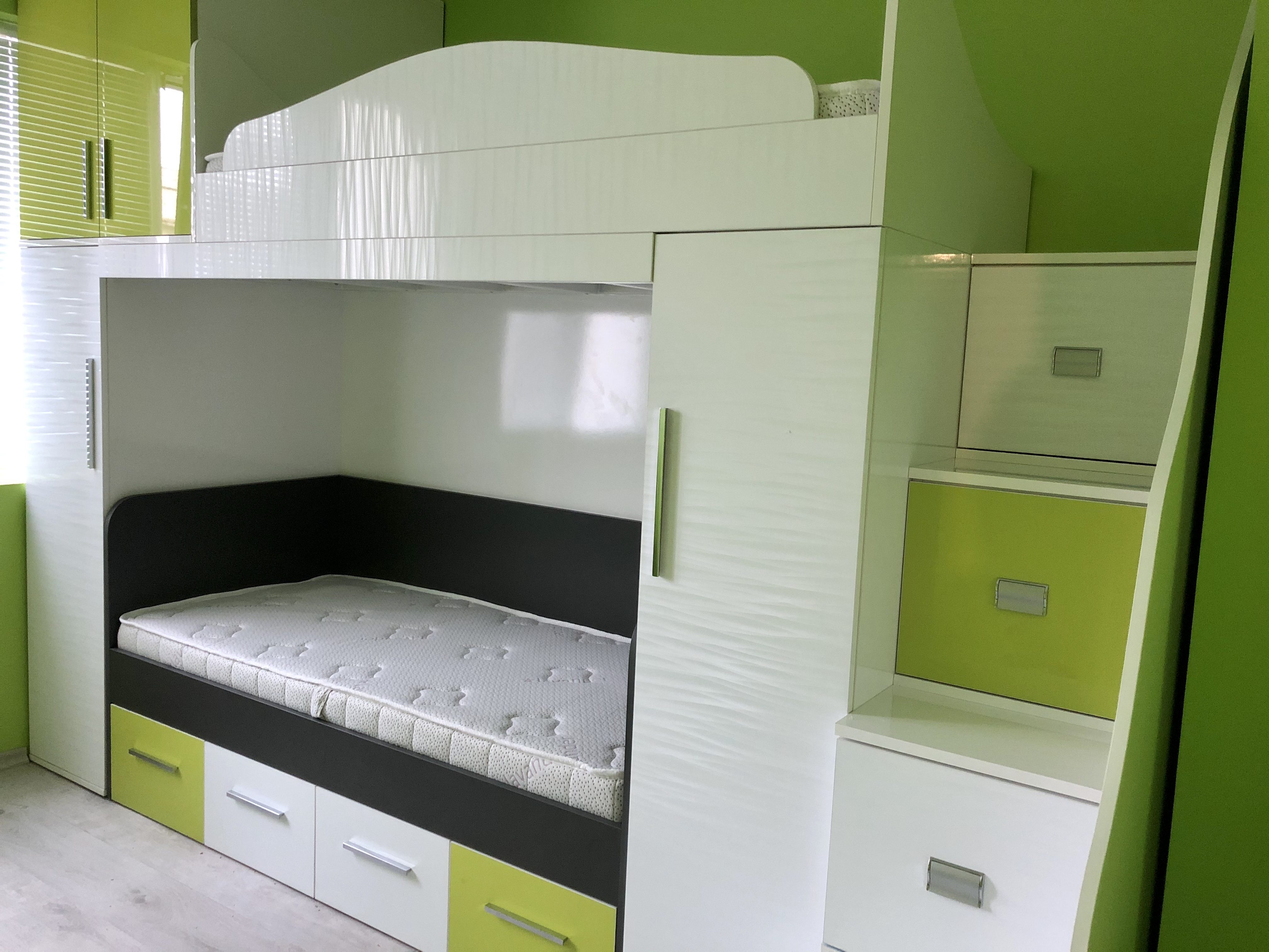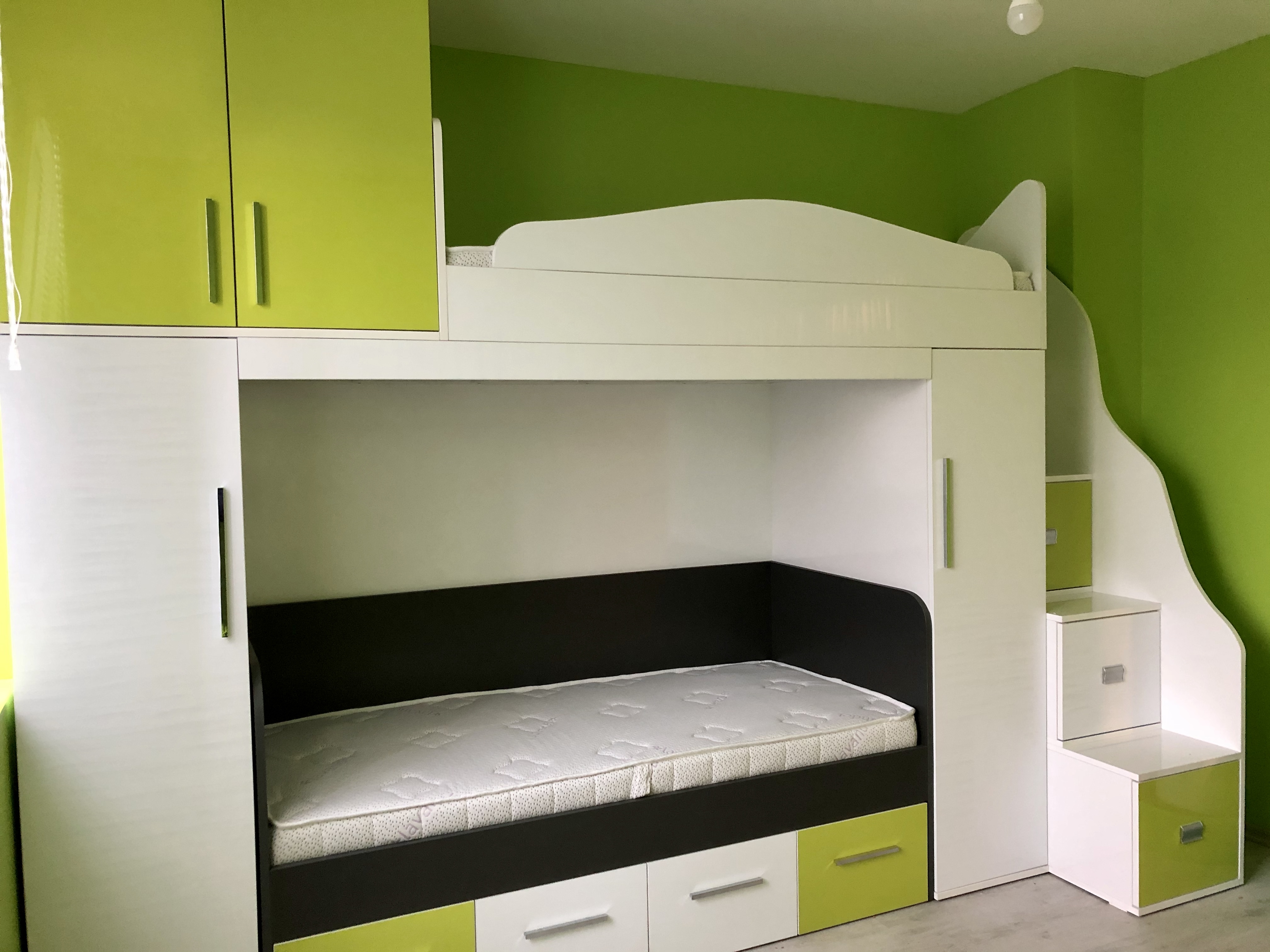 Двуетажно легло “Дани” направено от МДФ Сахара и сигнално зелено