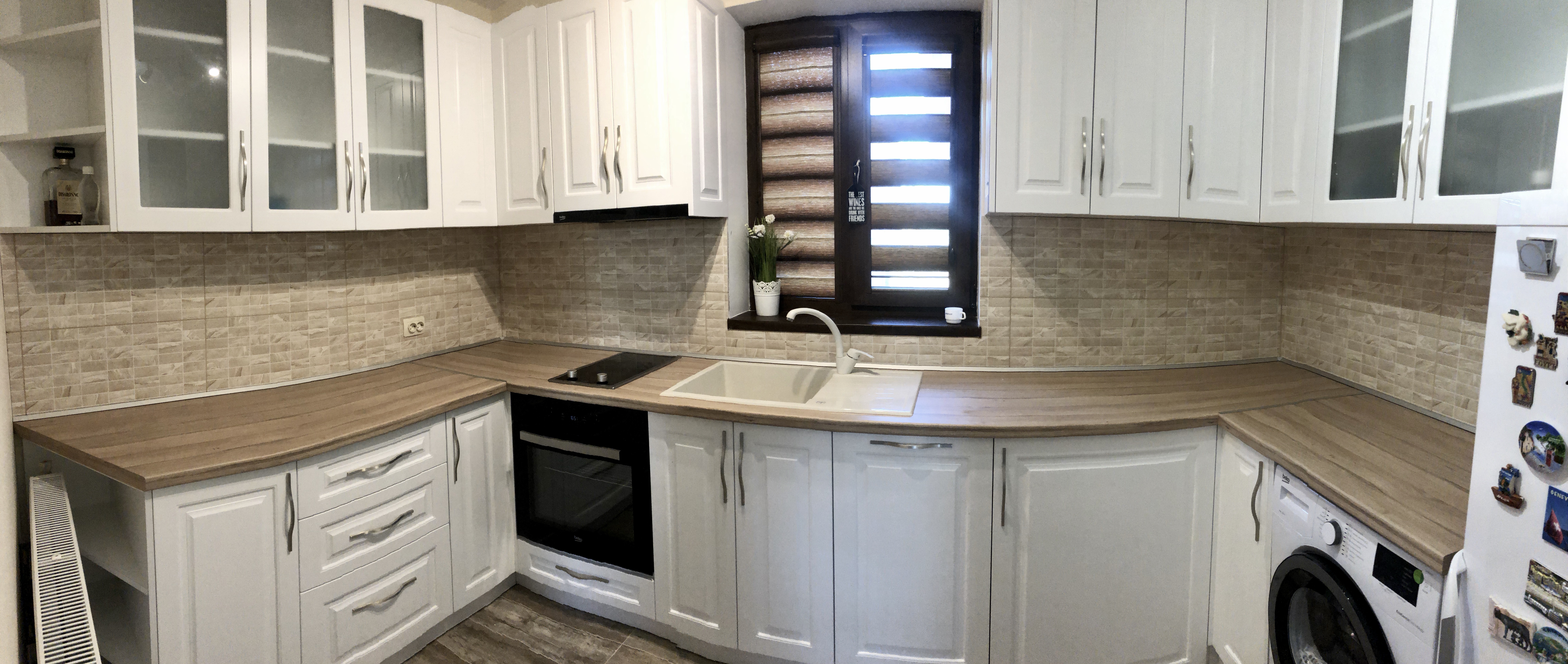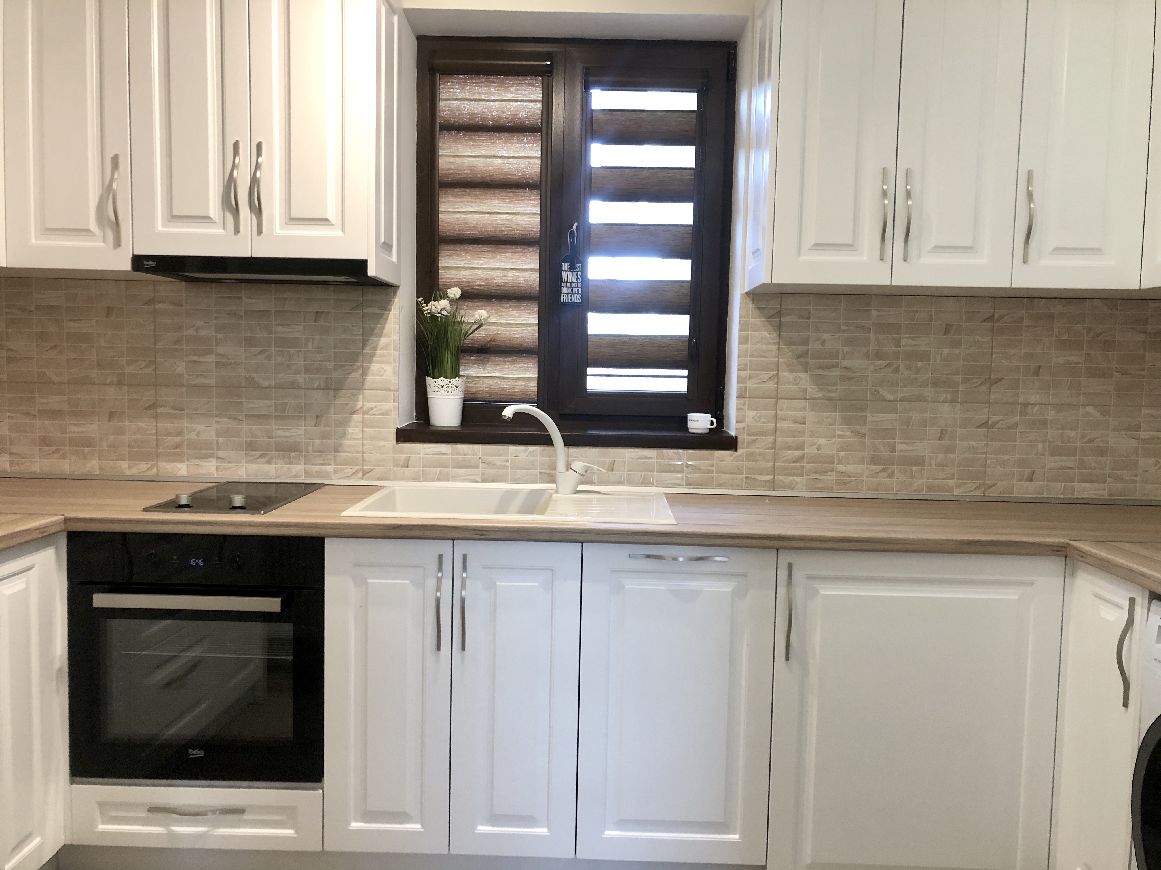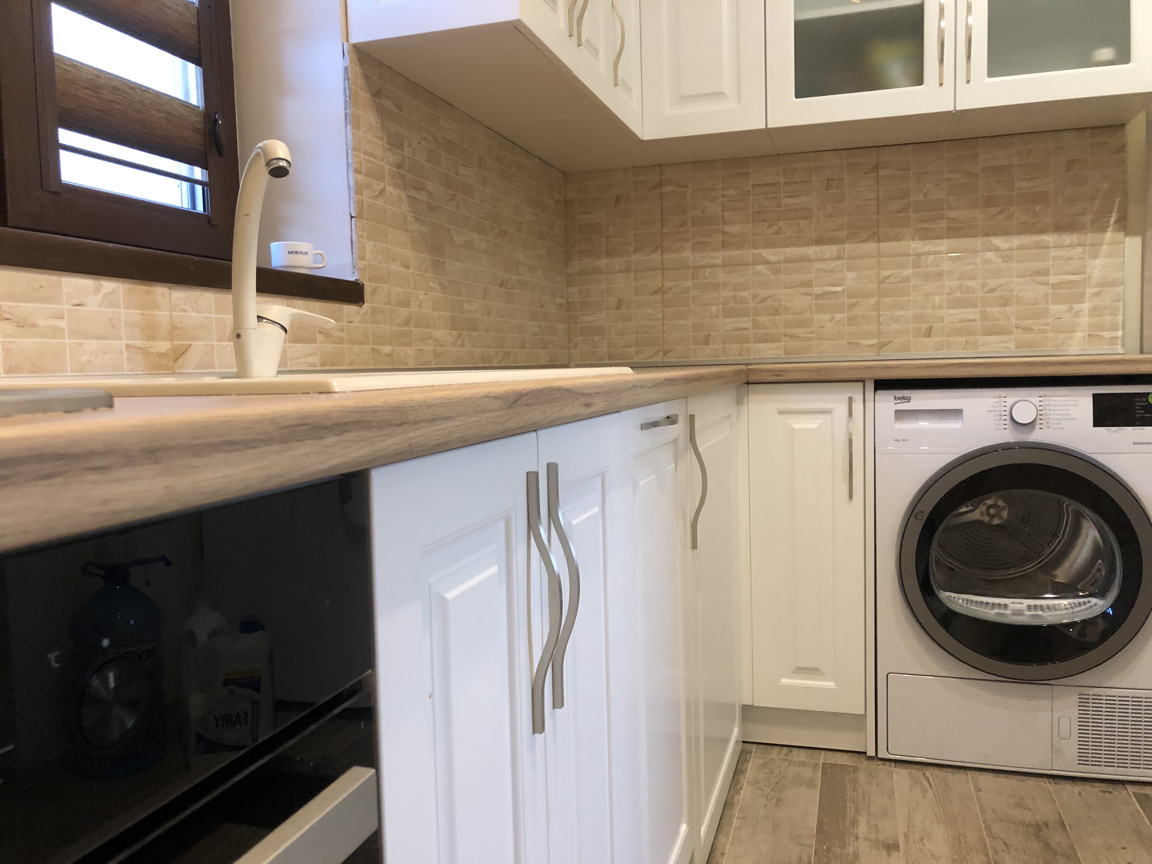 Стилна кухня направена да задоволи претенцийте на всяка домакиня. Изцяло ретро стил със вгредена миялна и перална машина.и перална