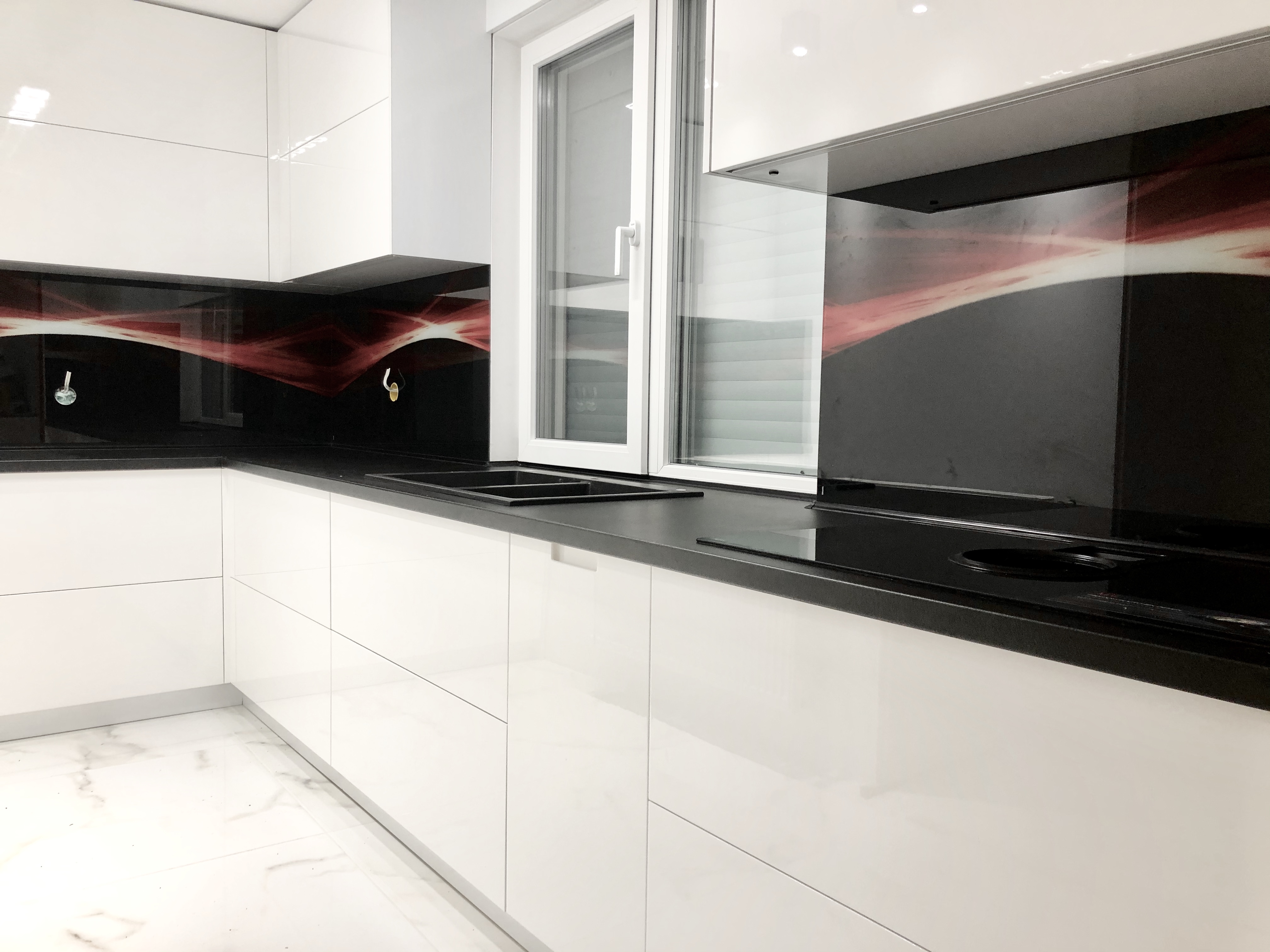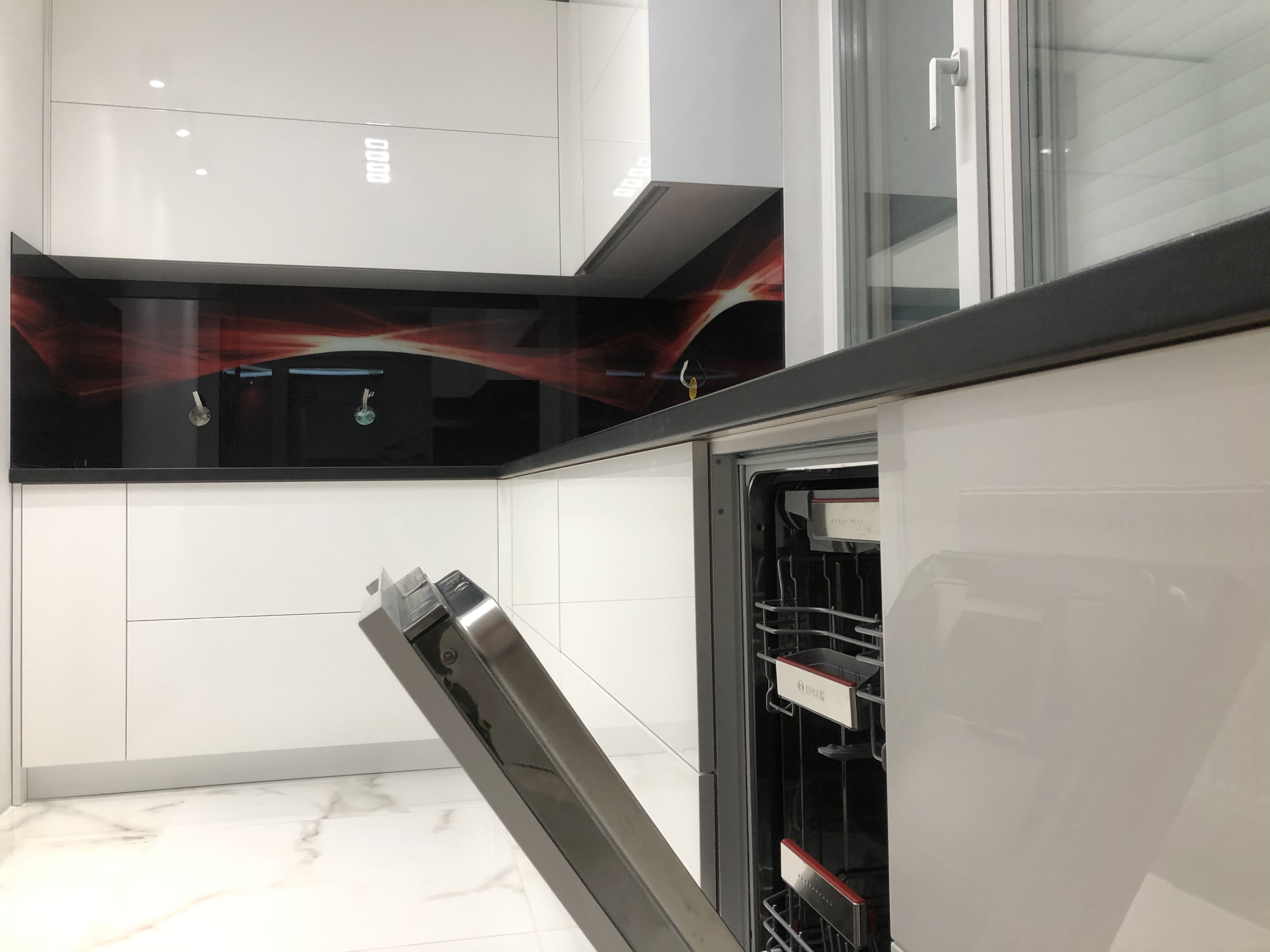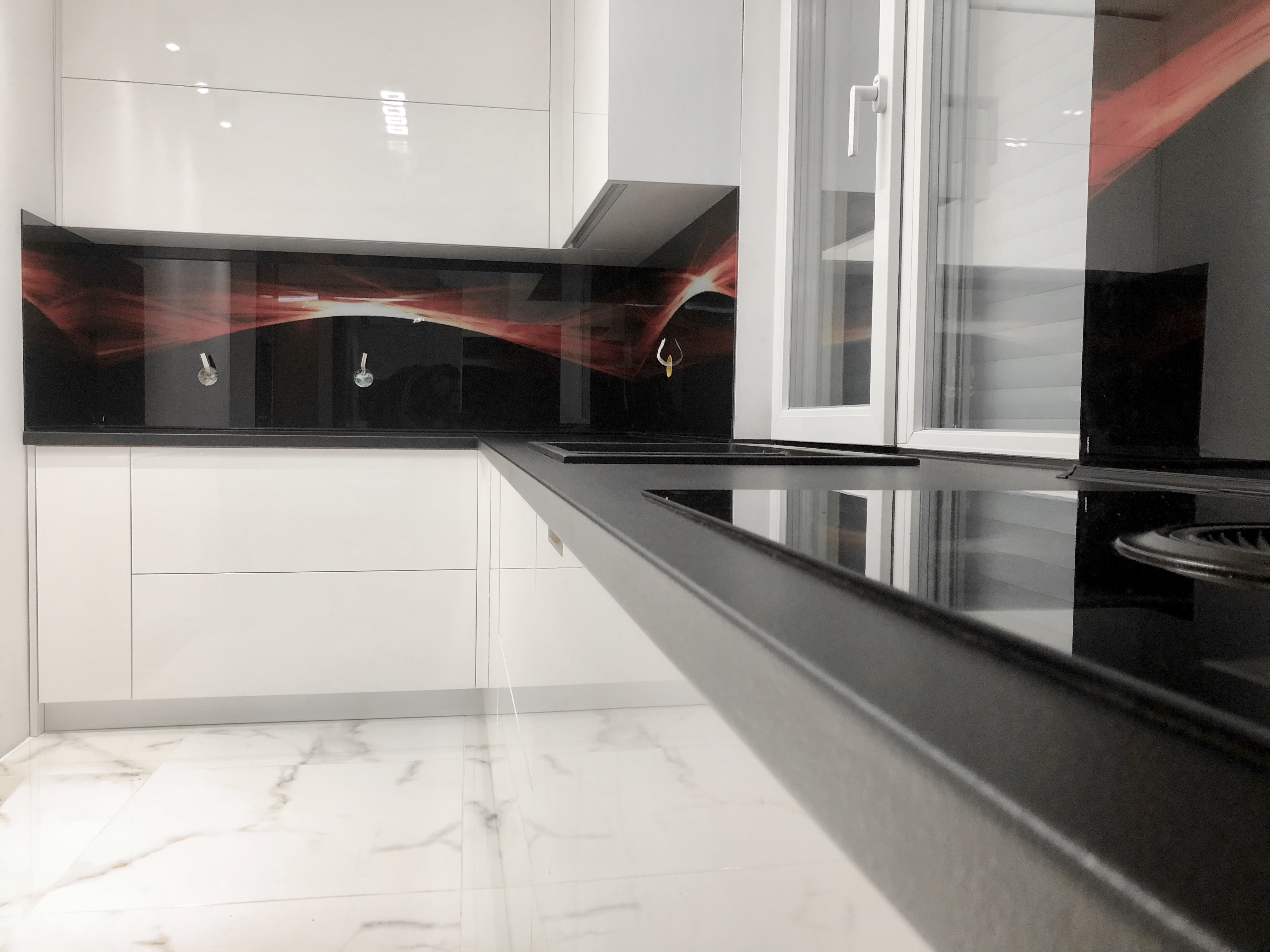 Кухня с боядисан МДФ,черен плот и пуш механизми с плавно прибиране на “Blum”