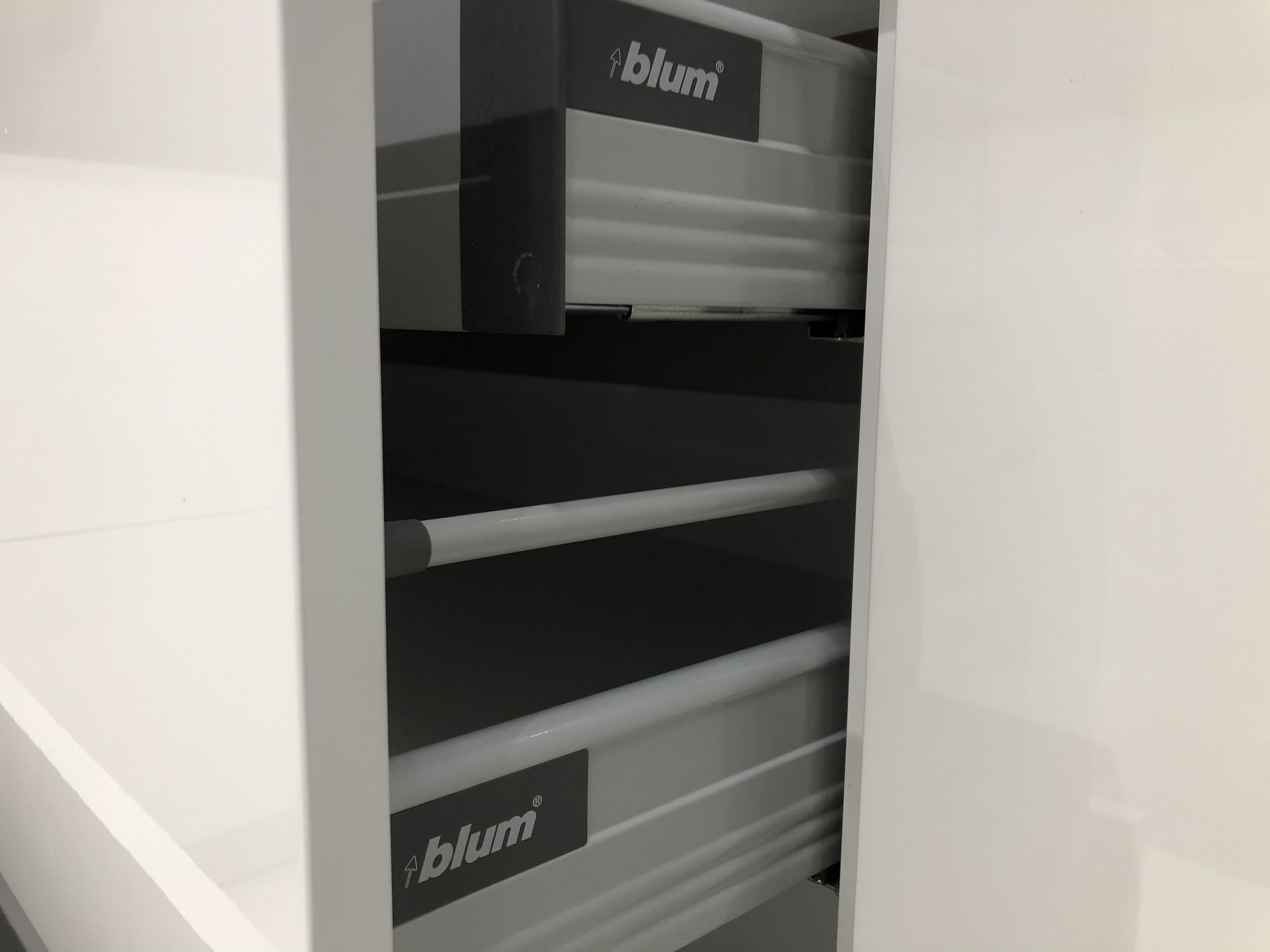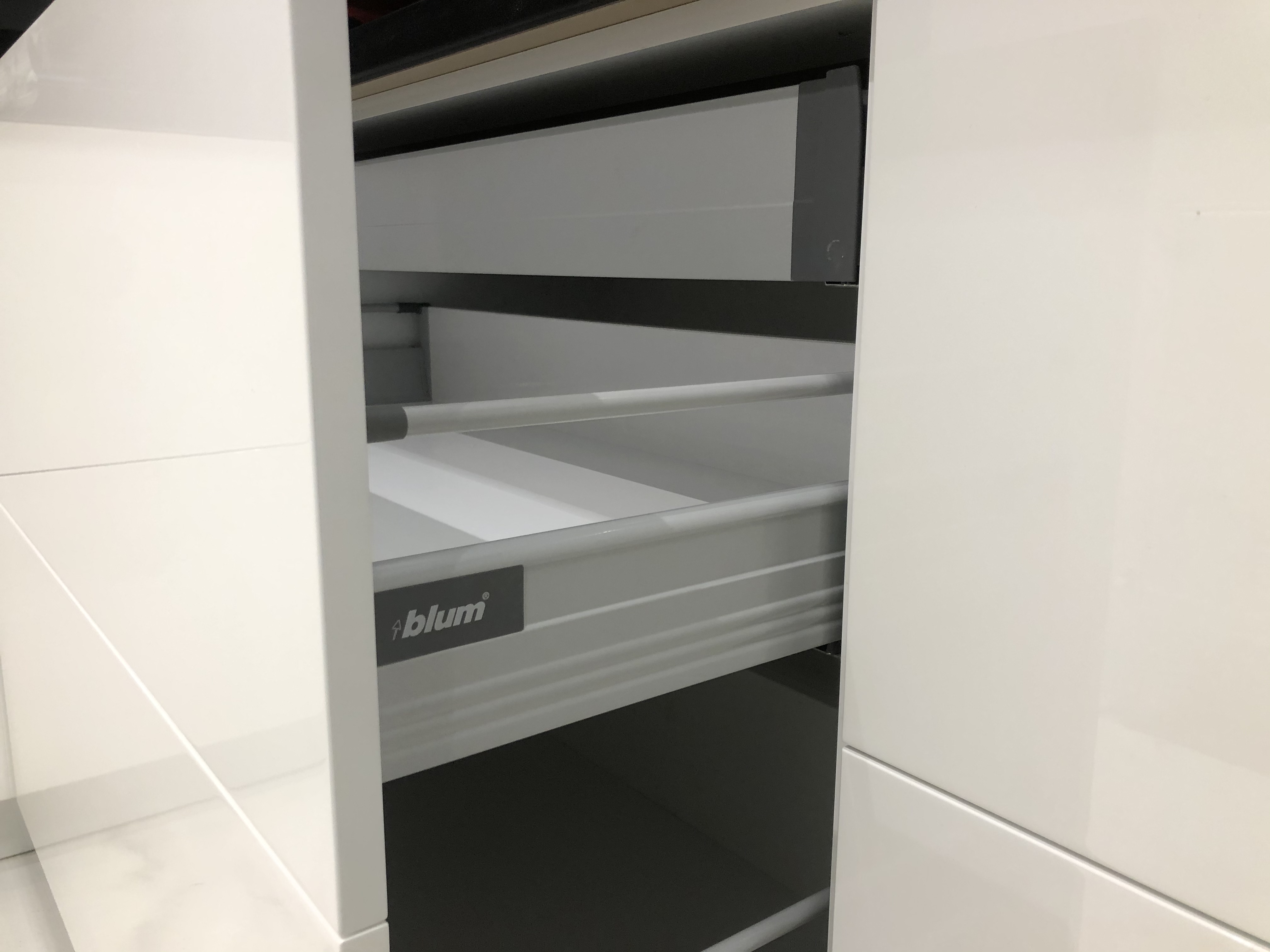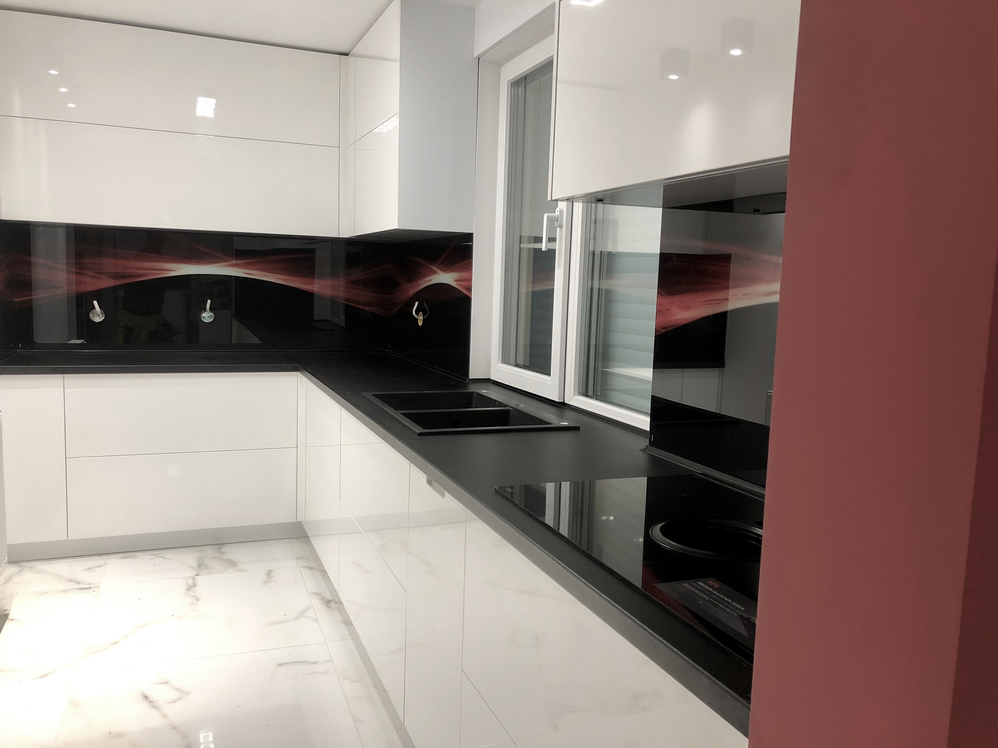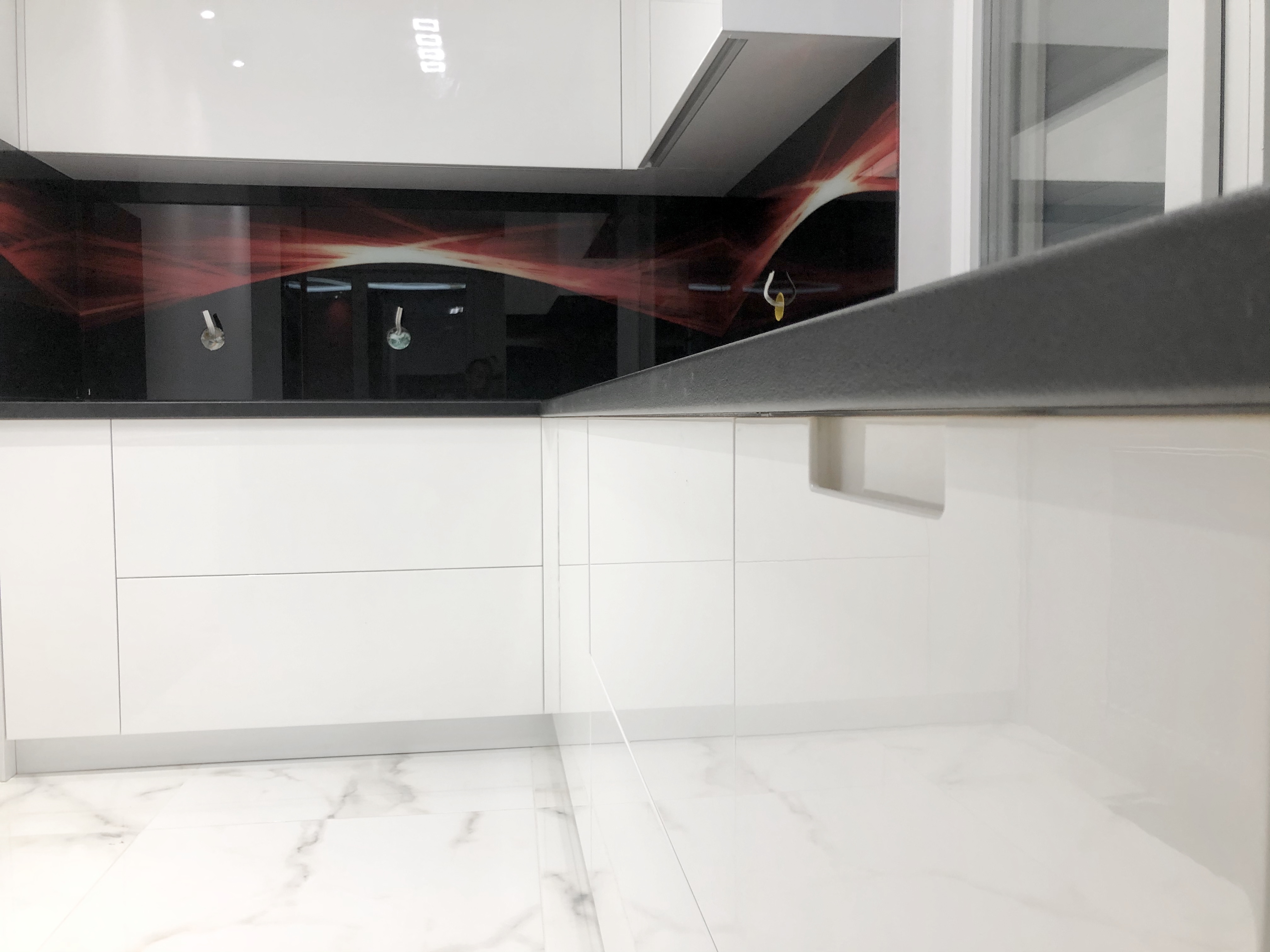Кухня с боядисан МДФ,черен плот и пуш механизми с плавно прибиране на “Blum”