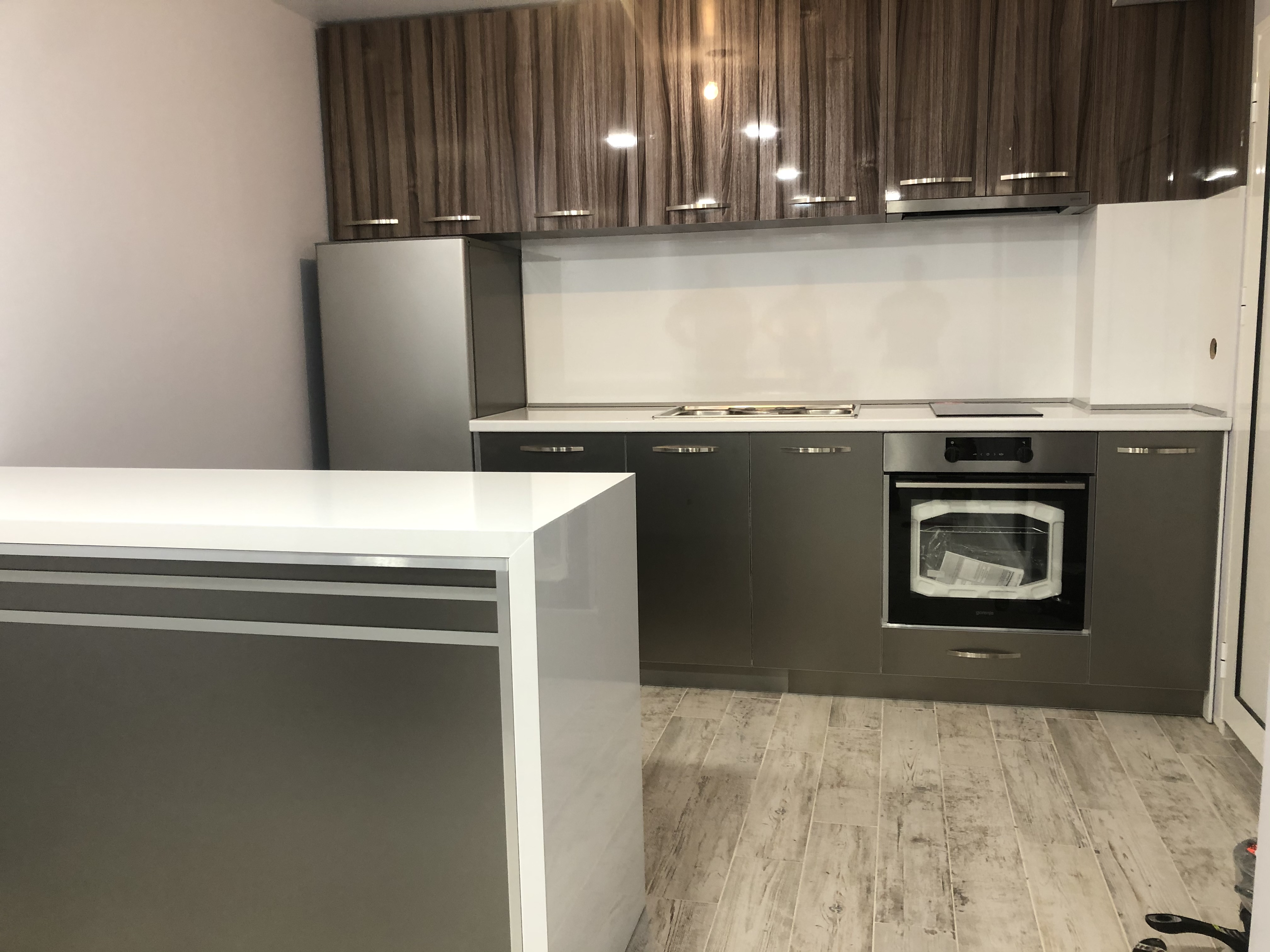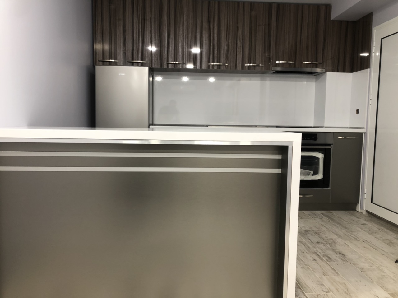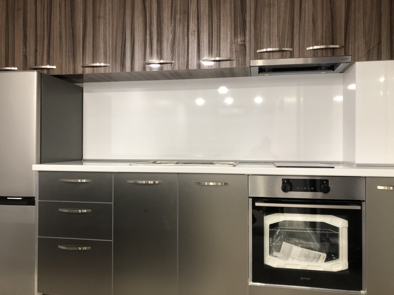 Комбинация на два цвята- инокс и дърво, в съчетание със бял плот гланц.