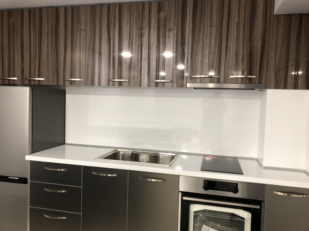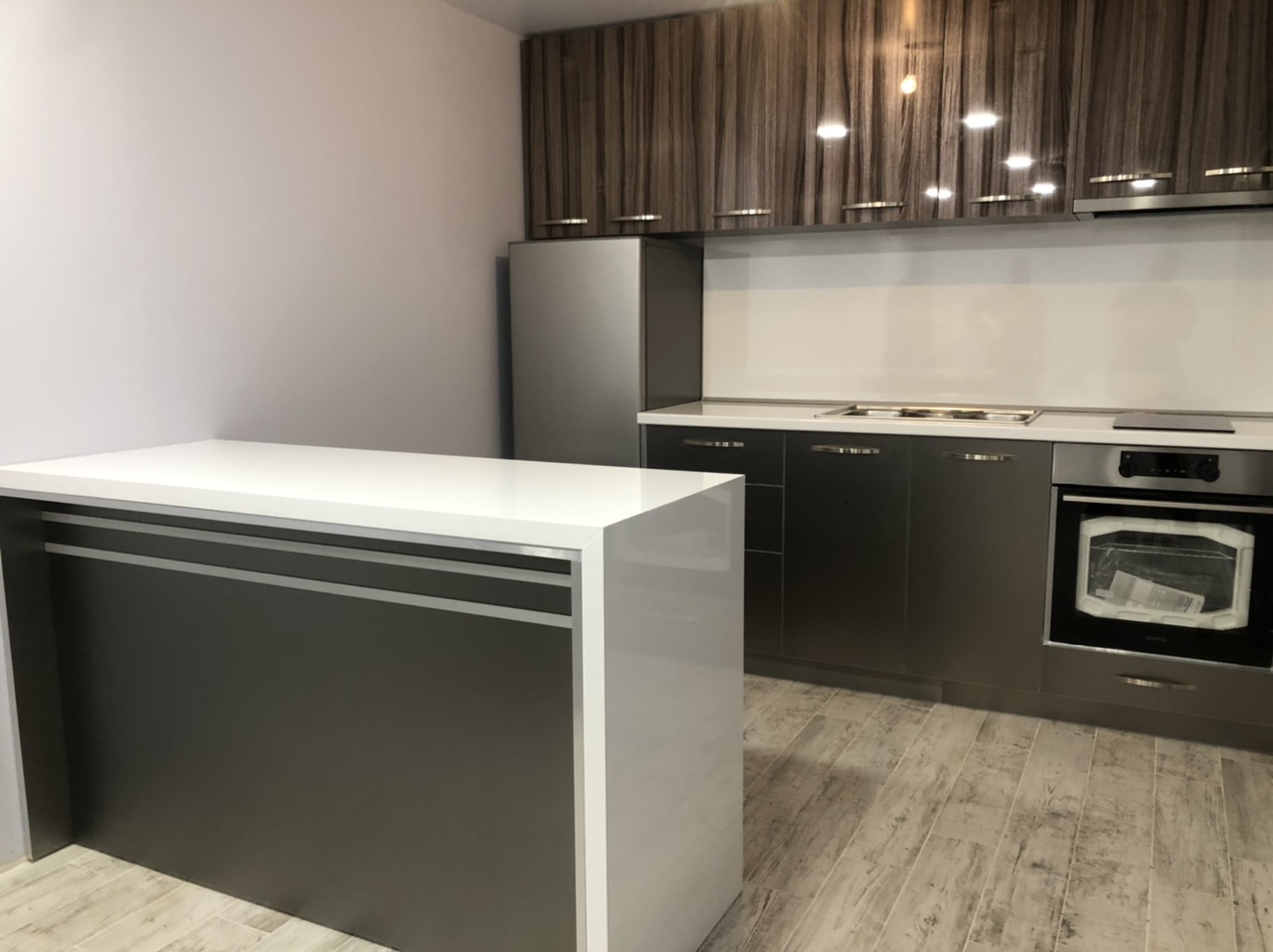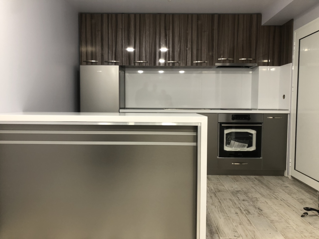 Комбинация на два цвята- инокс и дърво, в съчетание със бял плот гланц.