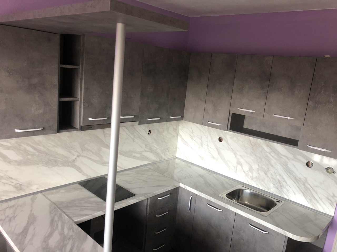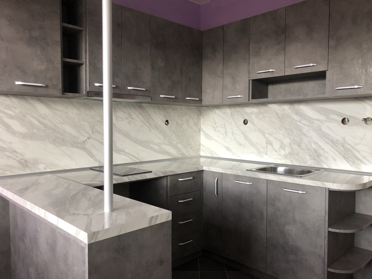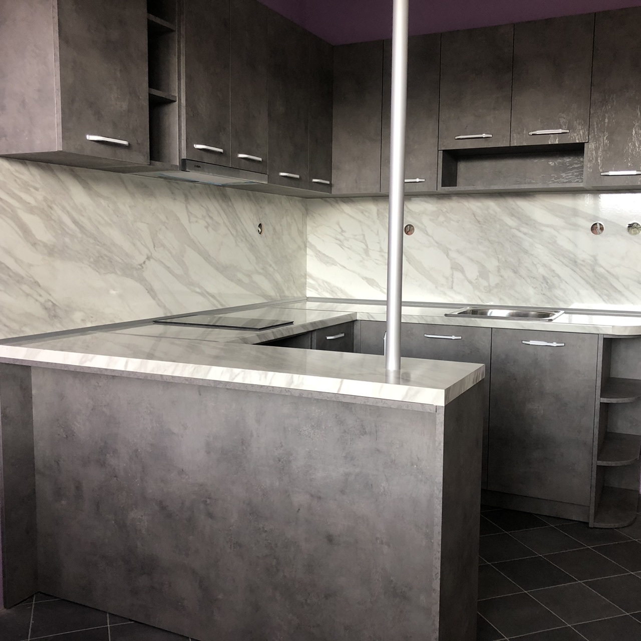Кухня от ЛПДЧ с цвят от сив бетон в комбинация с бял мрамор гланц