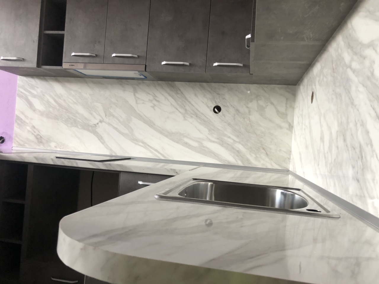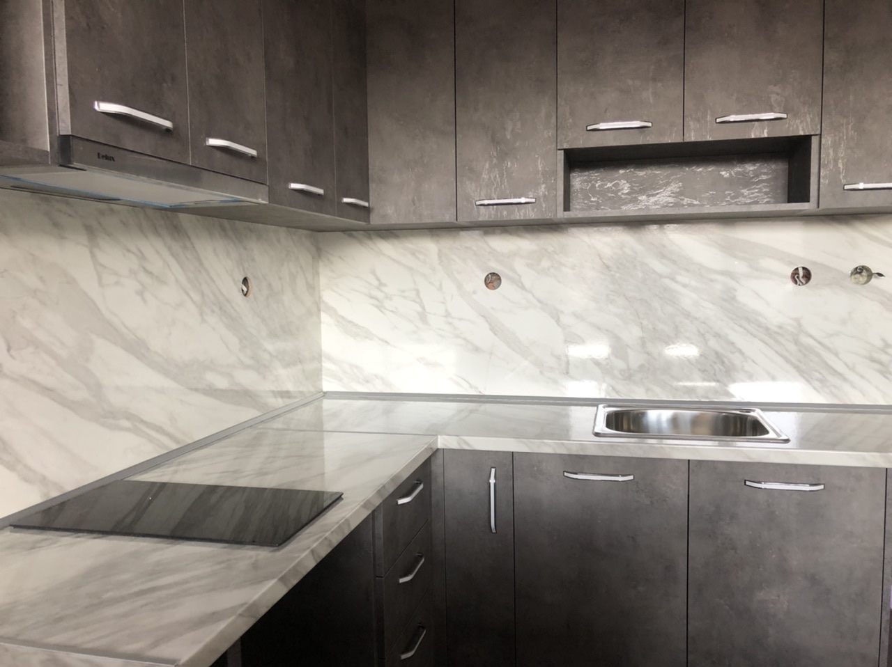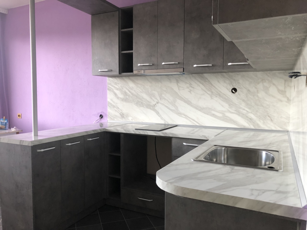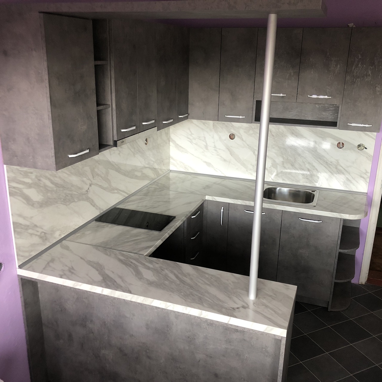 Кухня от ЛПДЧ с цвят от сив бетон в комбинация с бял мрамор гланц