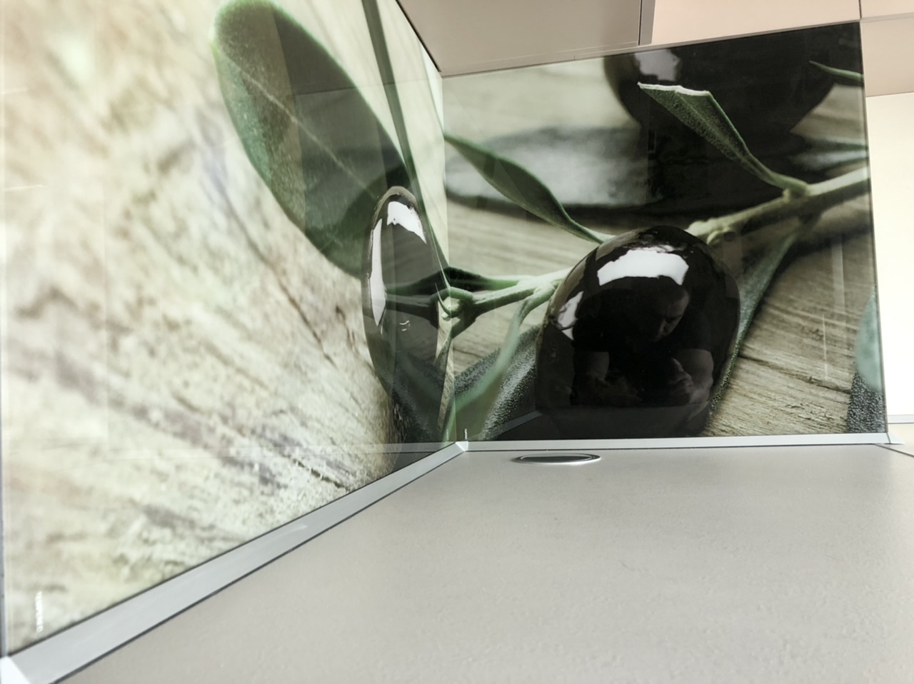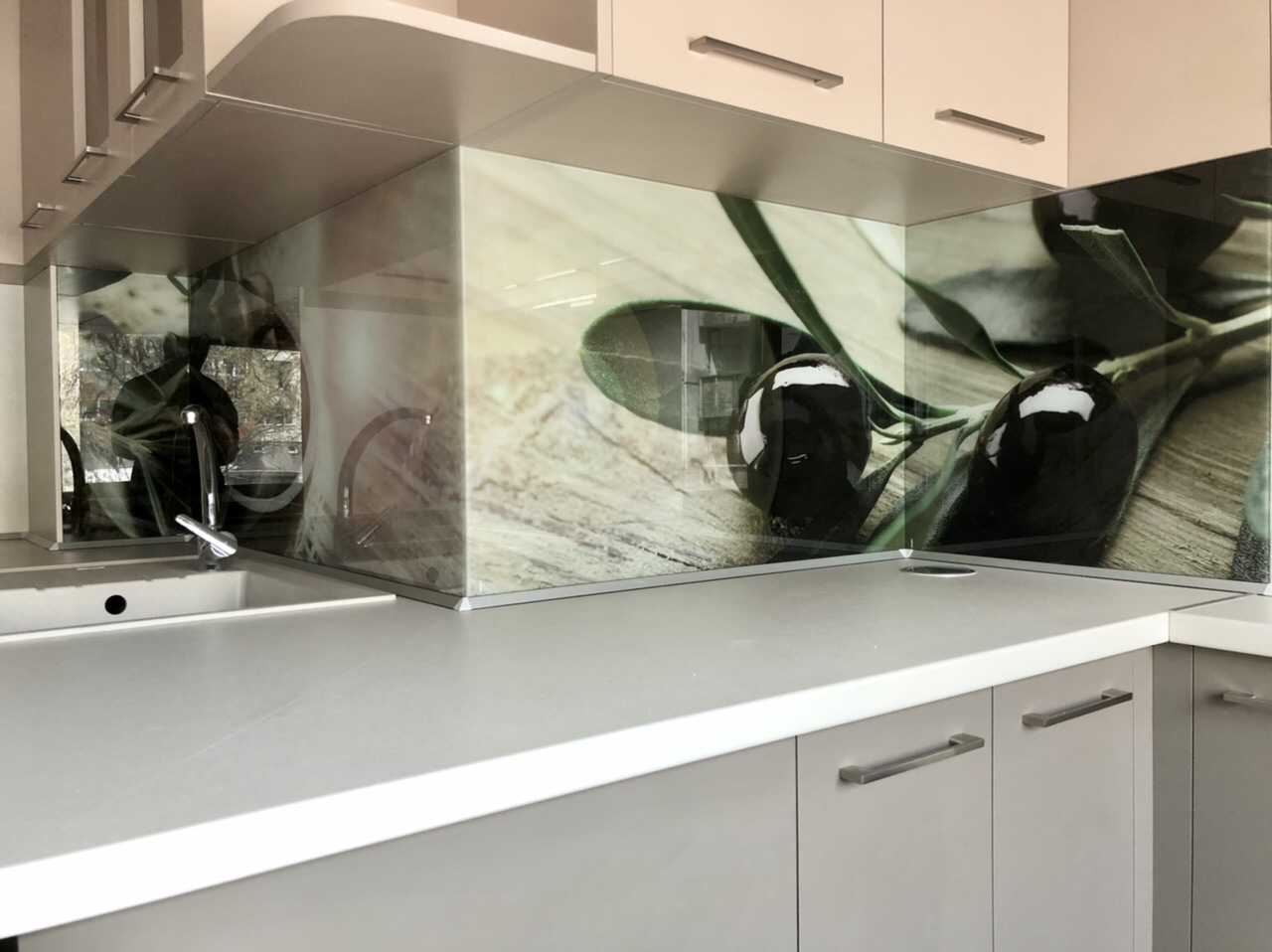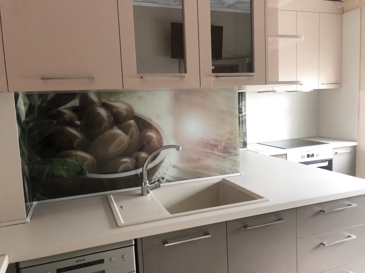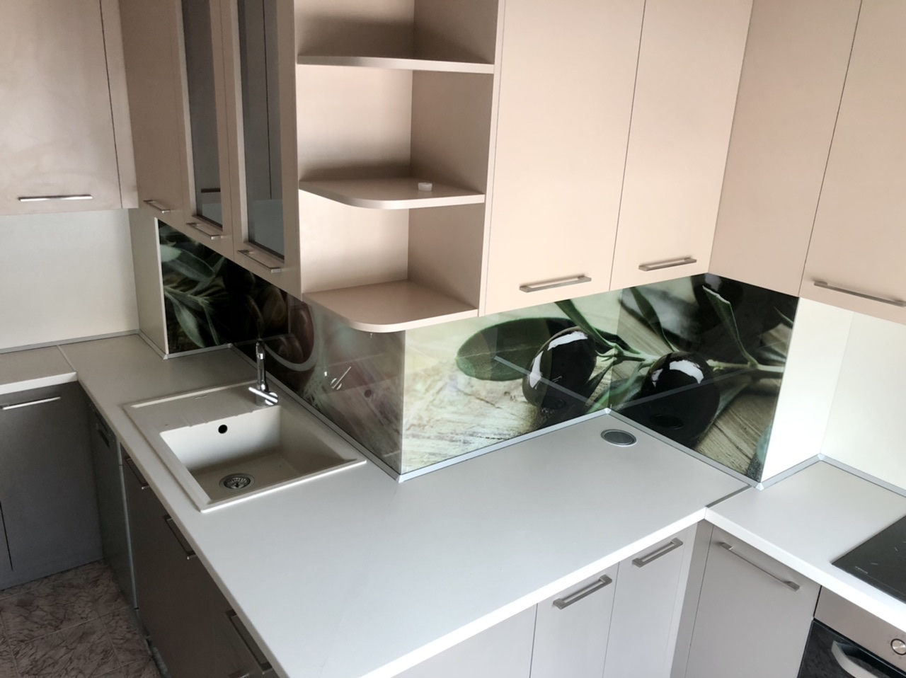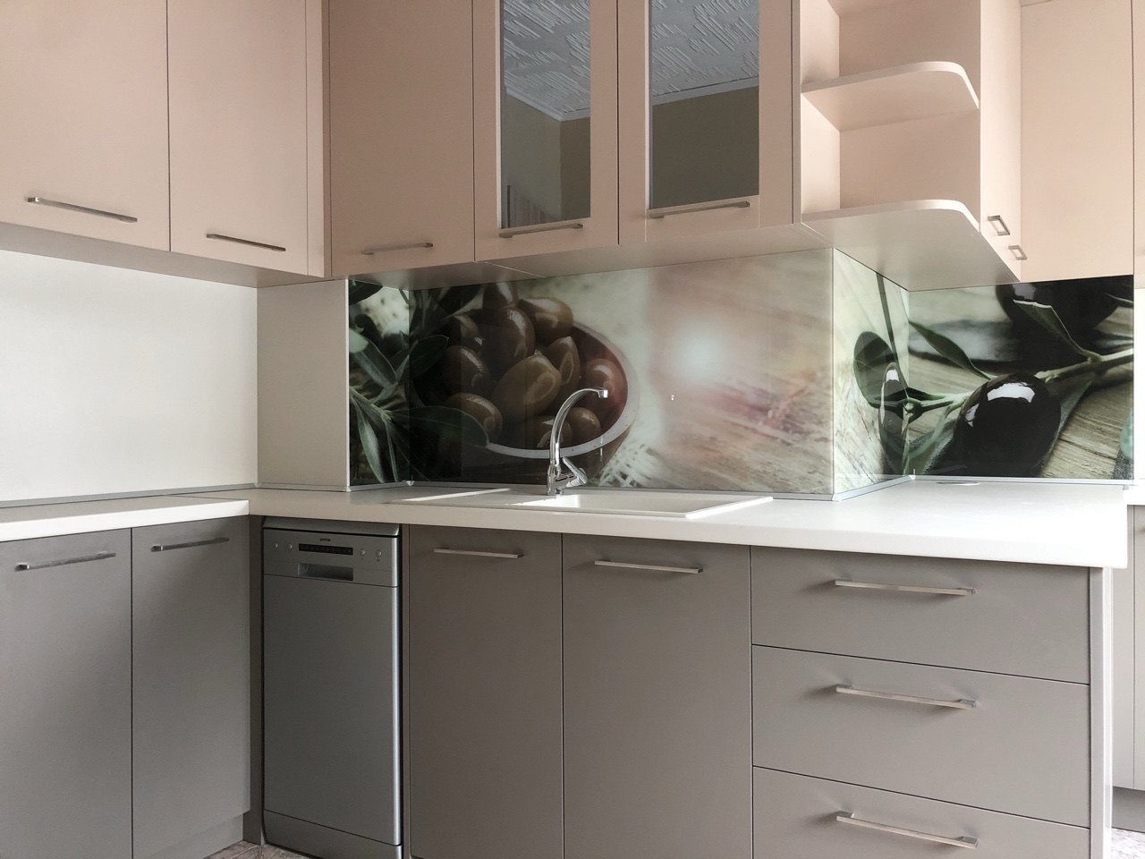 Кухня в комбинация от два цвята ЛПДЧ и стъкло маслина