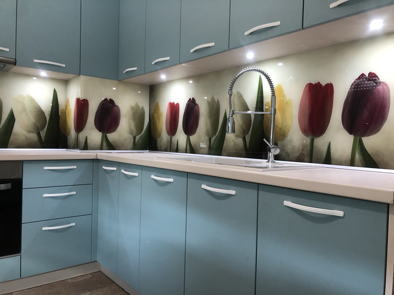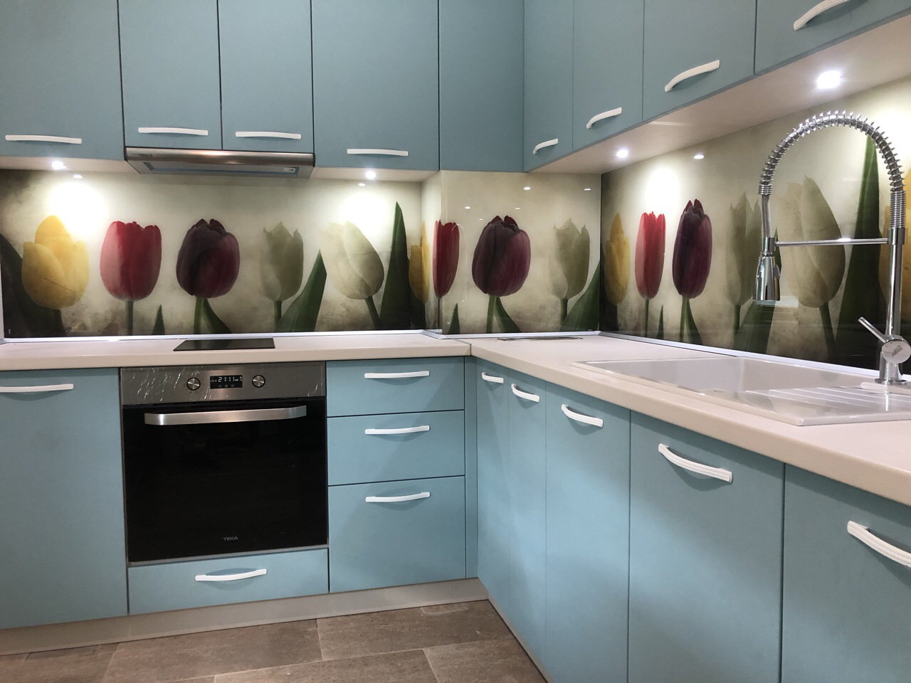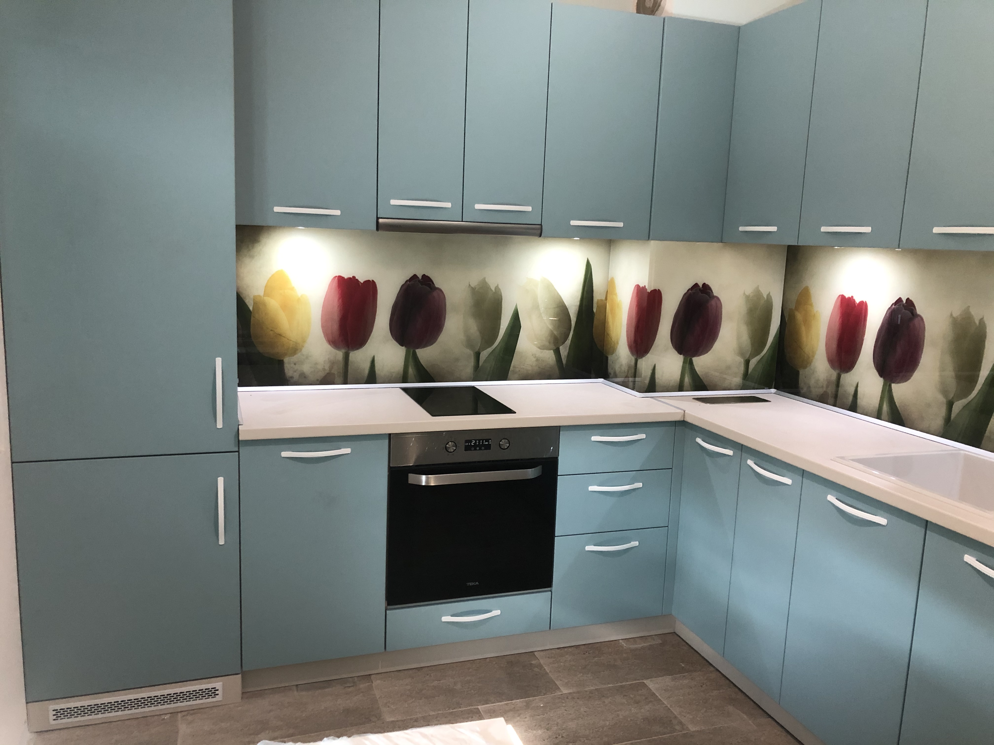 Кухня “ Синя Магия” от син МДФ и принт стъкло с лалета. Създадена за една много добра домашна атмосфера.