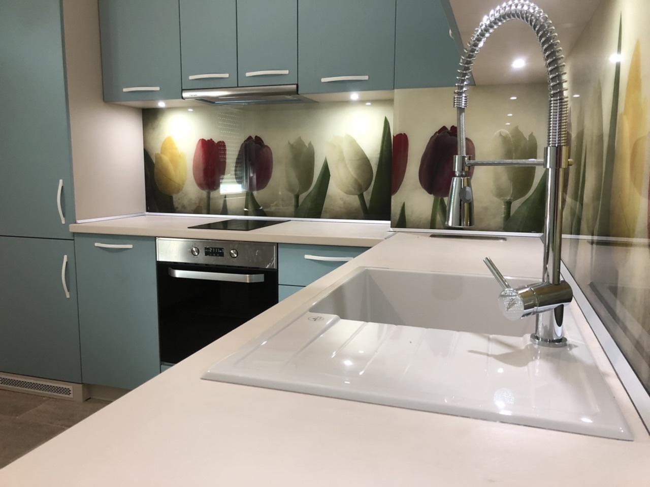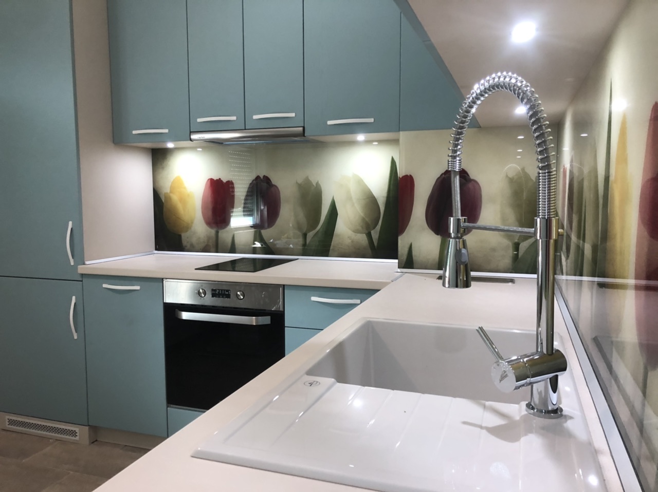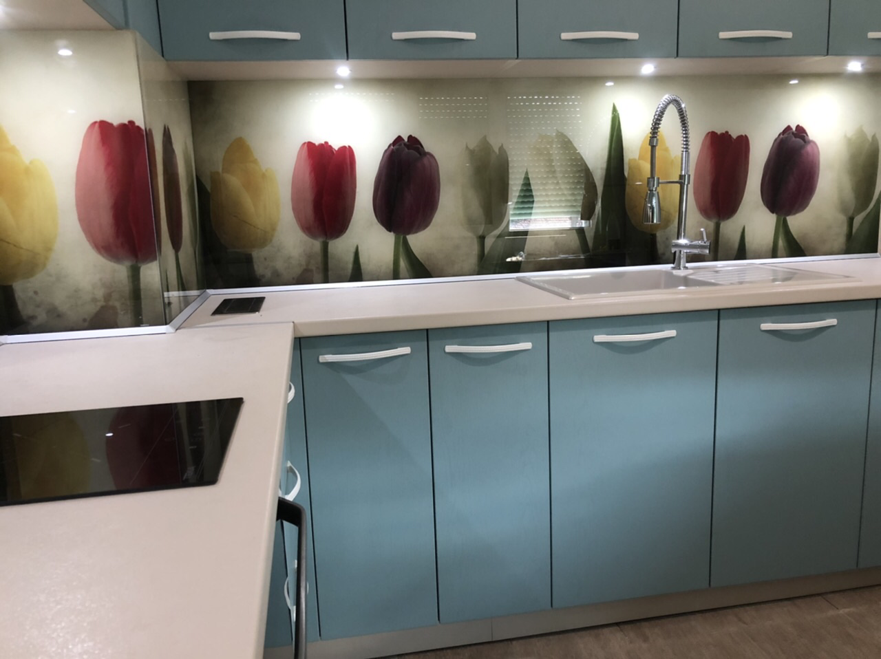 Кухня “ Синя Магия” от син МДФ и принт стъкло с лалета. Създадена за една много добра домашна атмосфера.