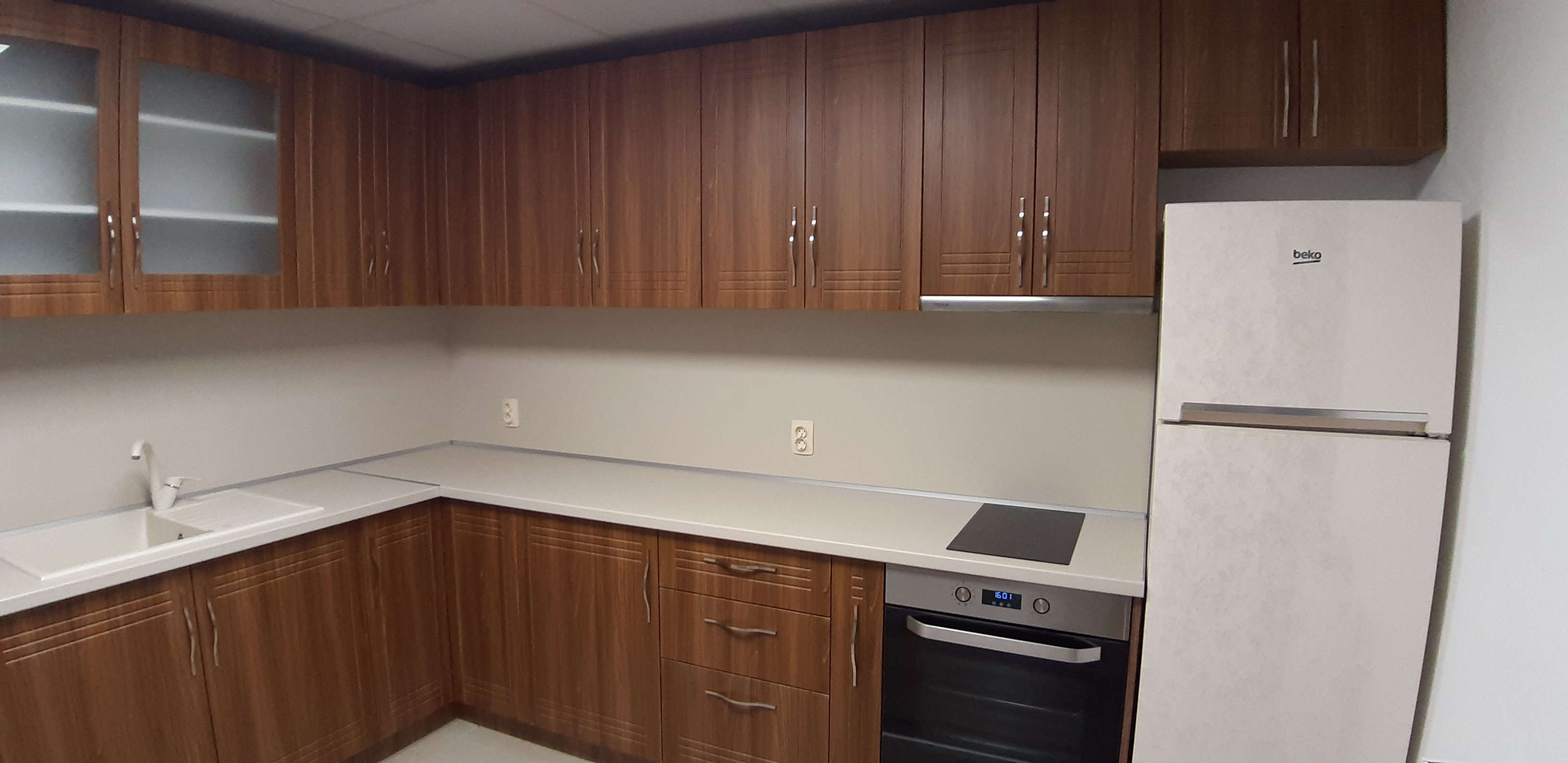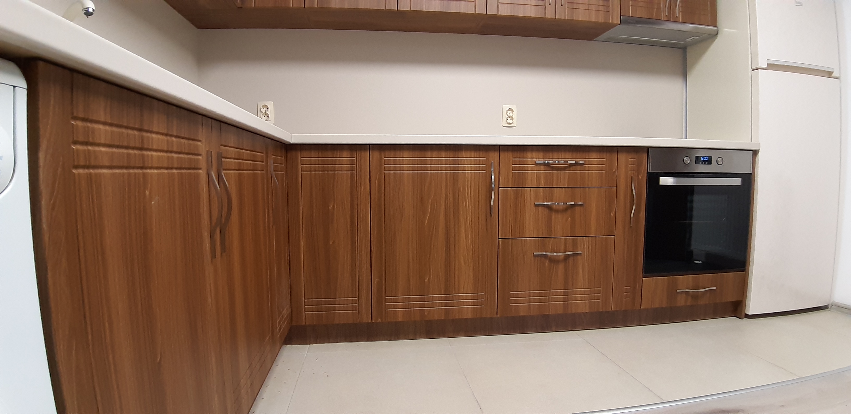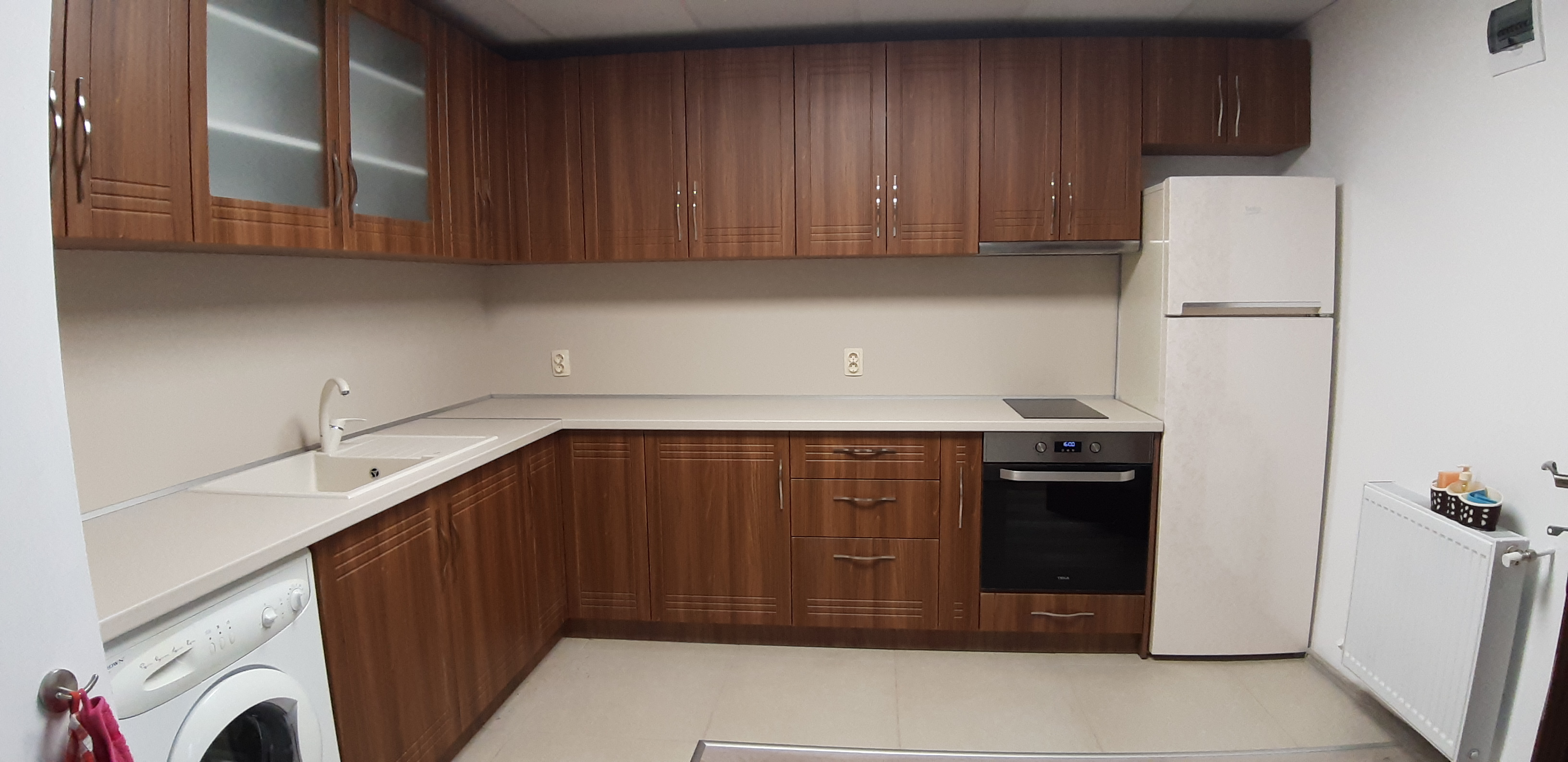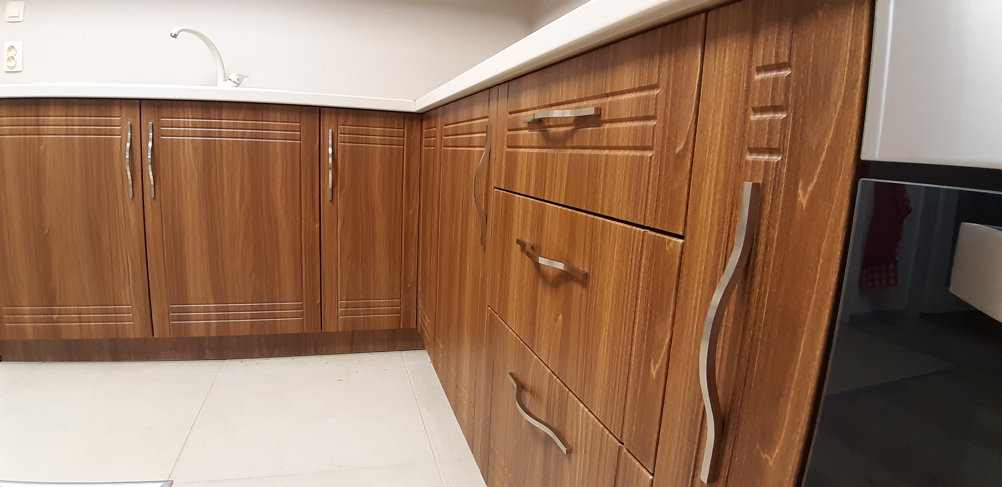 Кухня с релефни вратички МДФ и светъл плоте с керамична мивка