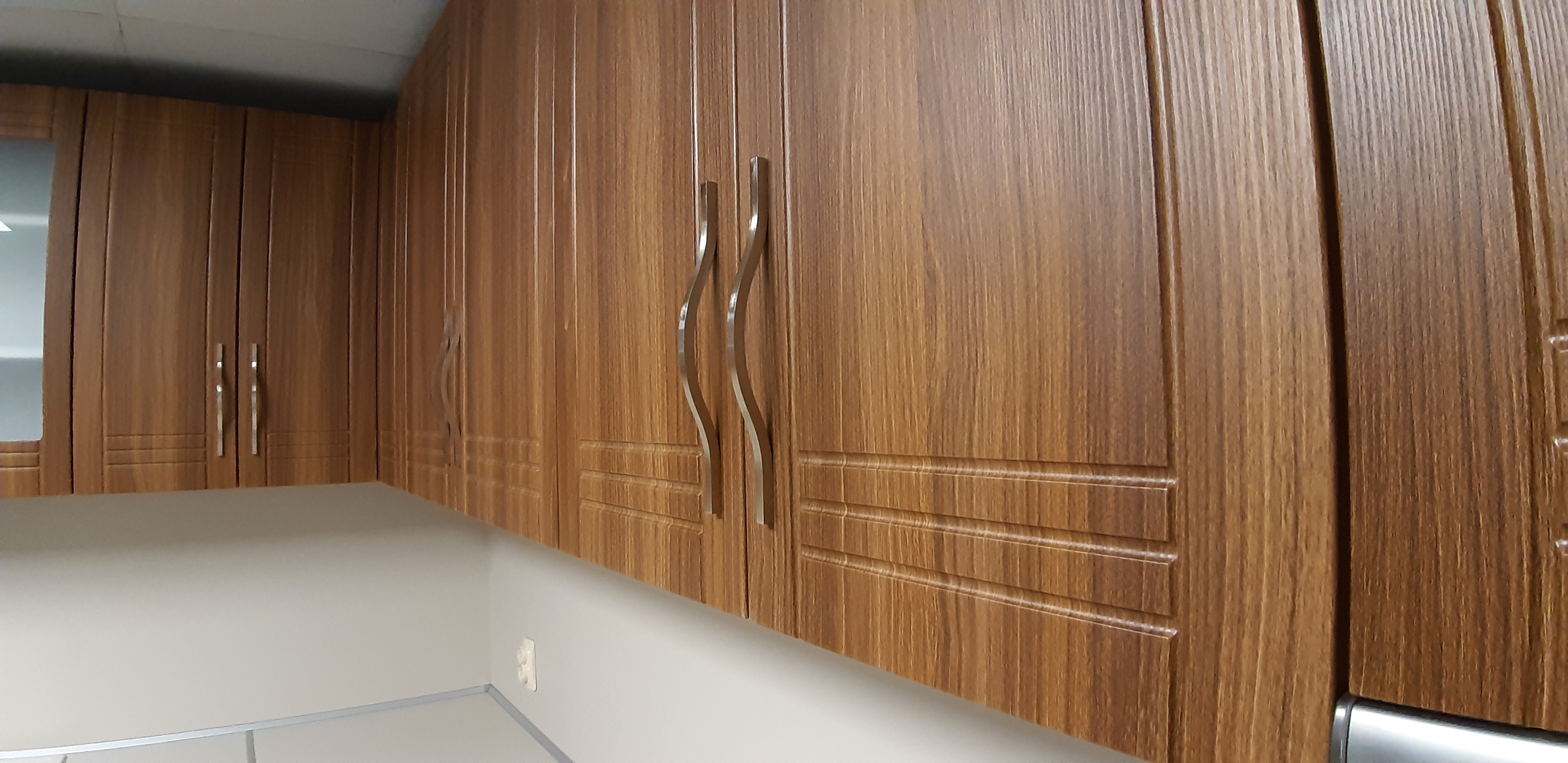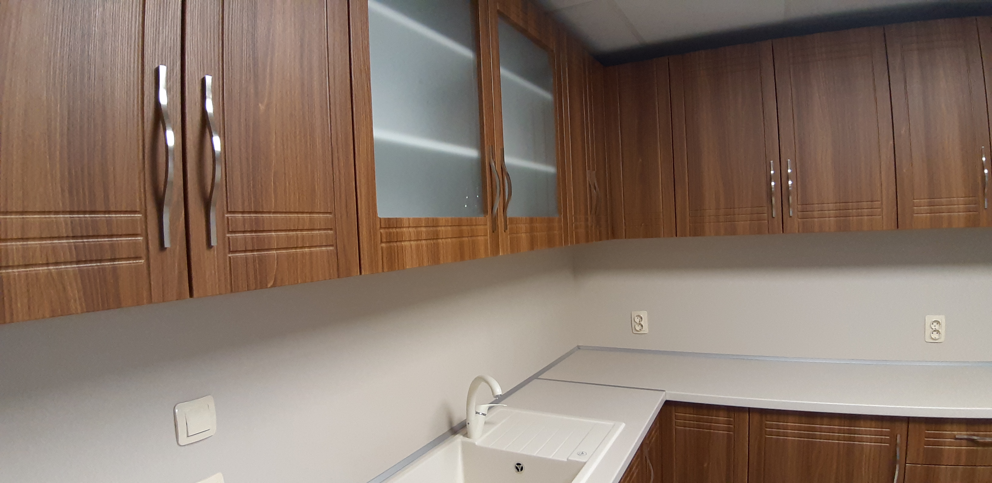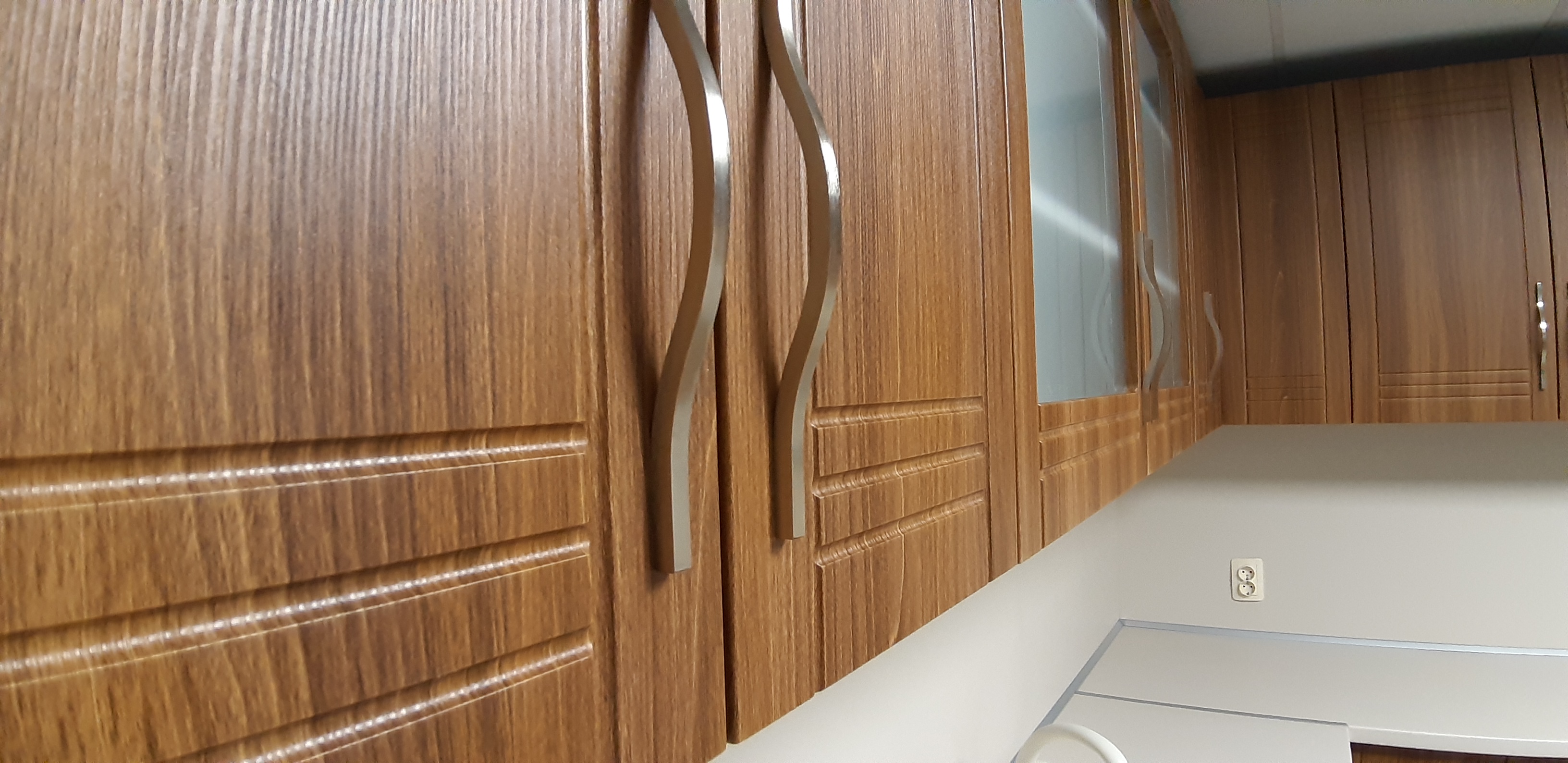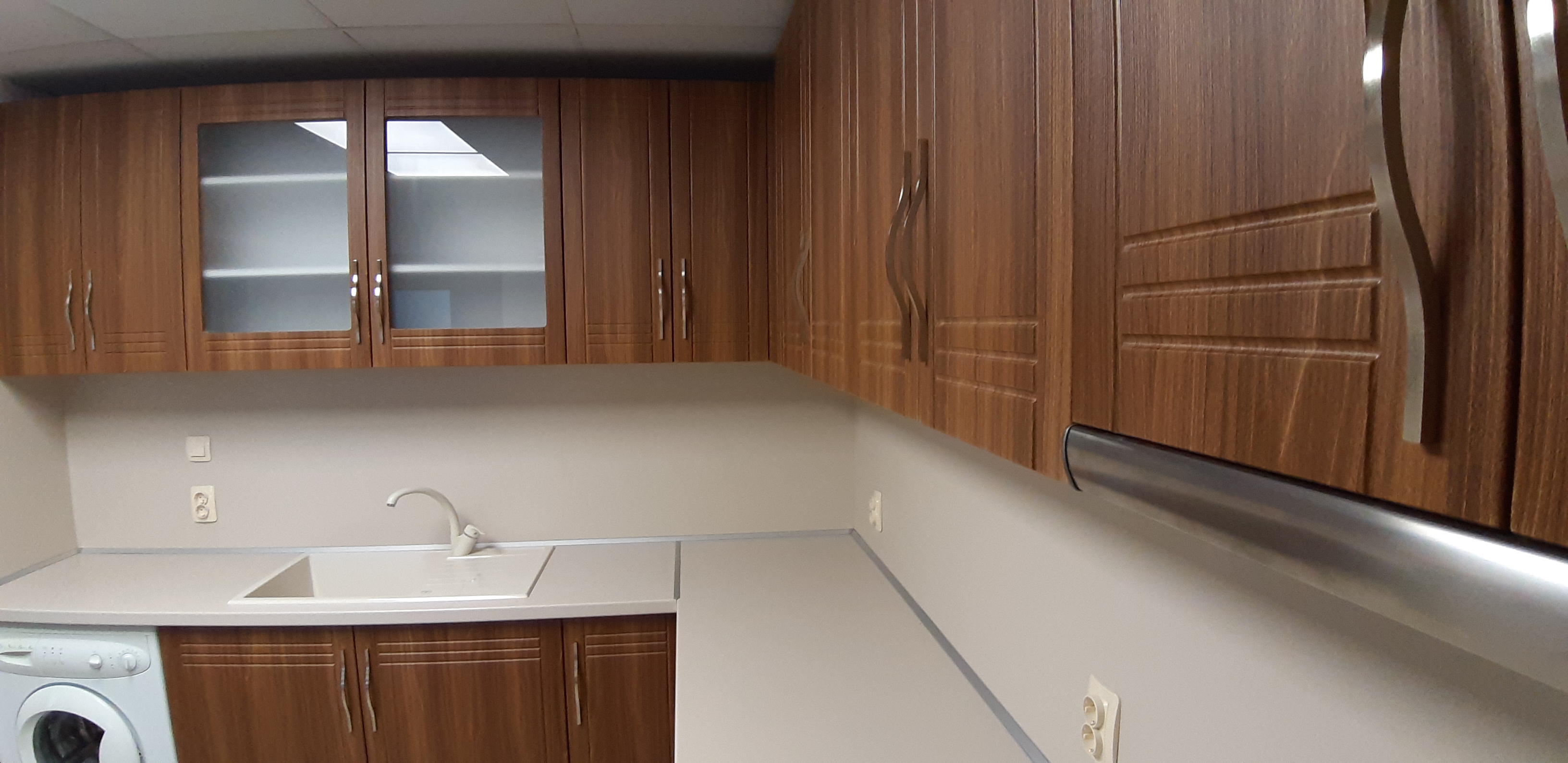 Кухня с релефни вратички МДФ и светъл плоте с керамична мивка