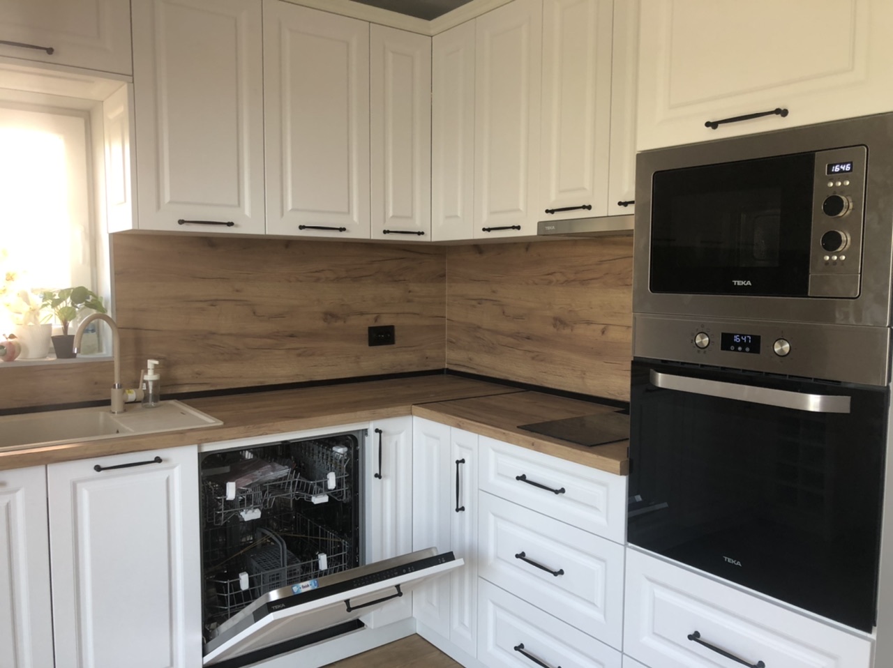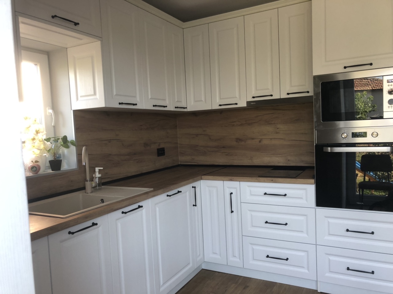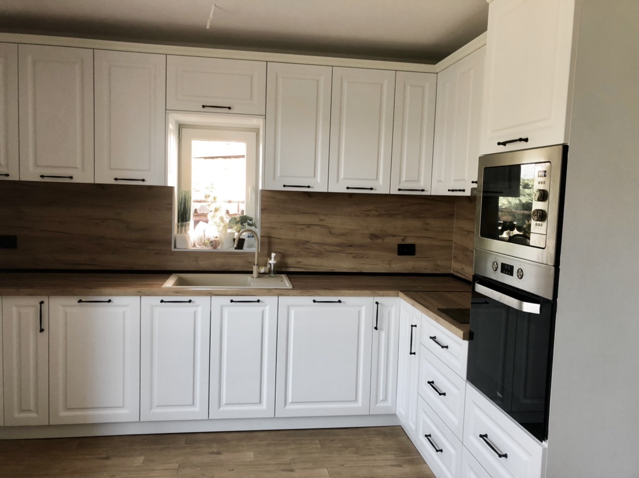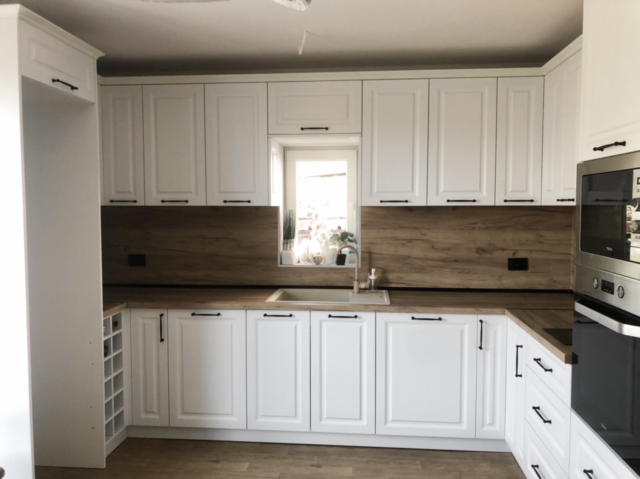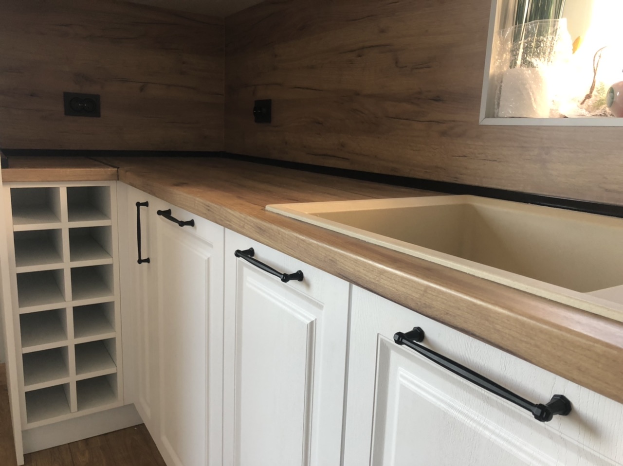 Кухня " Андалусия " винтидж стил от класически бял цвят и дървесен плот