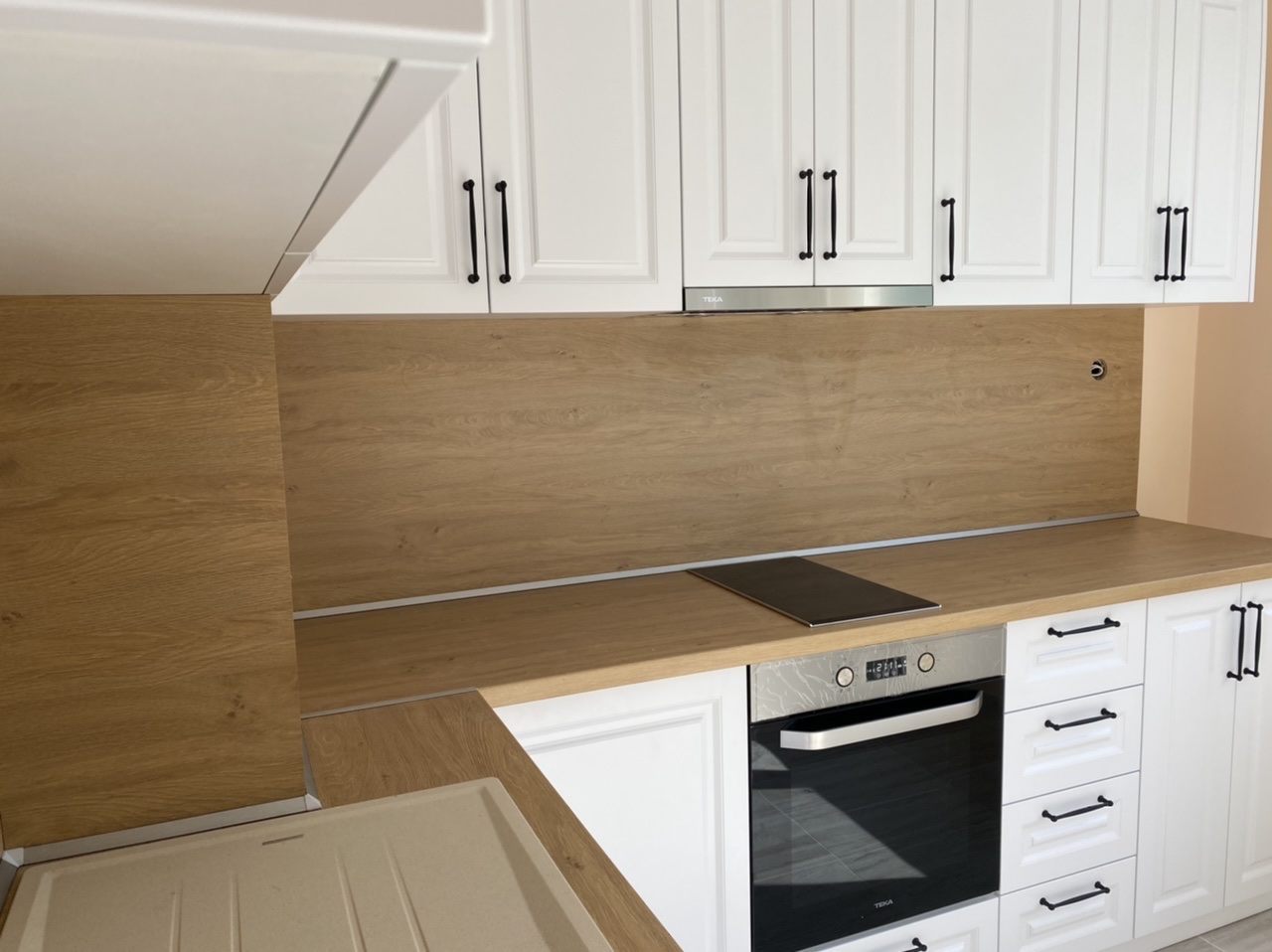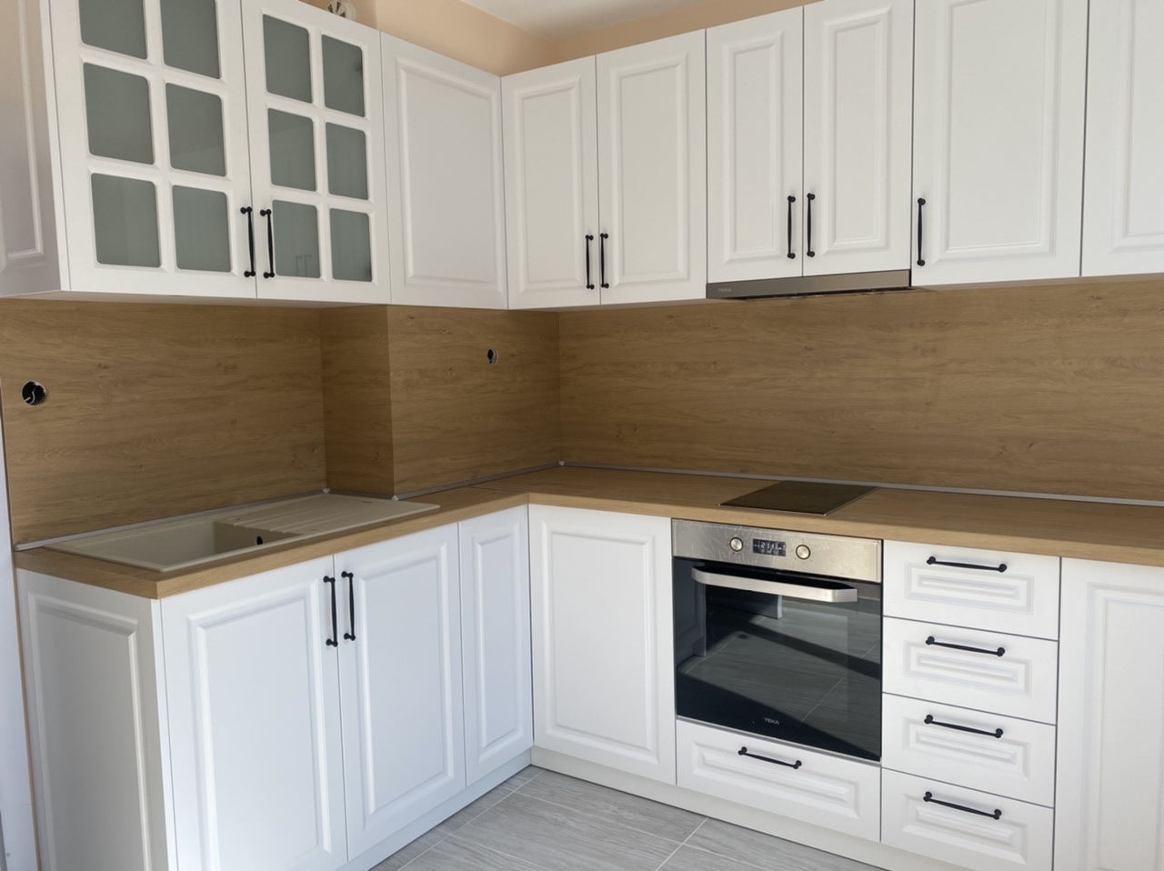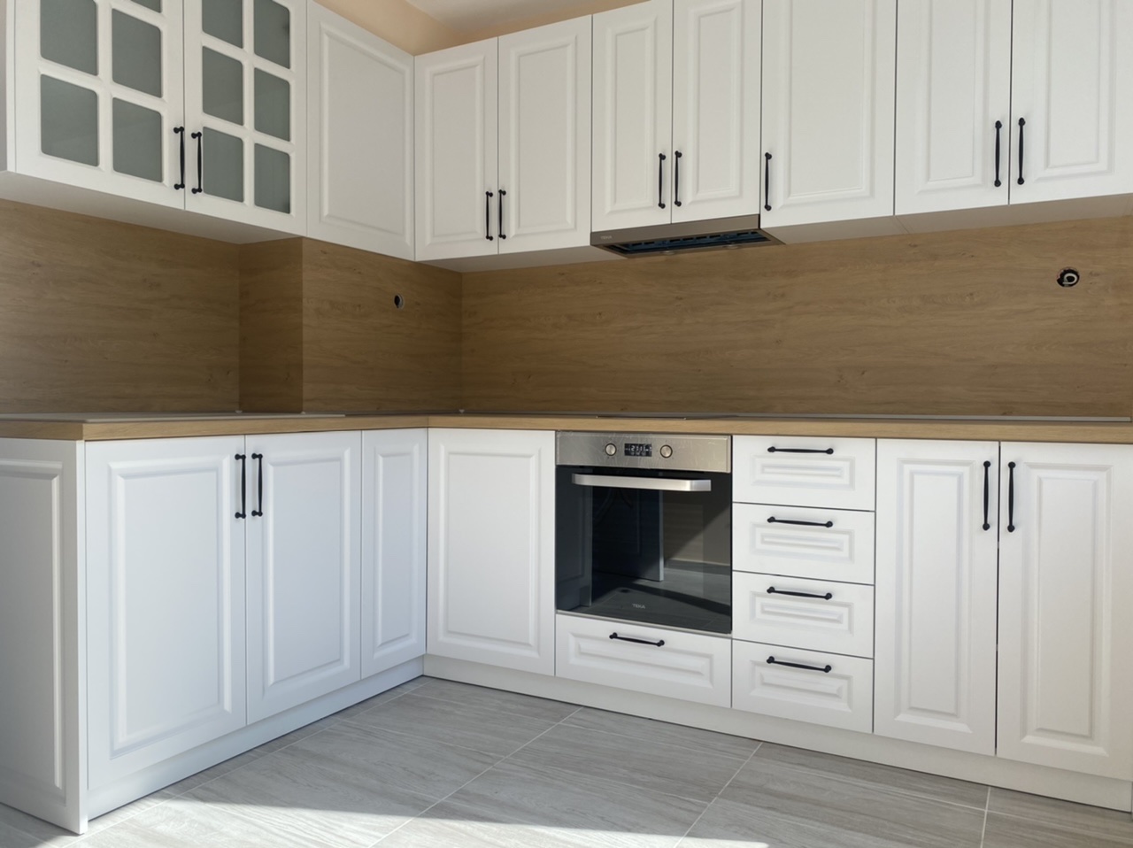 Кухня "Априлия" създадена в ретро стил и калсическата красота от бял МДФ и дървесен плот