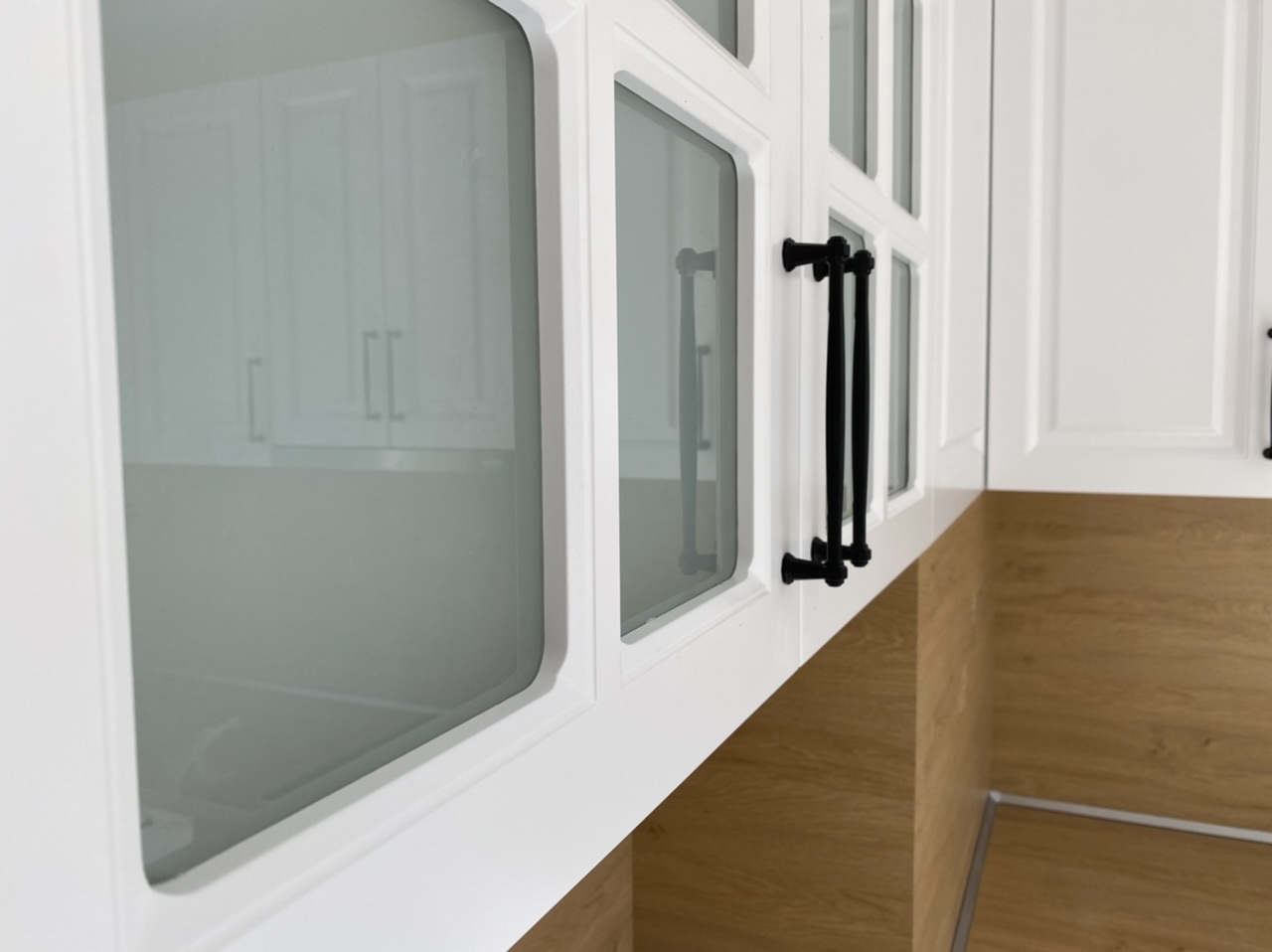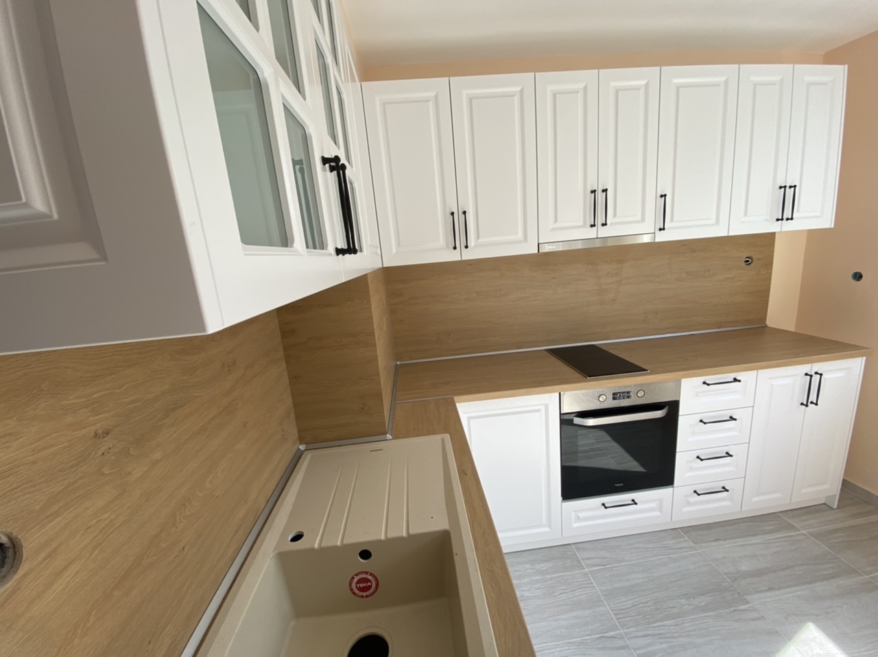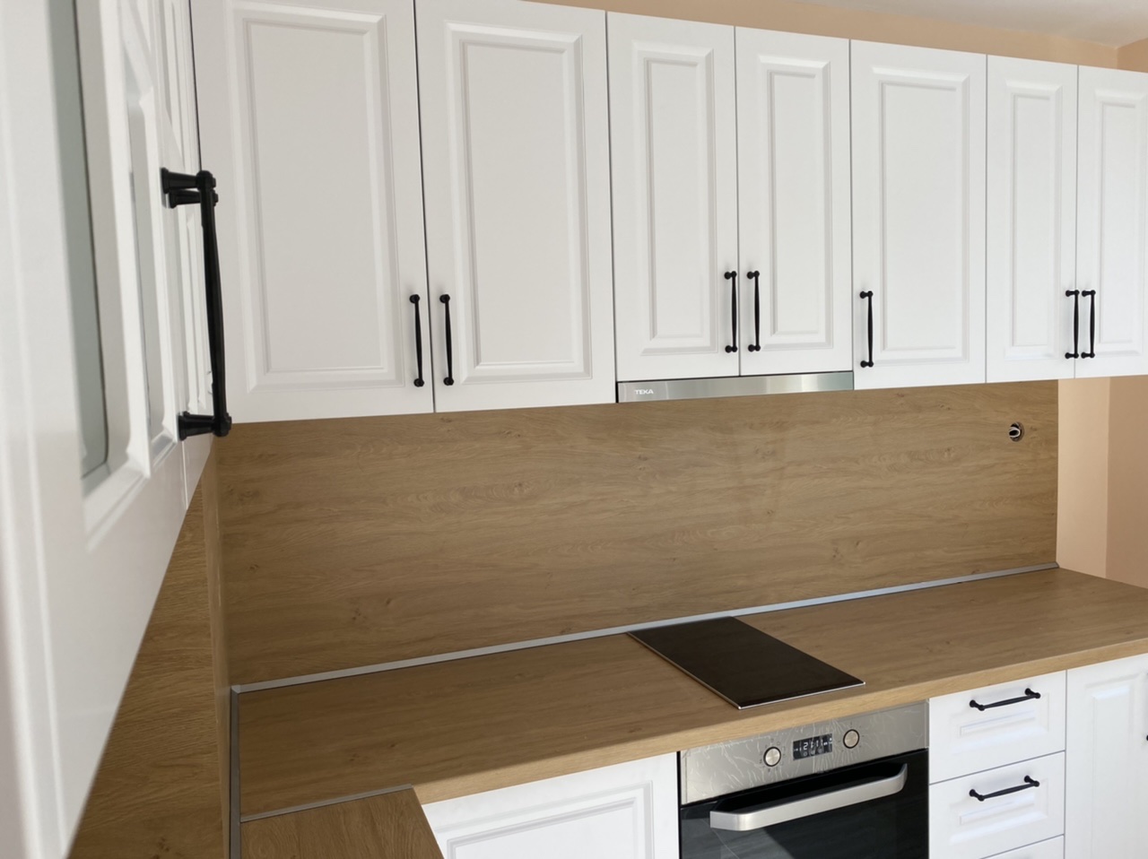Кухня "Априлия" създадена в ретро стил и калсическата красота от бял МДФ и дървесен плот
