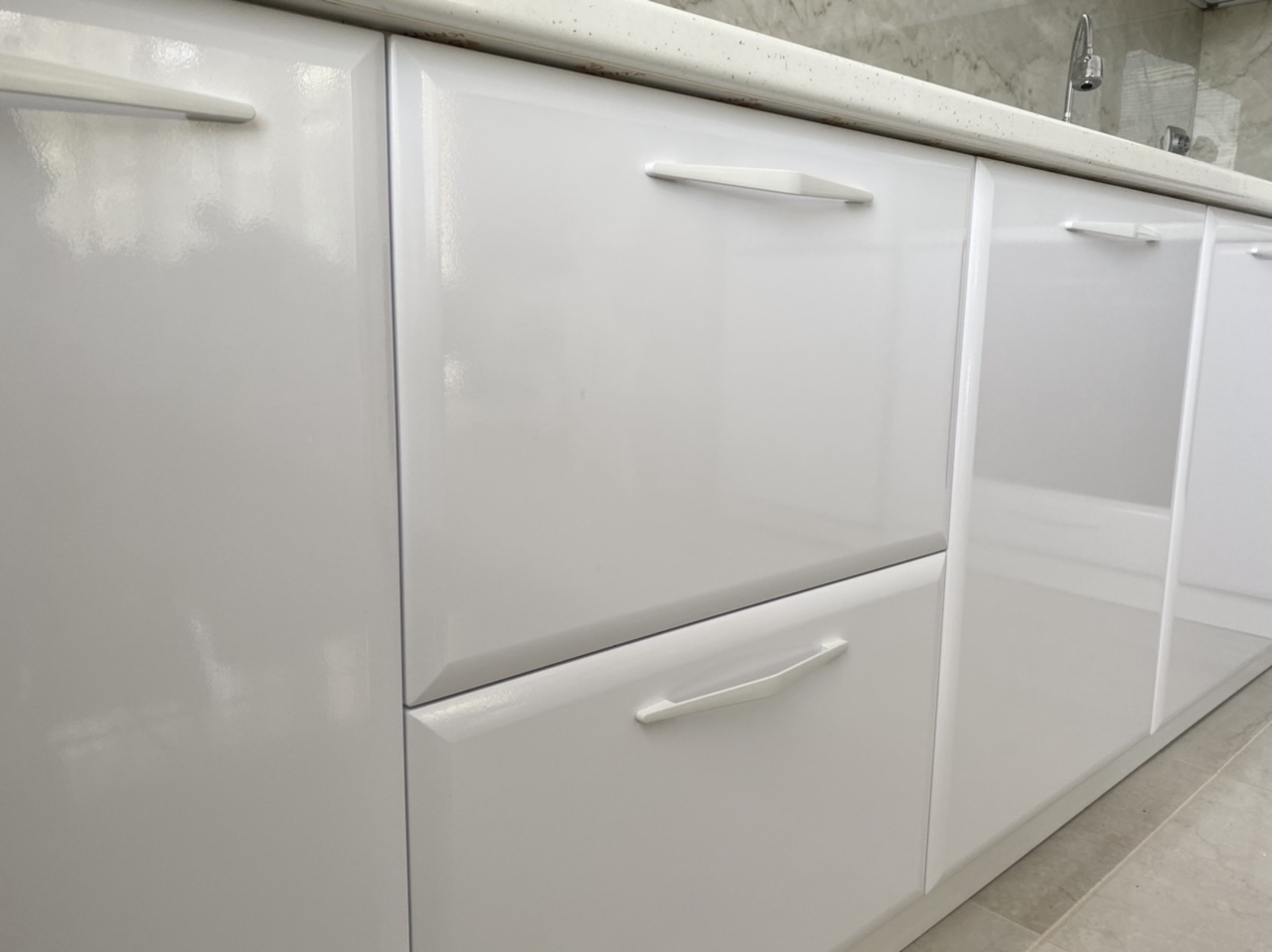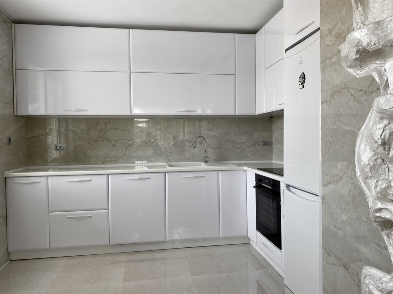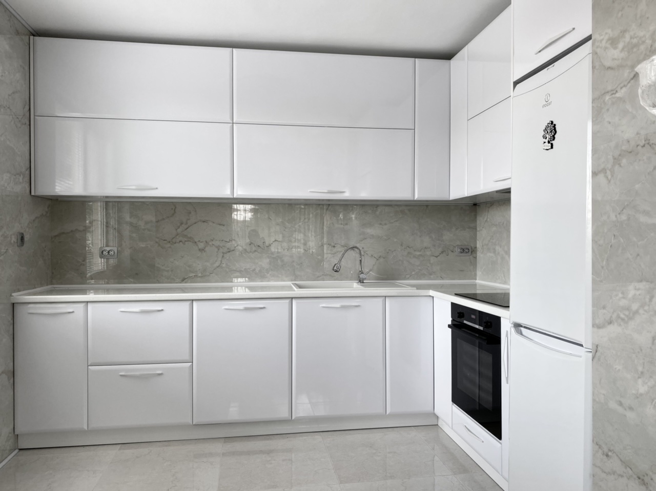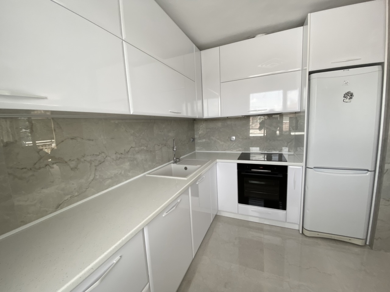 Кухня "Лацио" от бял гланц МДФ и плот звезден прах. Едно страхотно съчетание предаващо лукс и уют в едно.