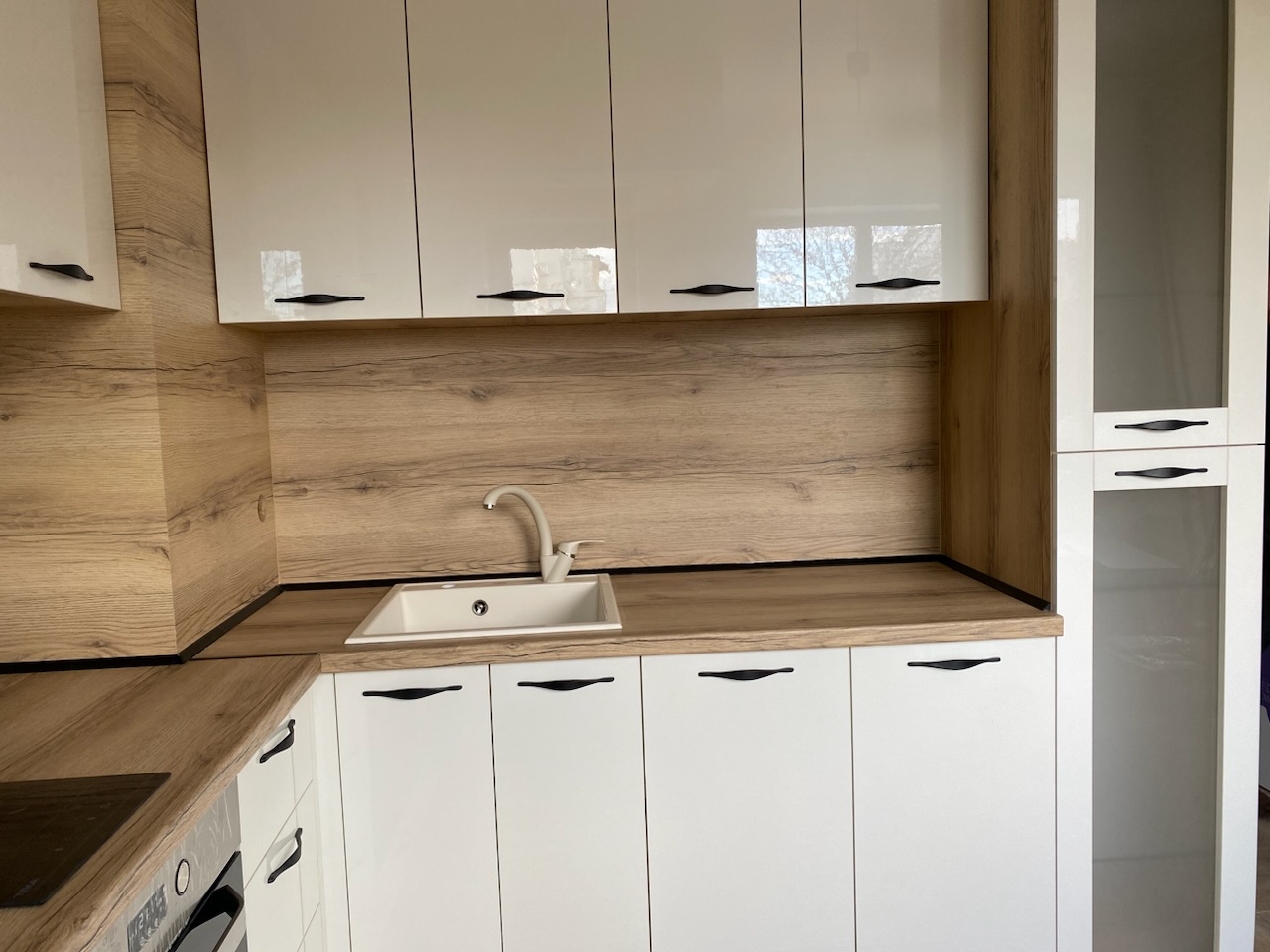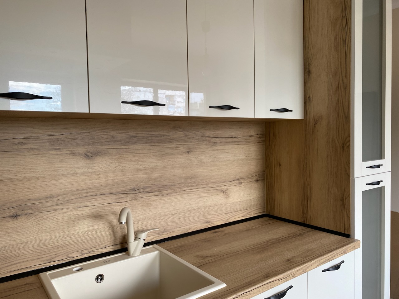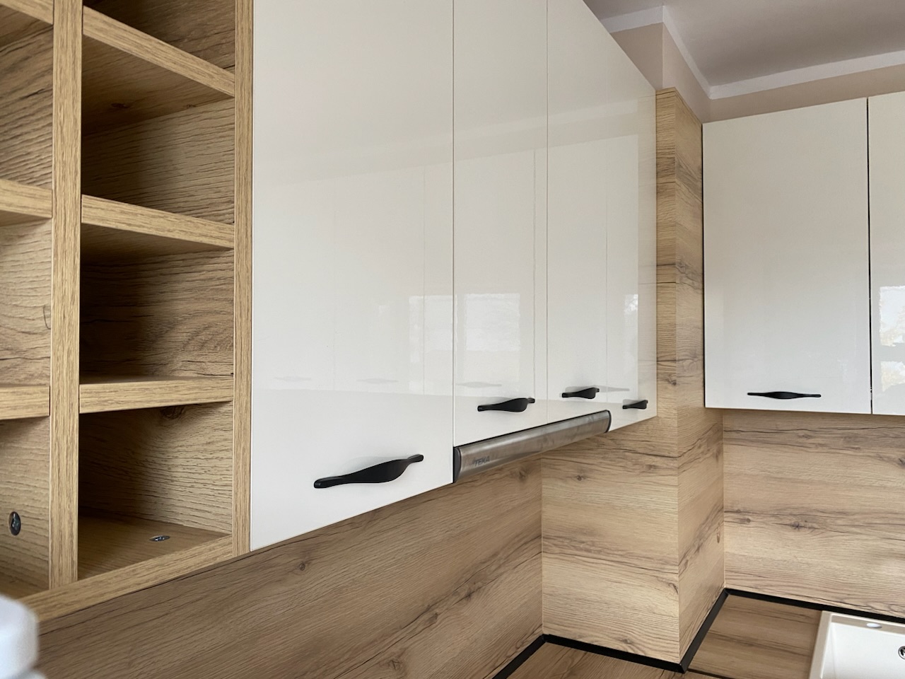 Кухня "Уик", изработена от гланциран МДФ и дървесен плот