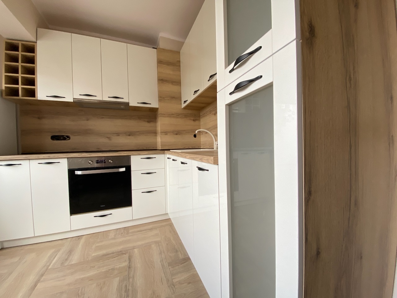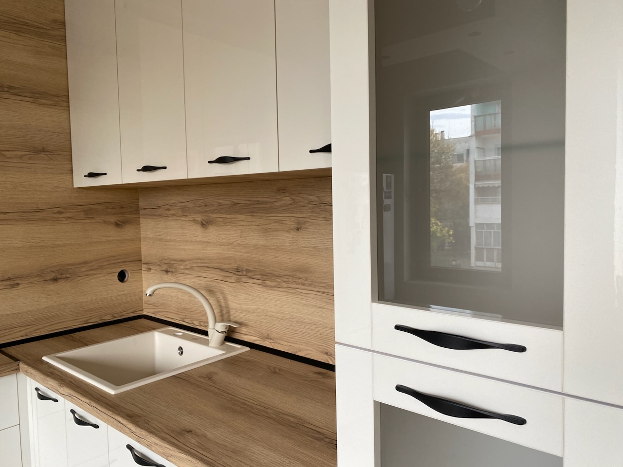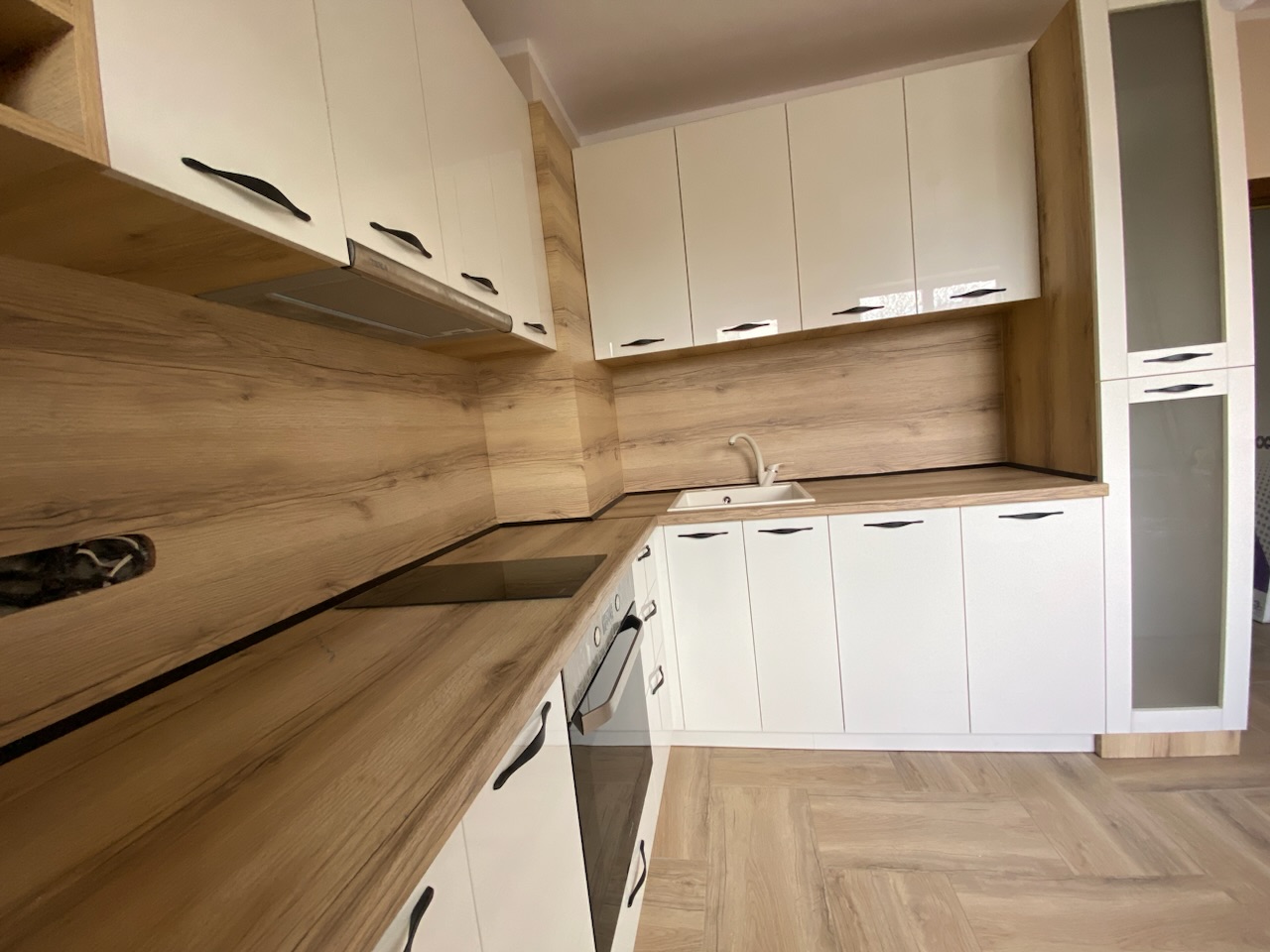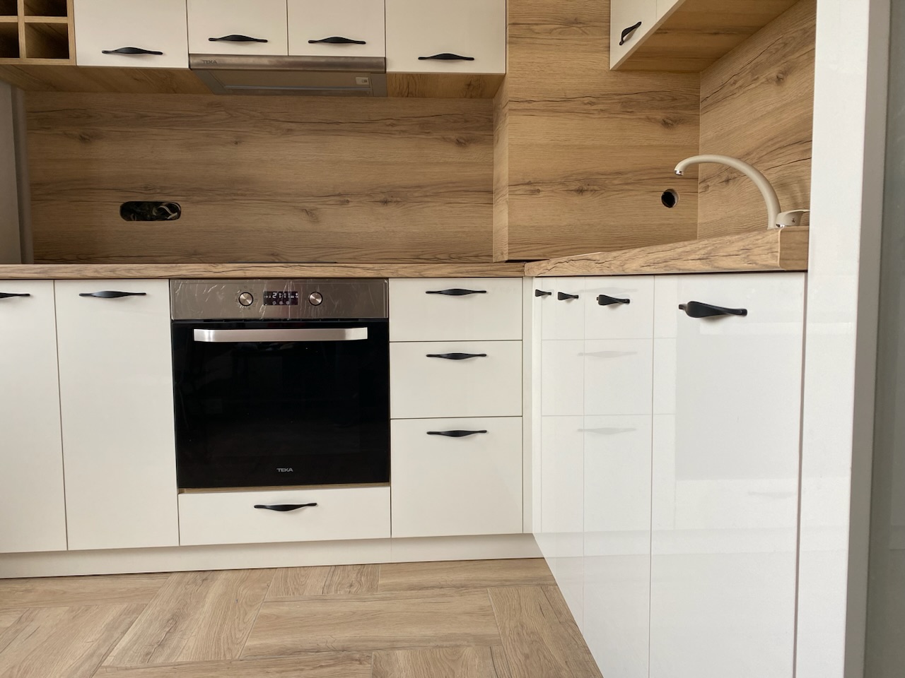 Кухня "Уик", изработена от гланциран МДФ и дървесен плот