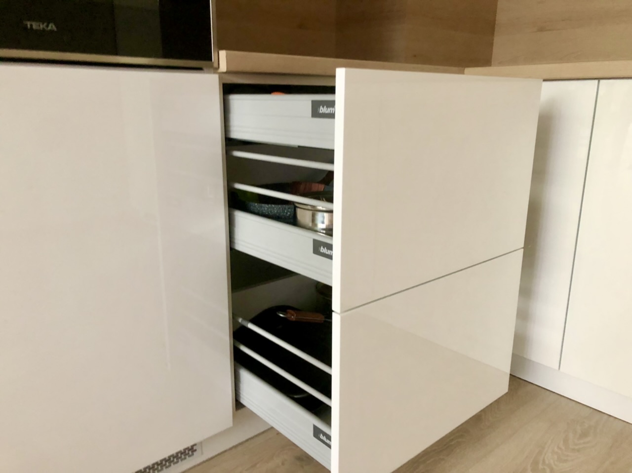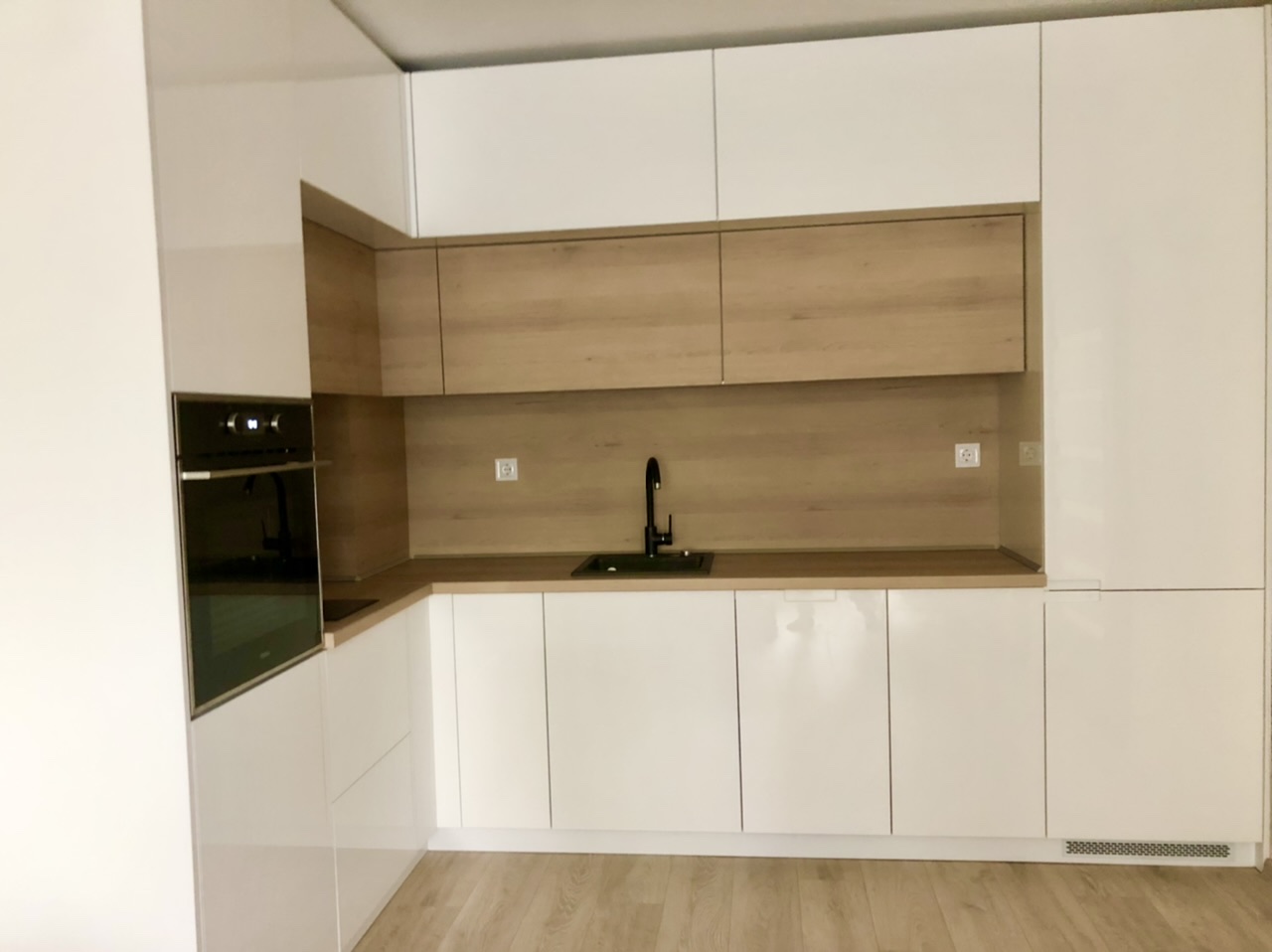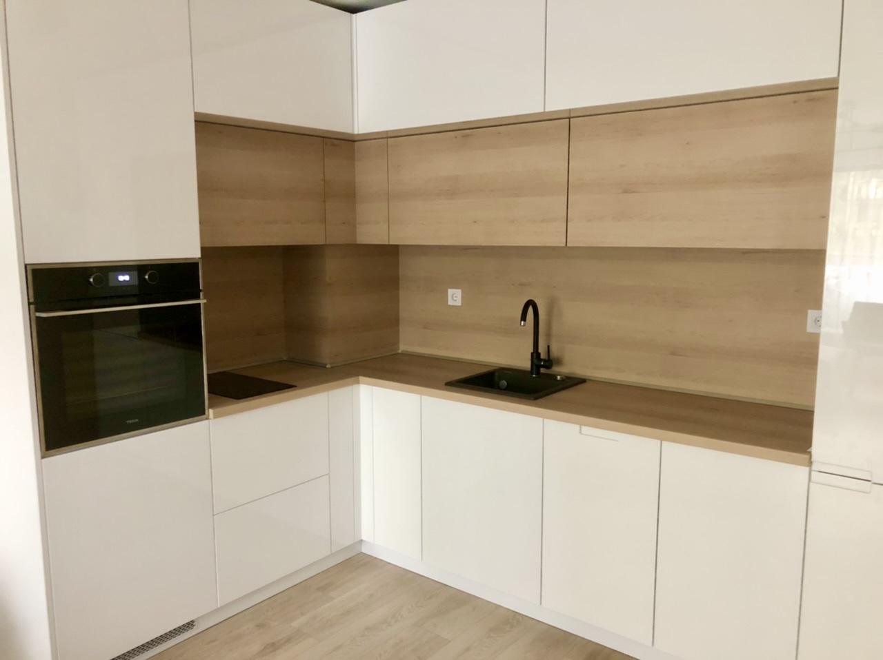 Кухня "Белсхил", изработена от боядисан бял МДФ гланц и дървесен мотив