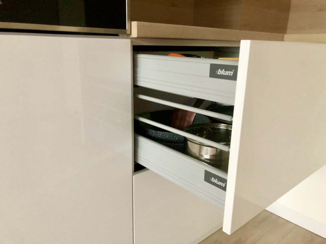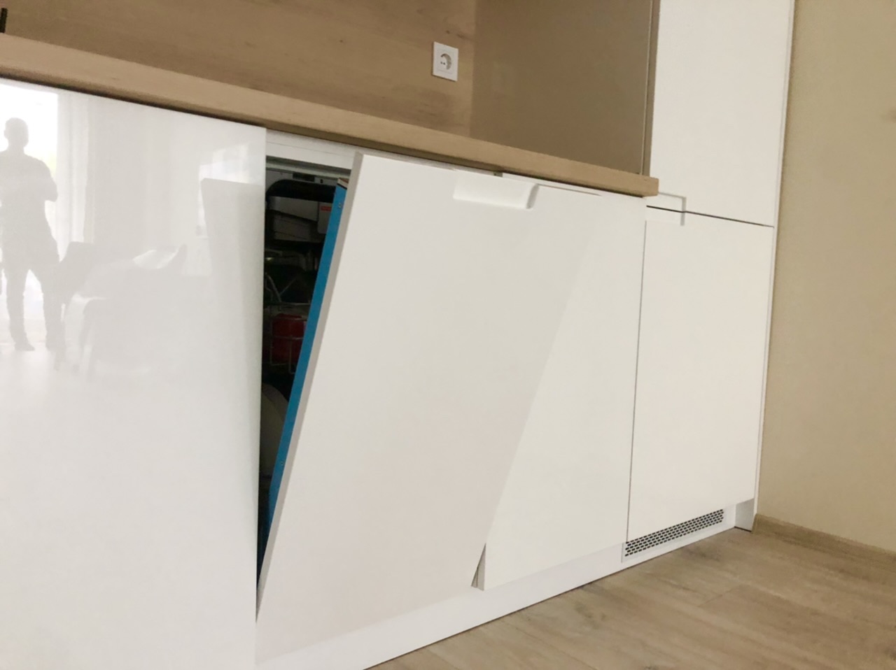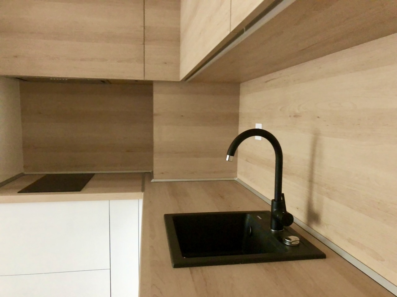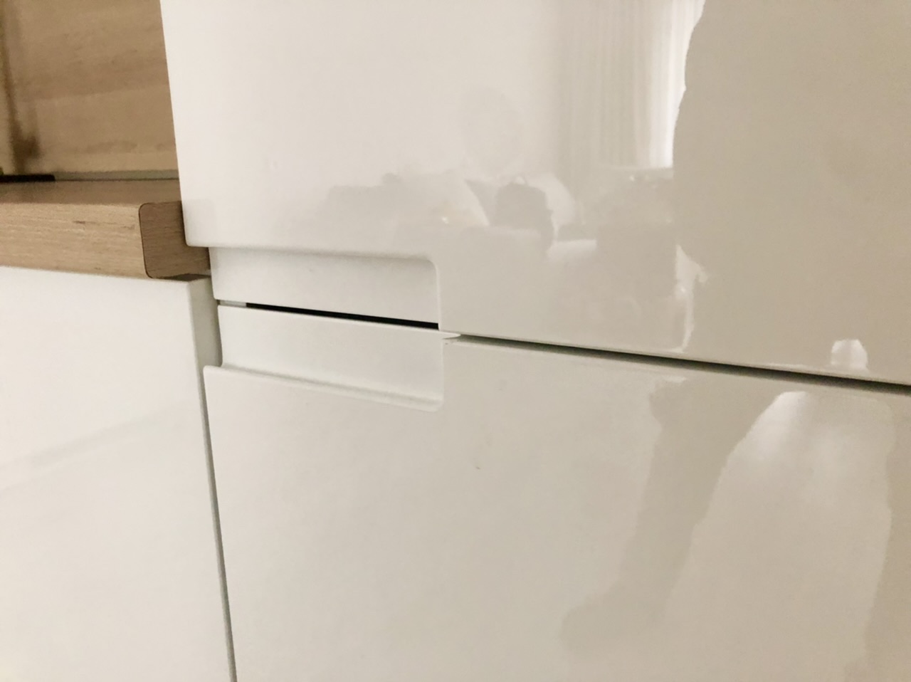 Кухня "Белсхил", изработена от боядисан бял МДФ гланц и дървесен мотив