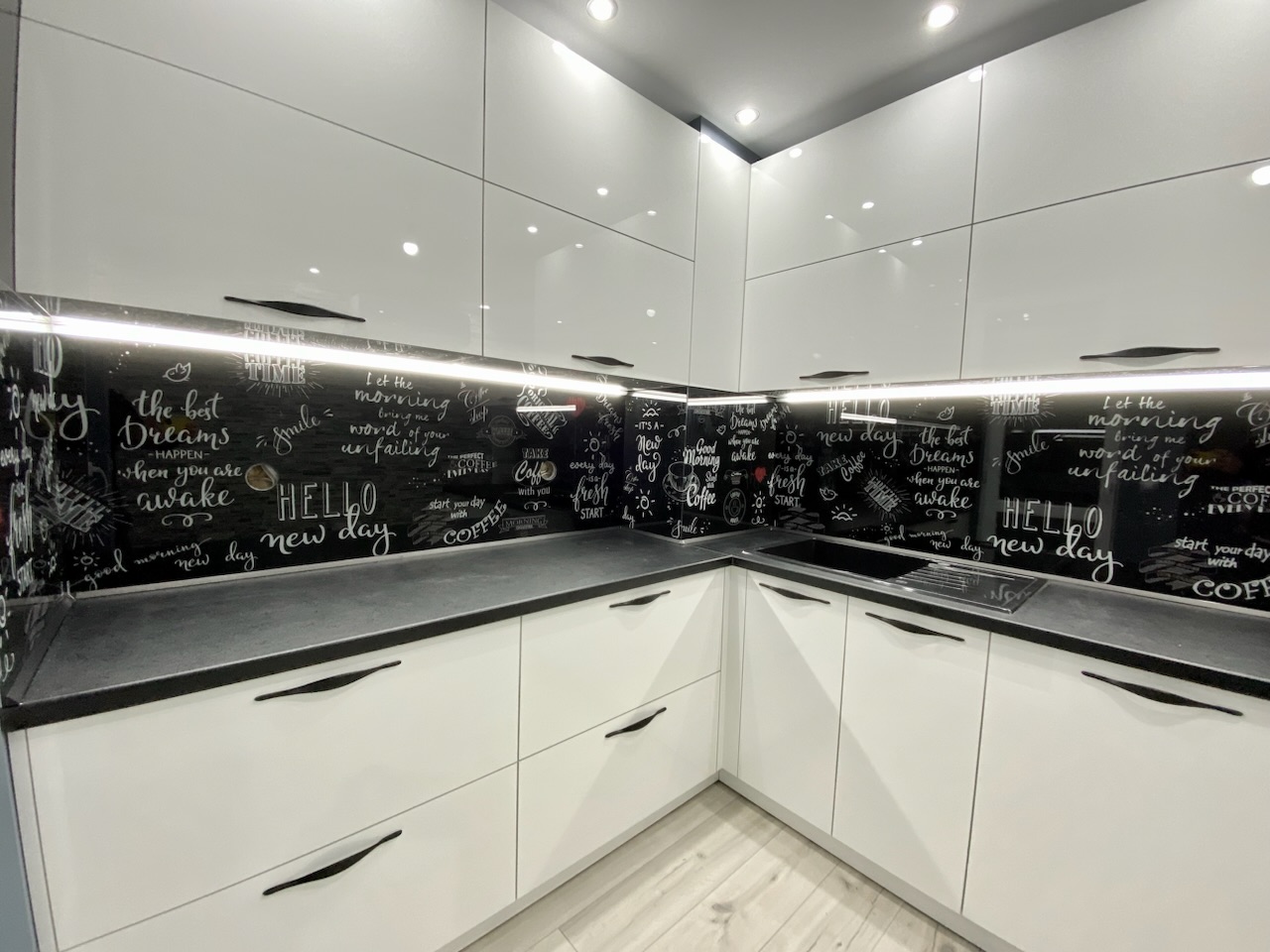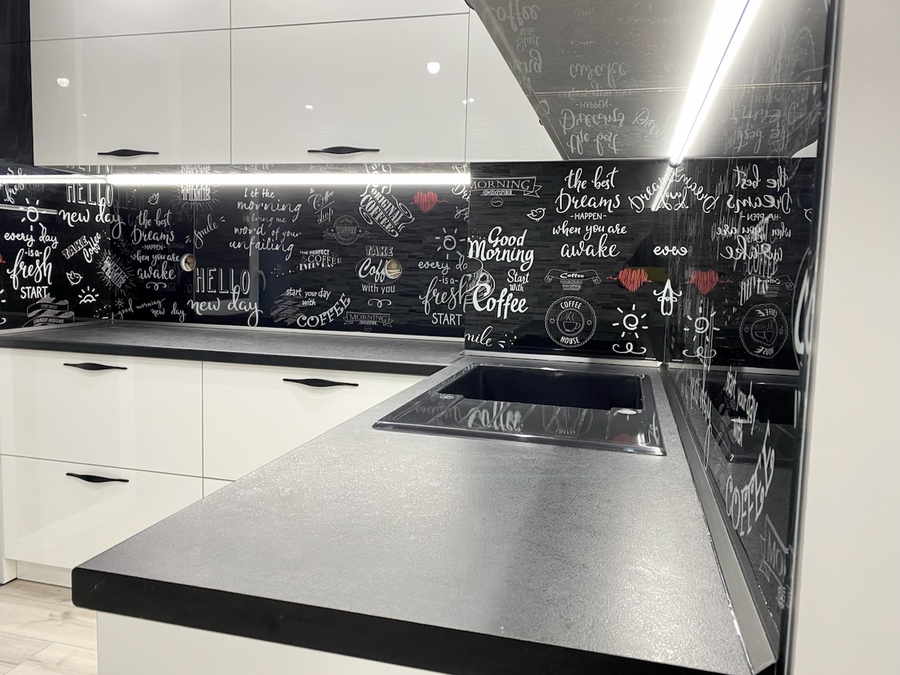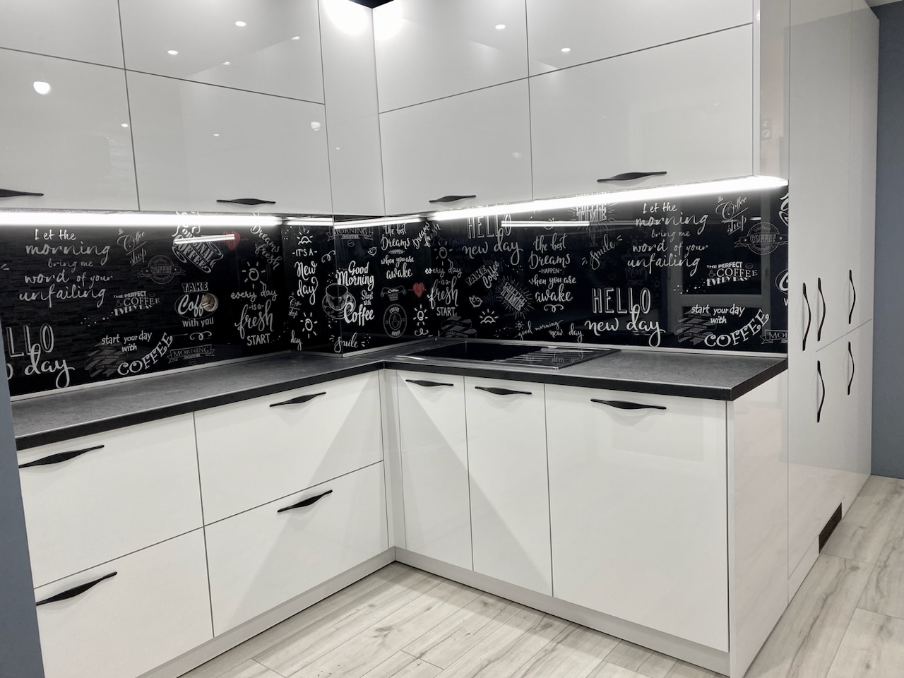 Кухня "Бургос", изработена от бял акрилен МДФ, черен плот Шагре и принтстъкло