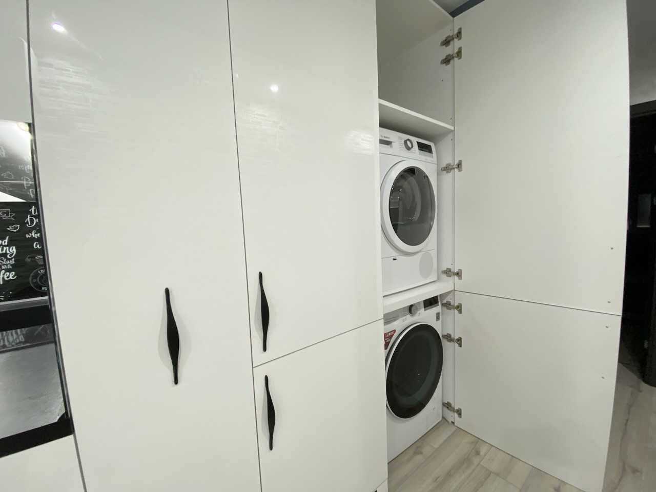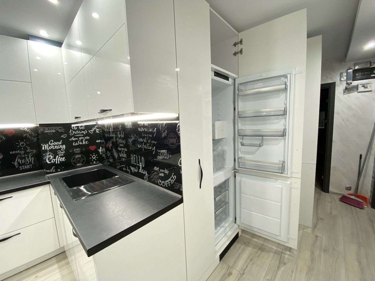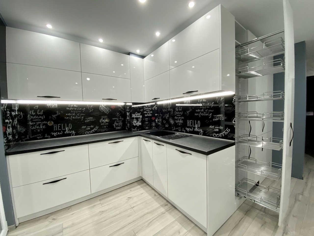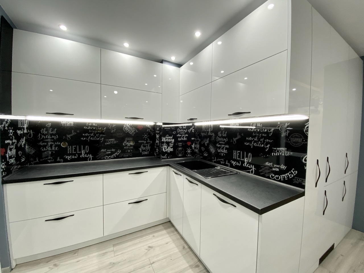 Кухня "Бургос", изработена от бял акрилен МДФ, черен плот Шагре и принтстъкло