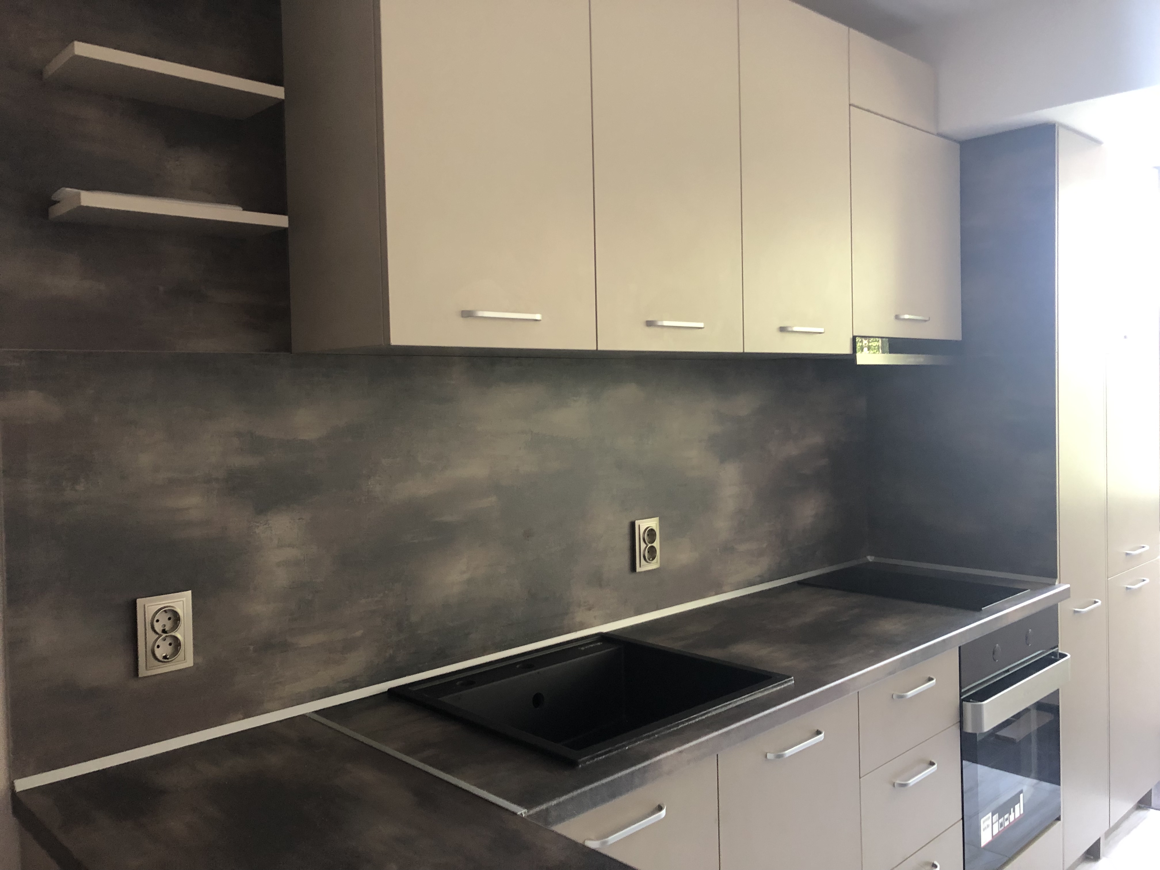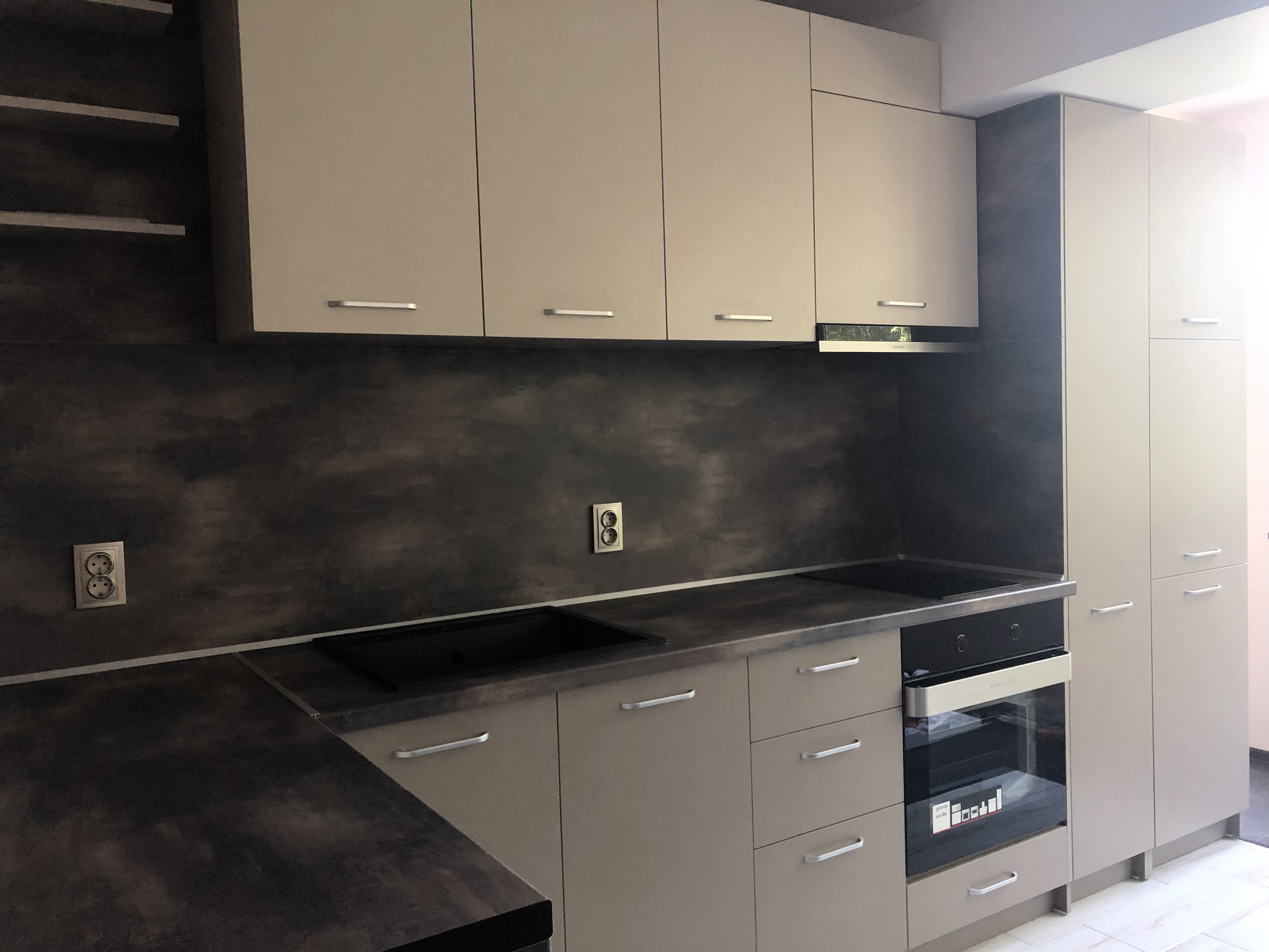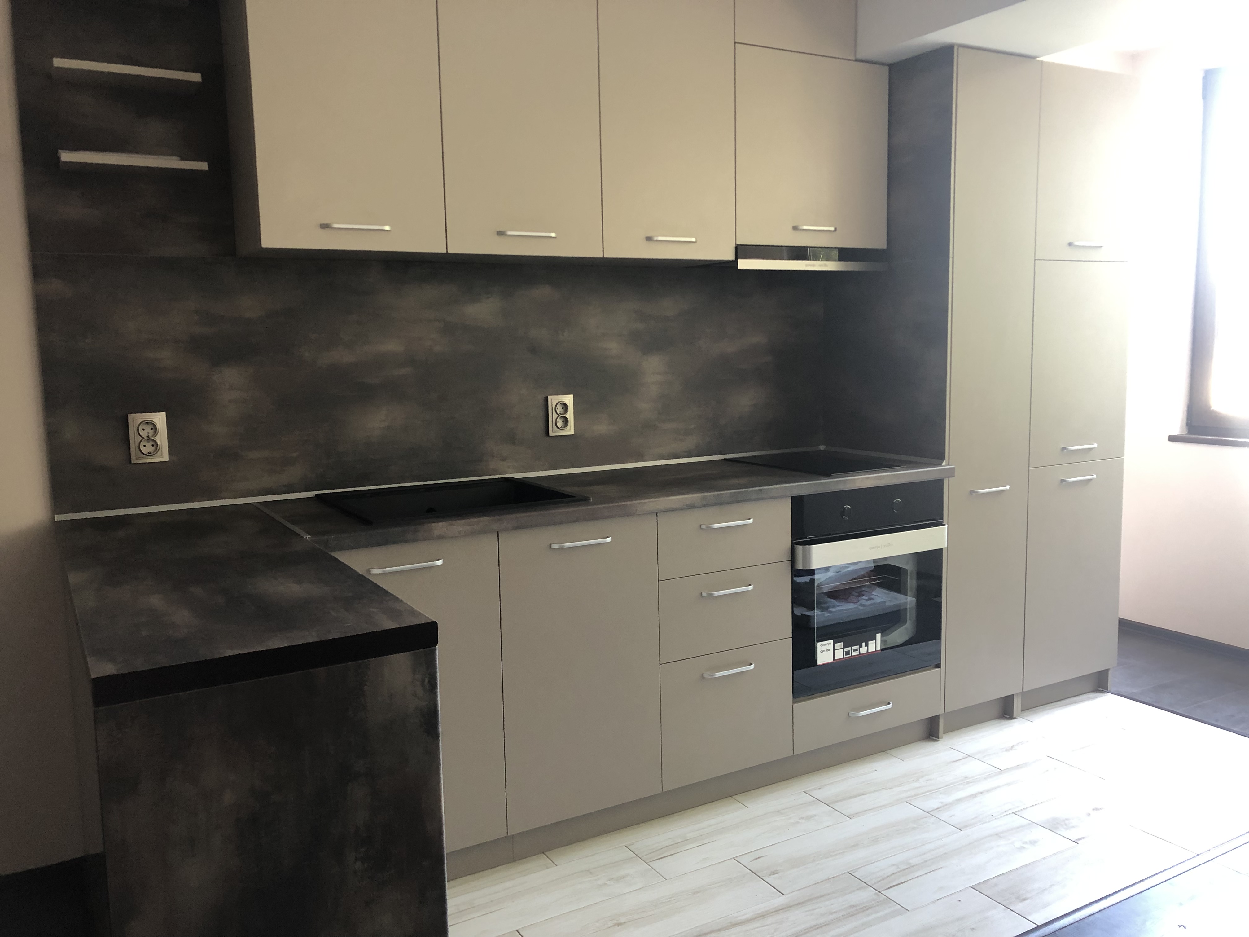 Кухня в два цвята с преливащ се тъмен плот