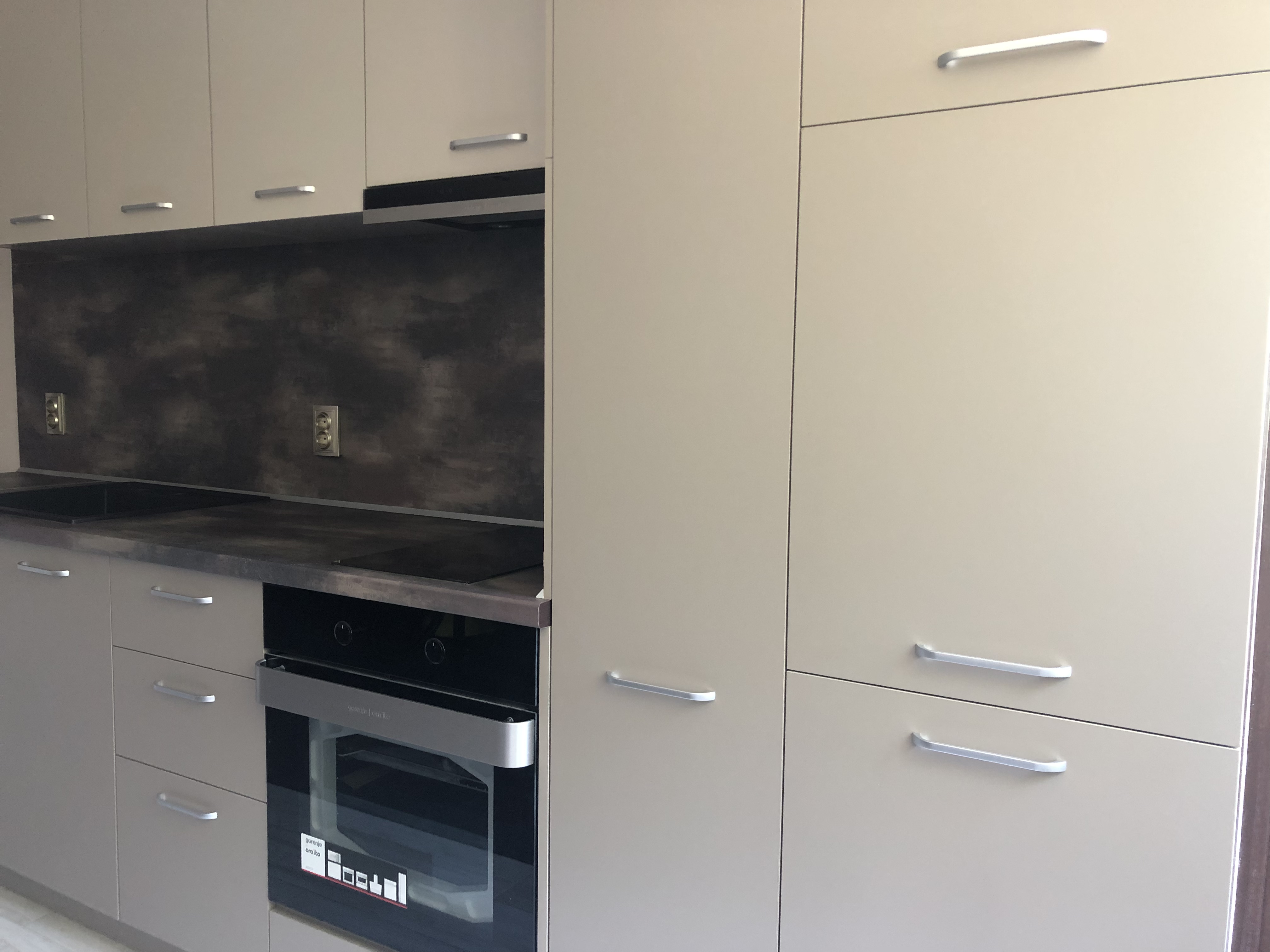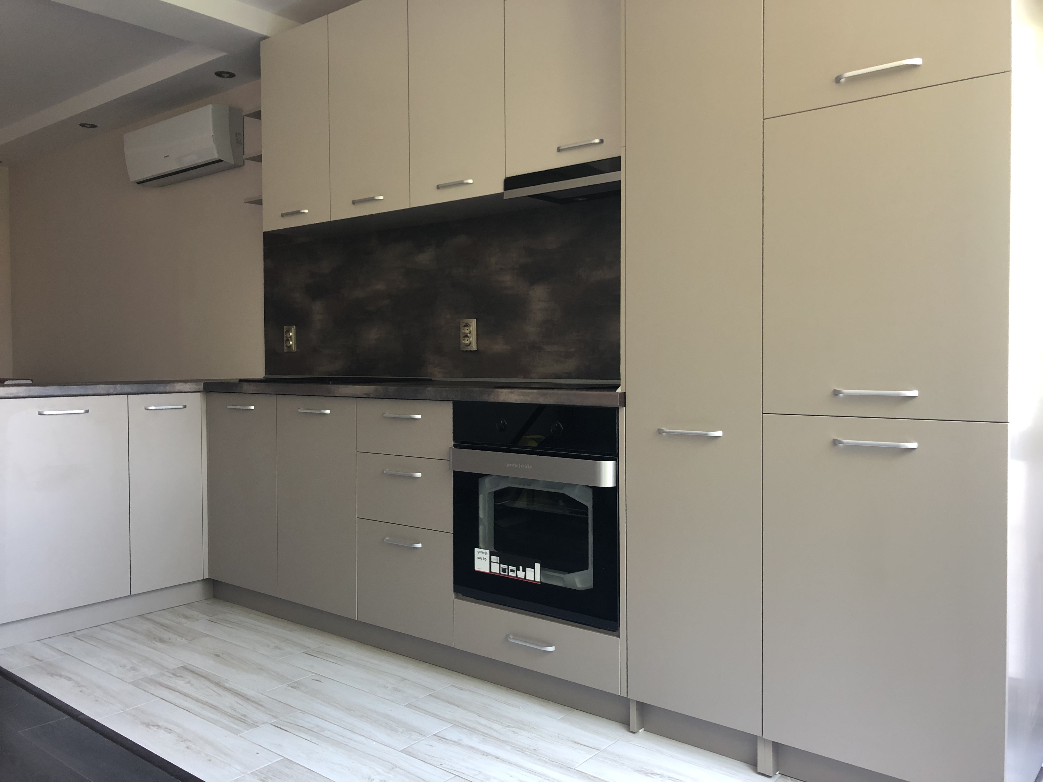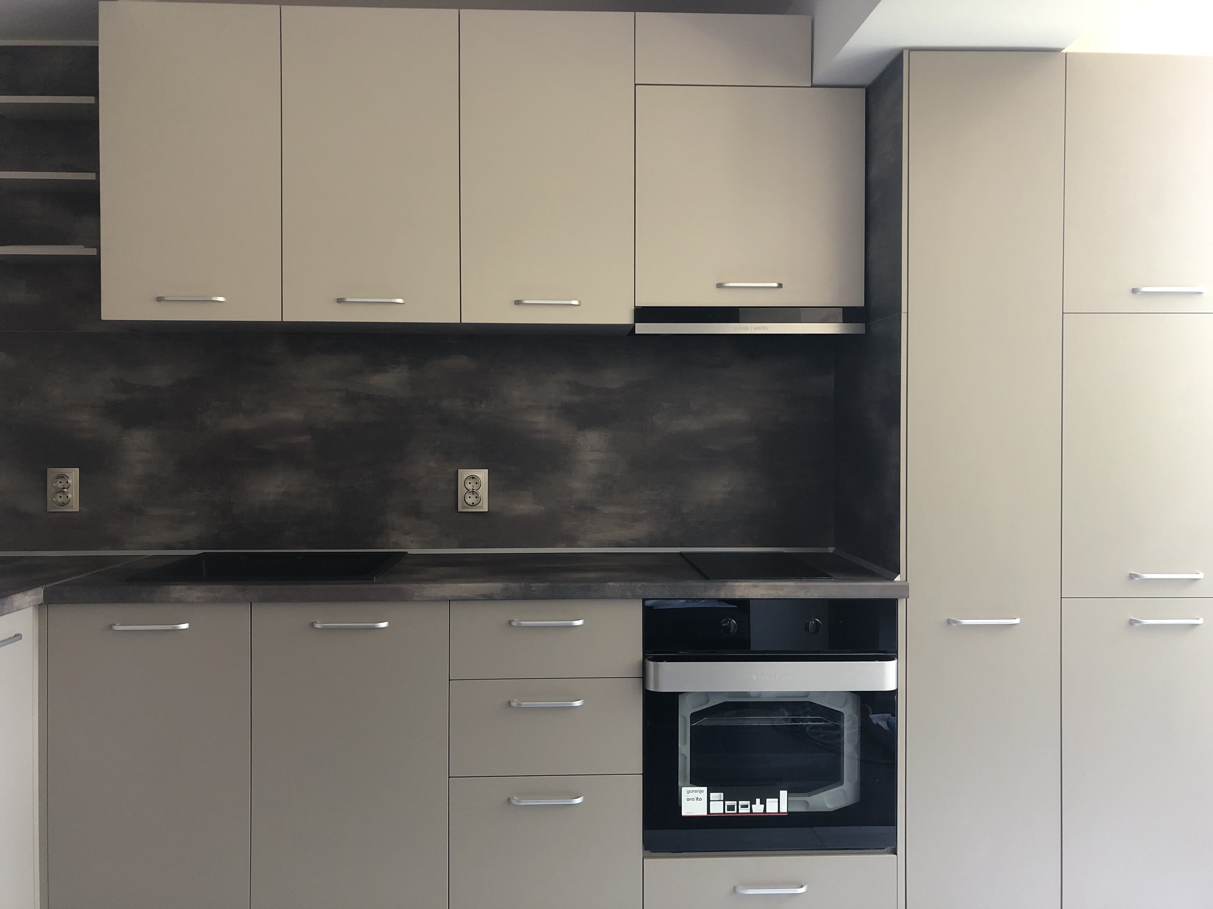 Кухня в два цвята с преливащ се тъмен плот