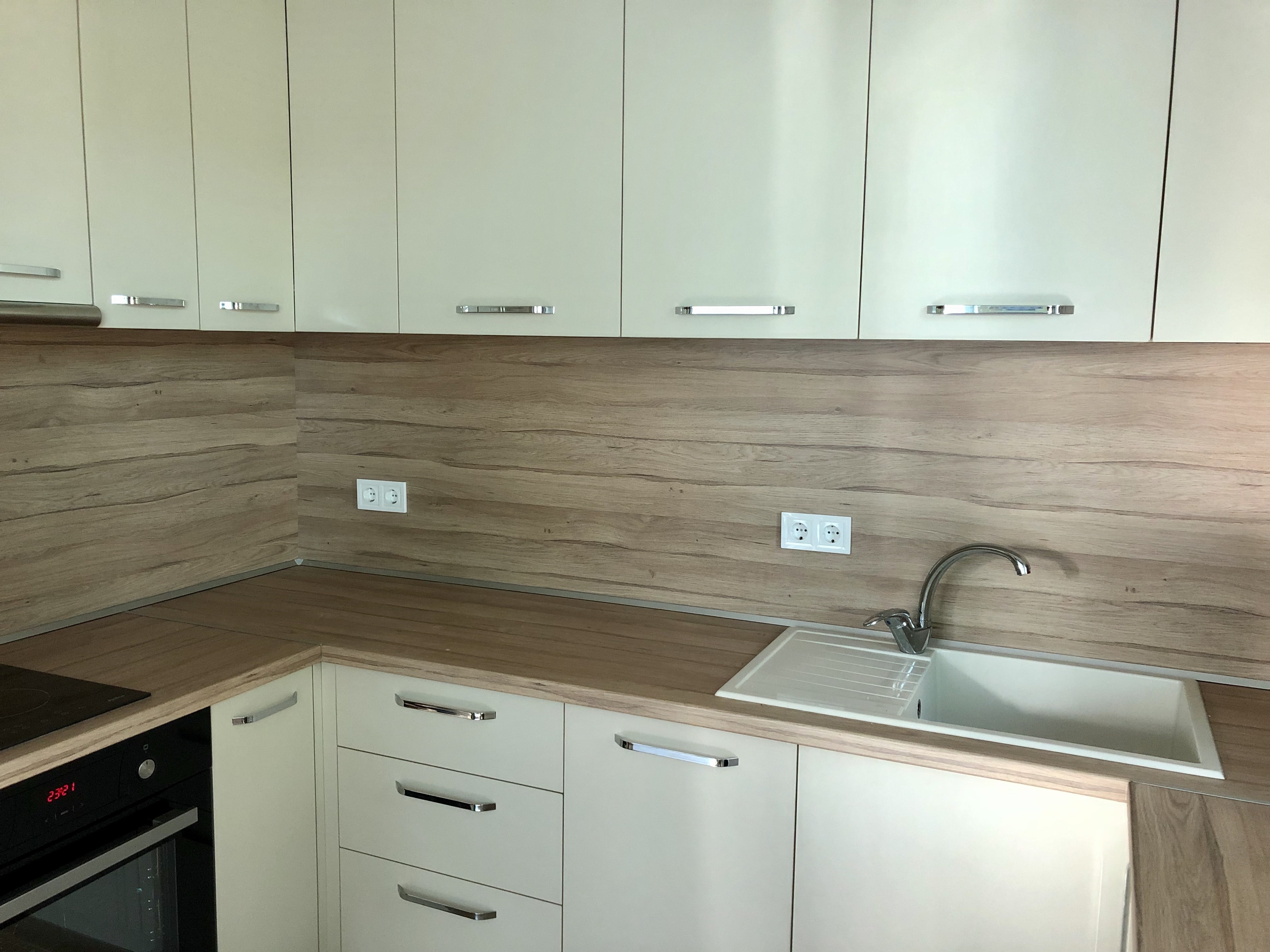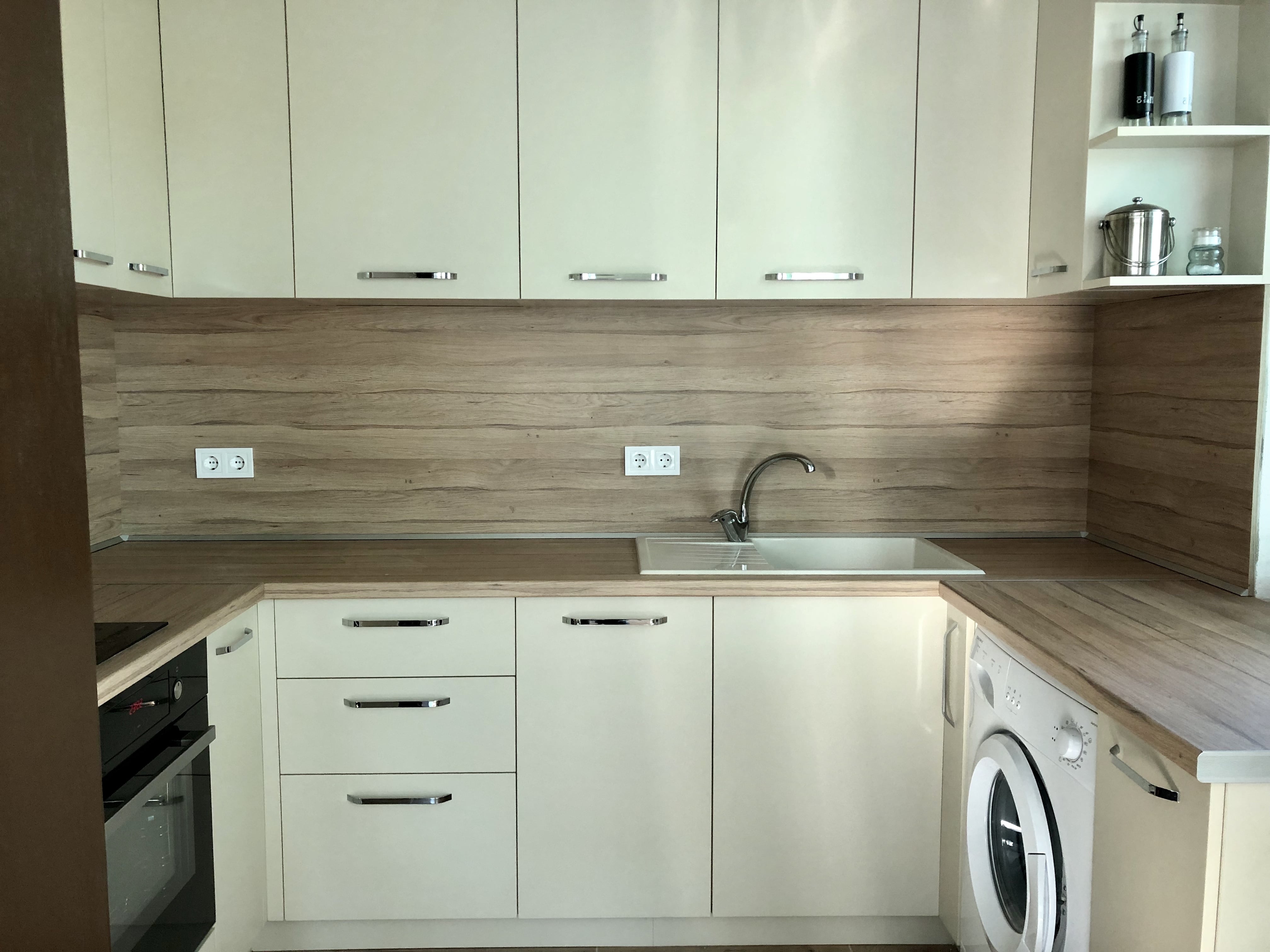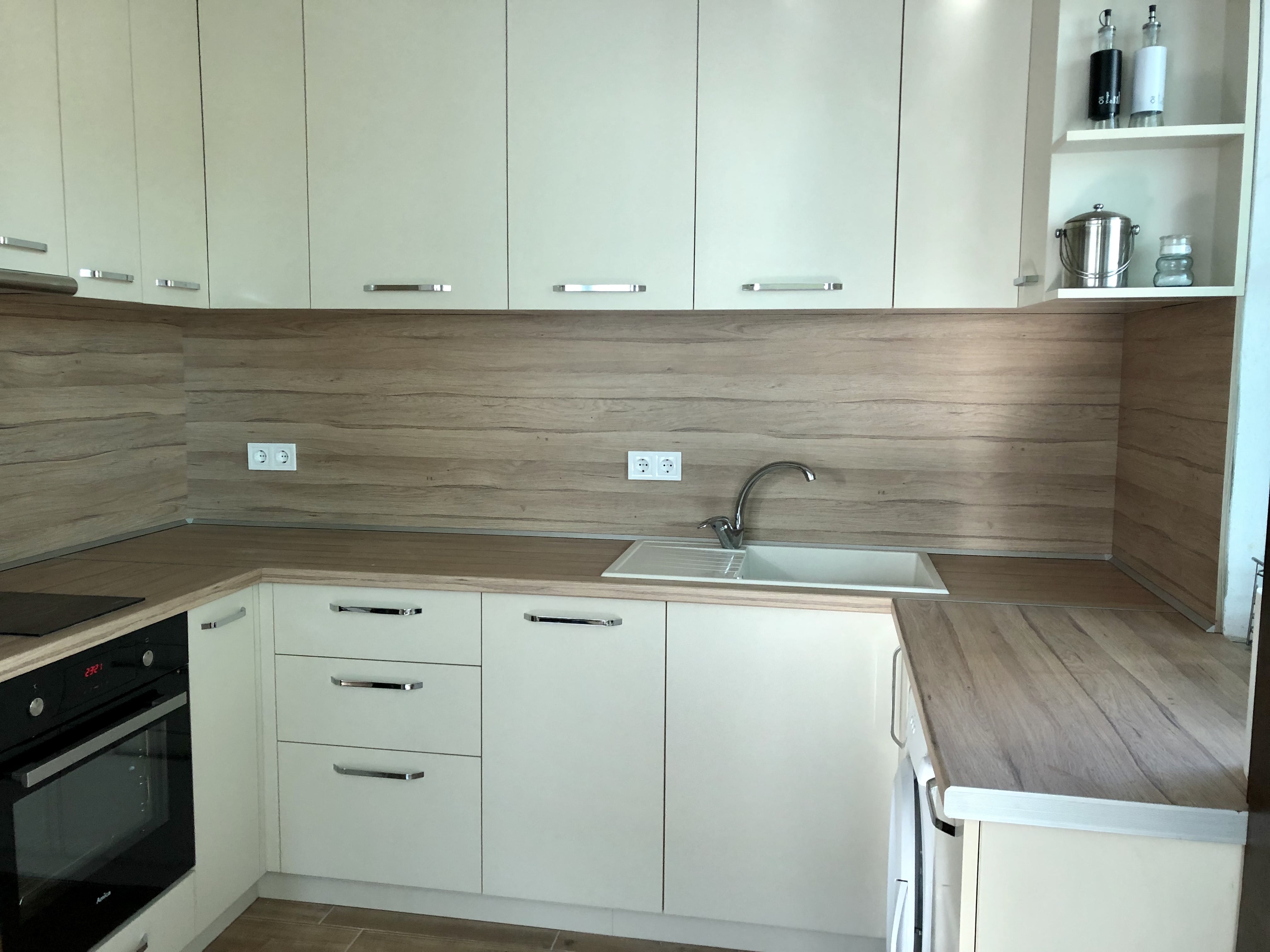 Кухня от ПДЧ с цвят керемида и дървесен плот