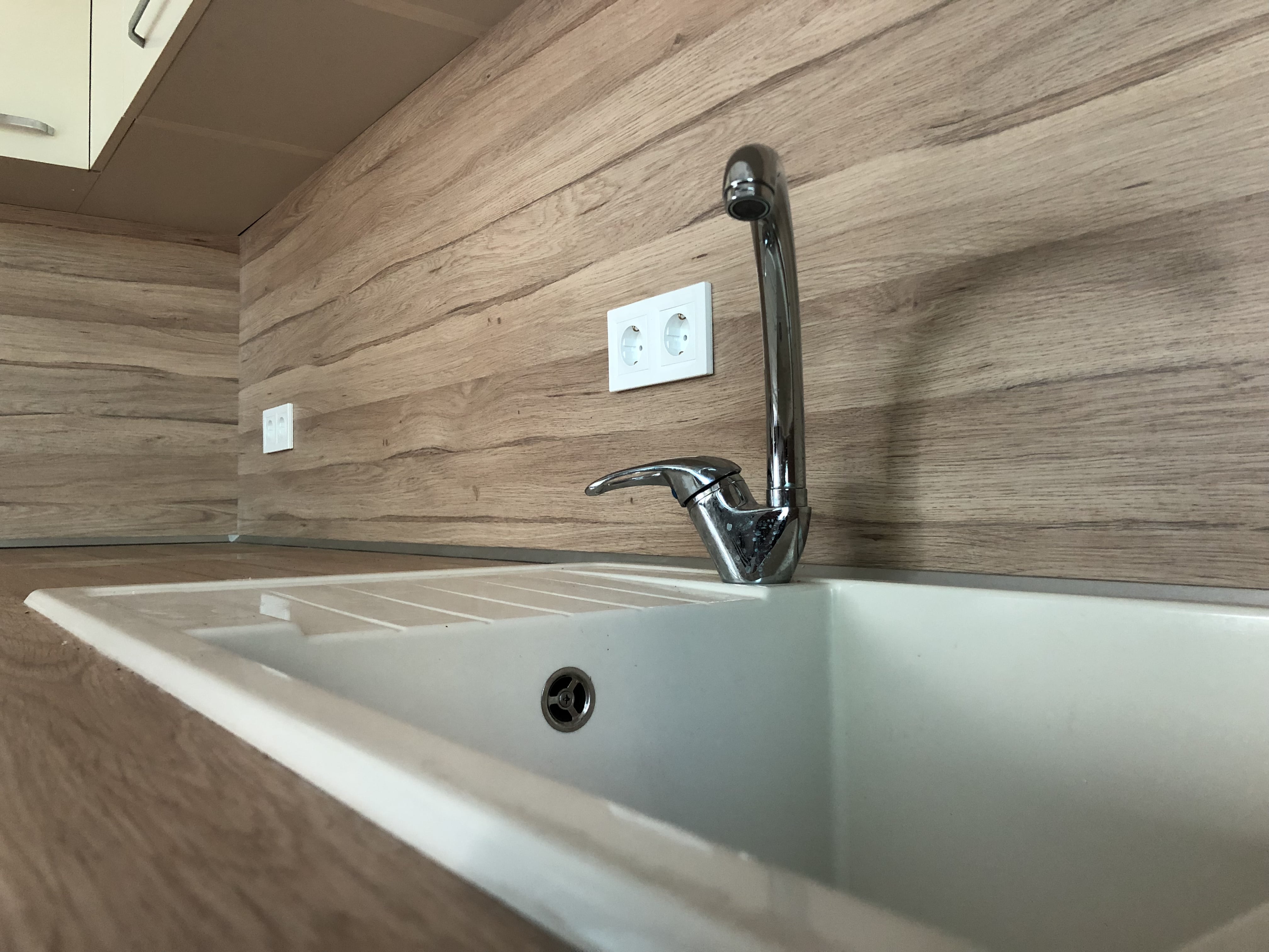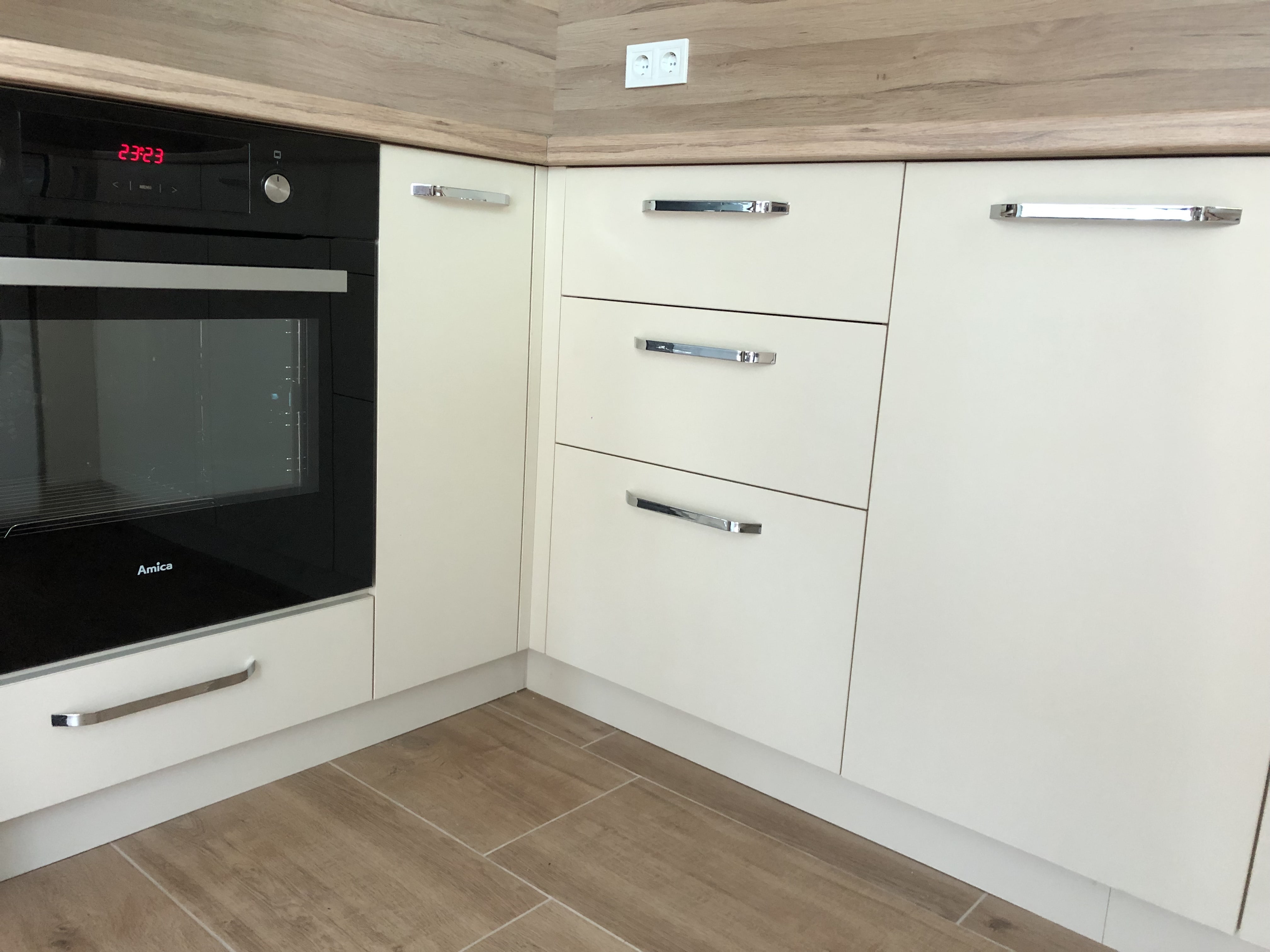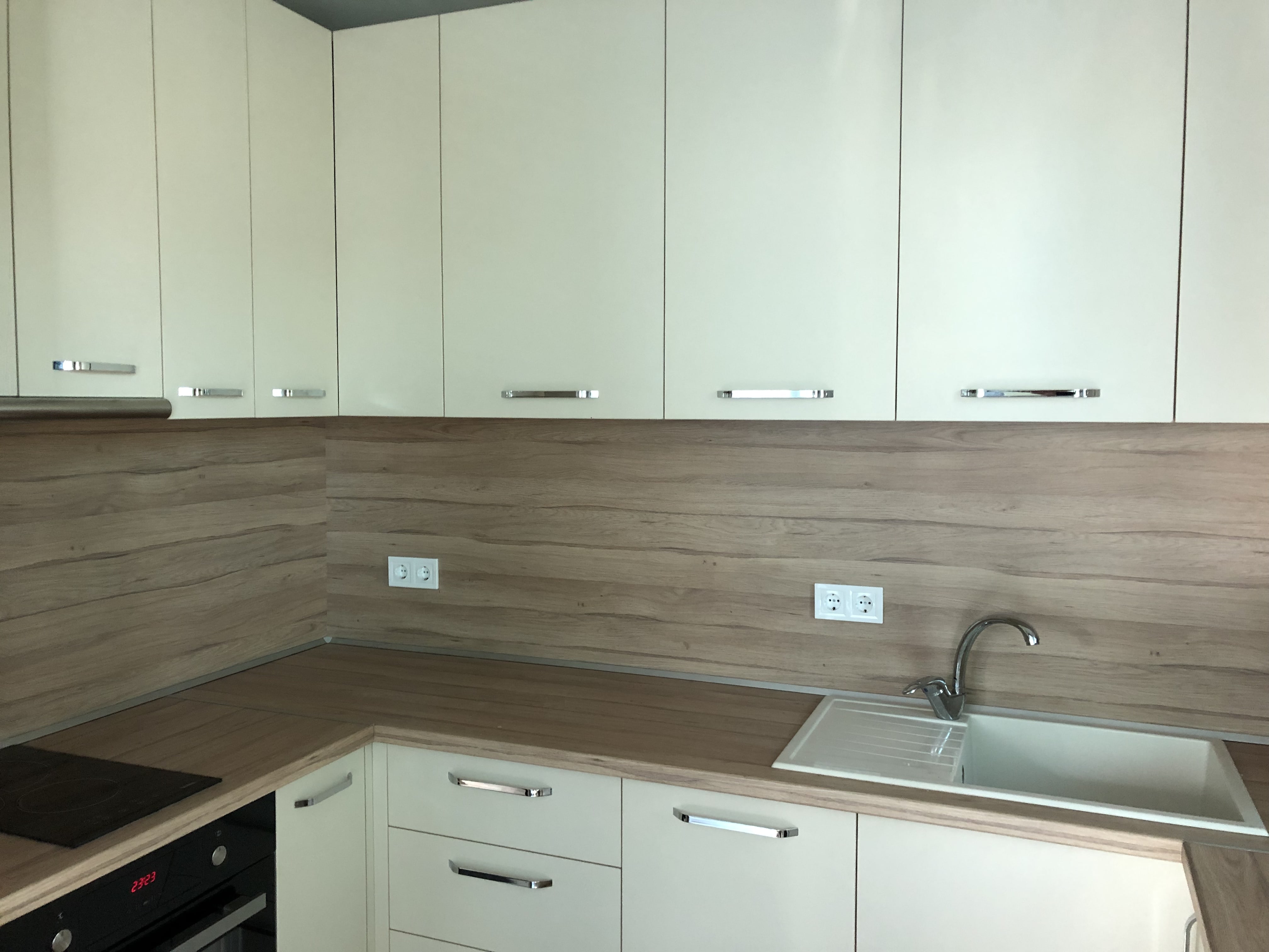 Кухня от ПДЧ с цвят керемида и дървесен плот