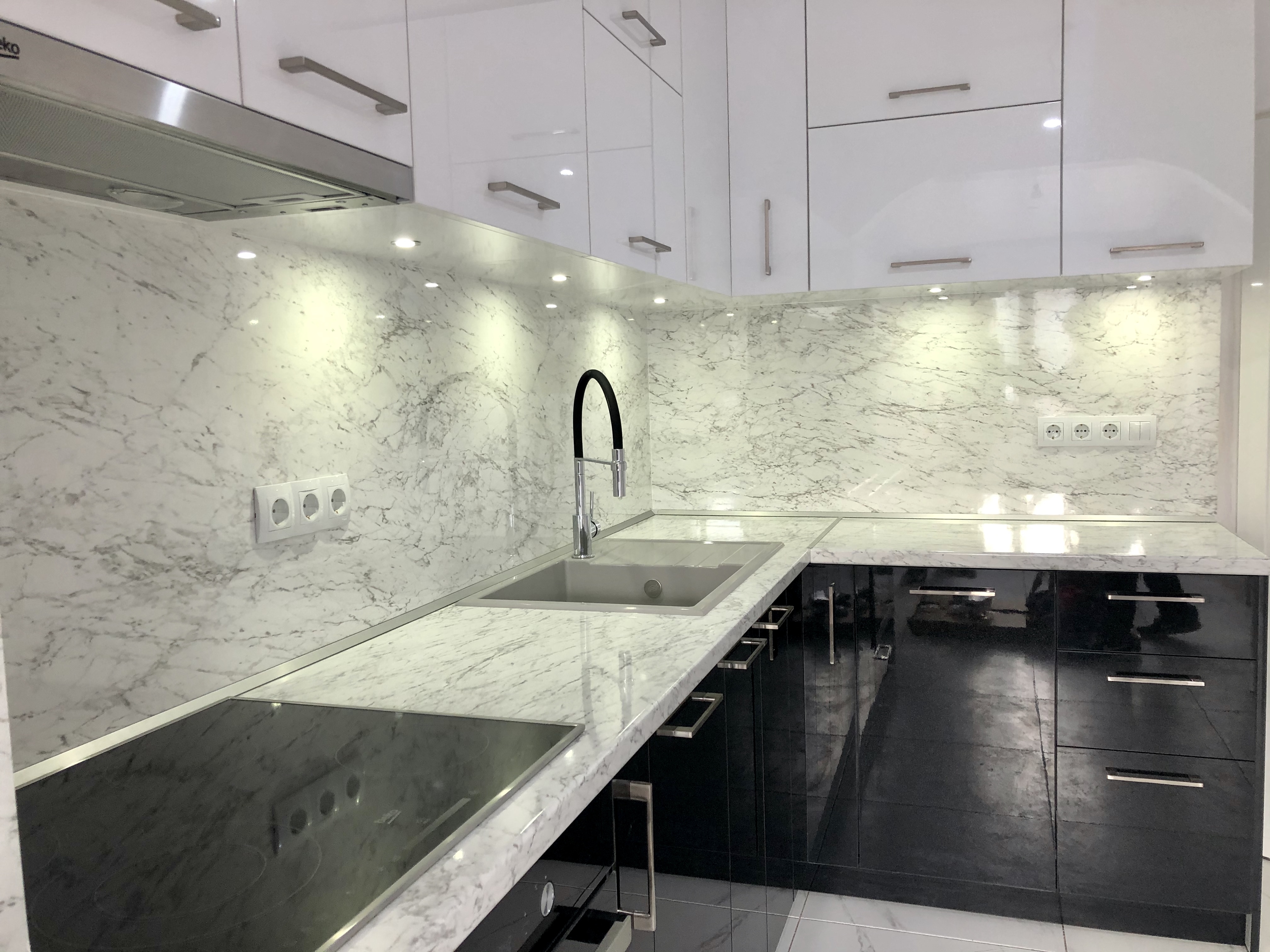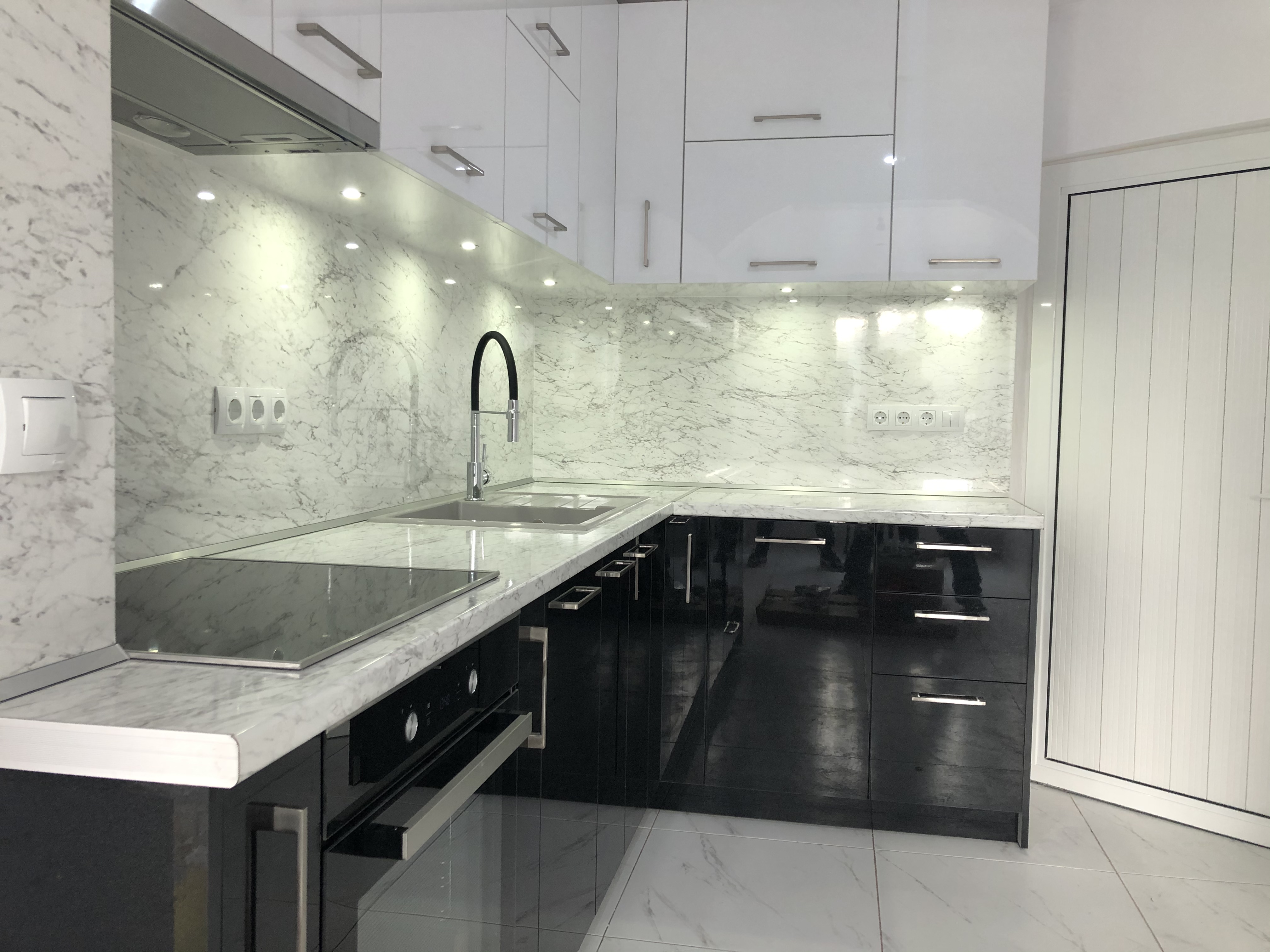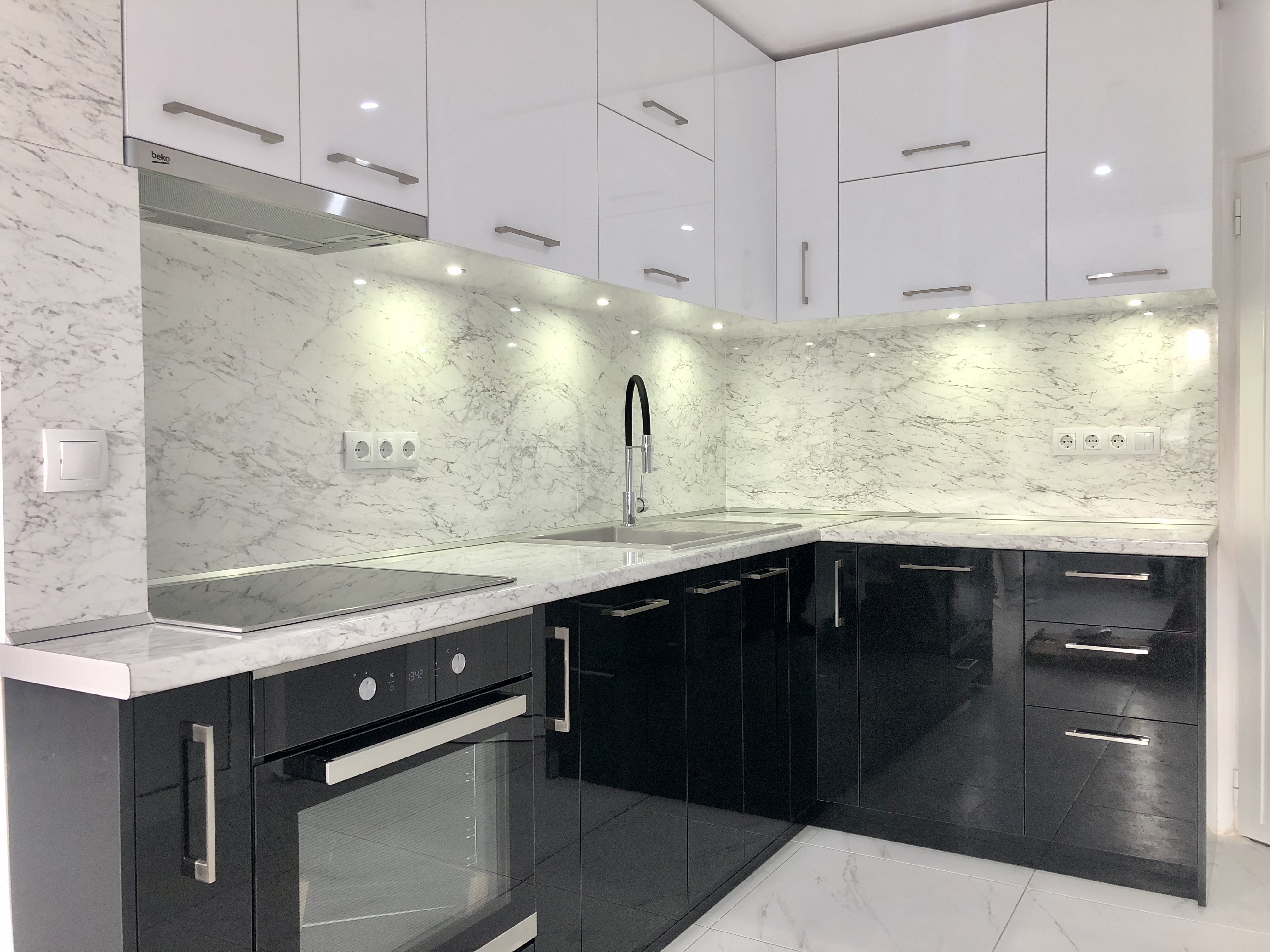 Кухня от МДФ с комбинация от перла бял и черен гланц