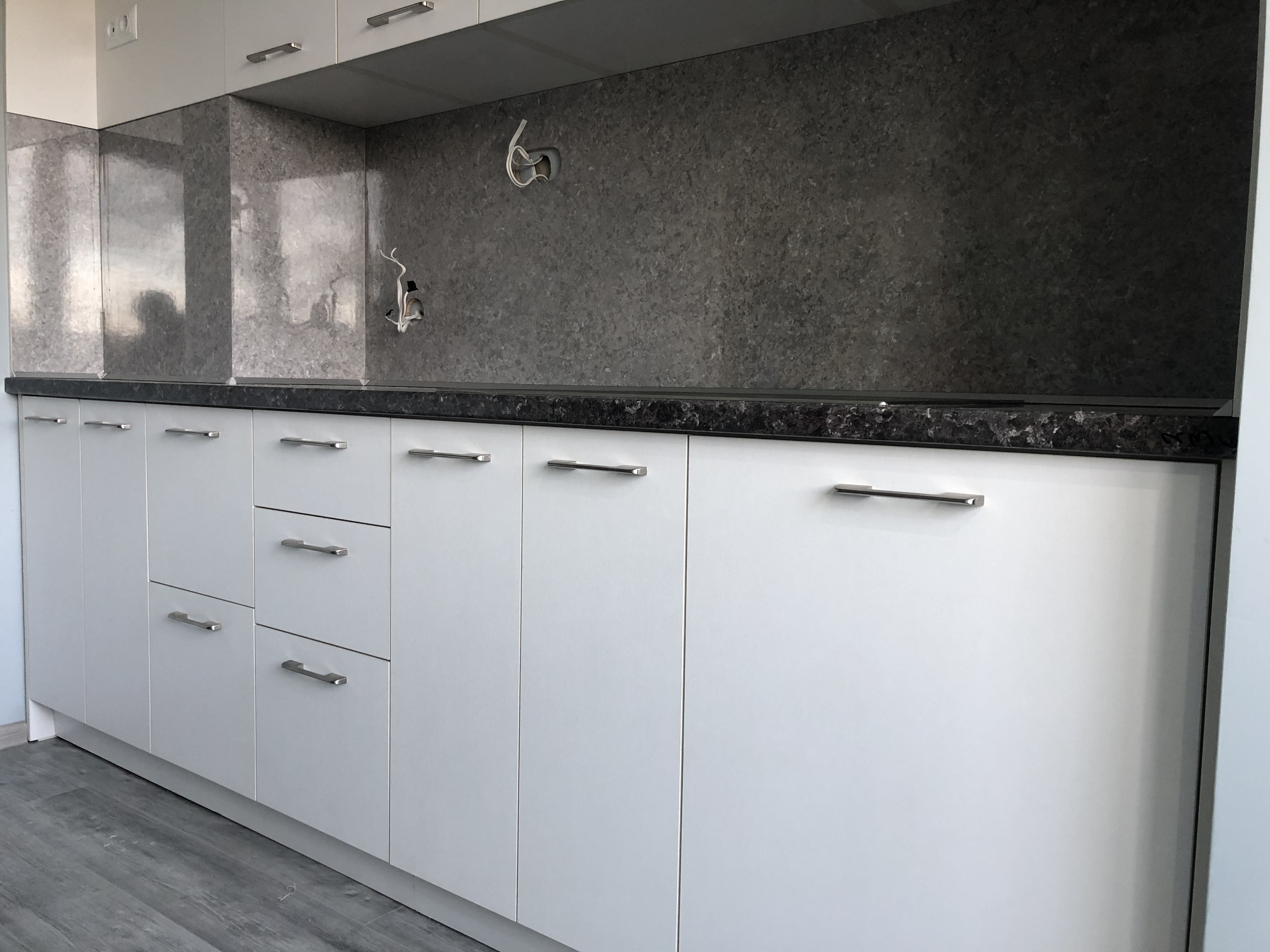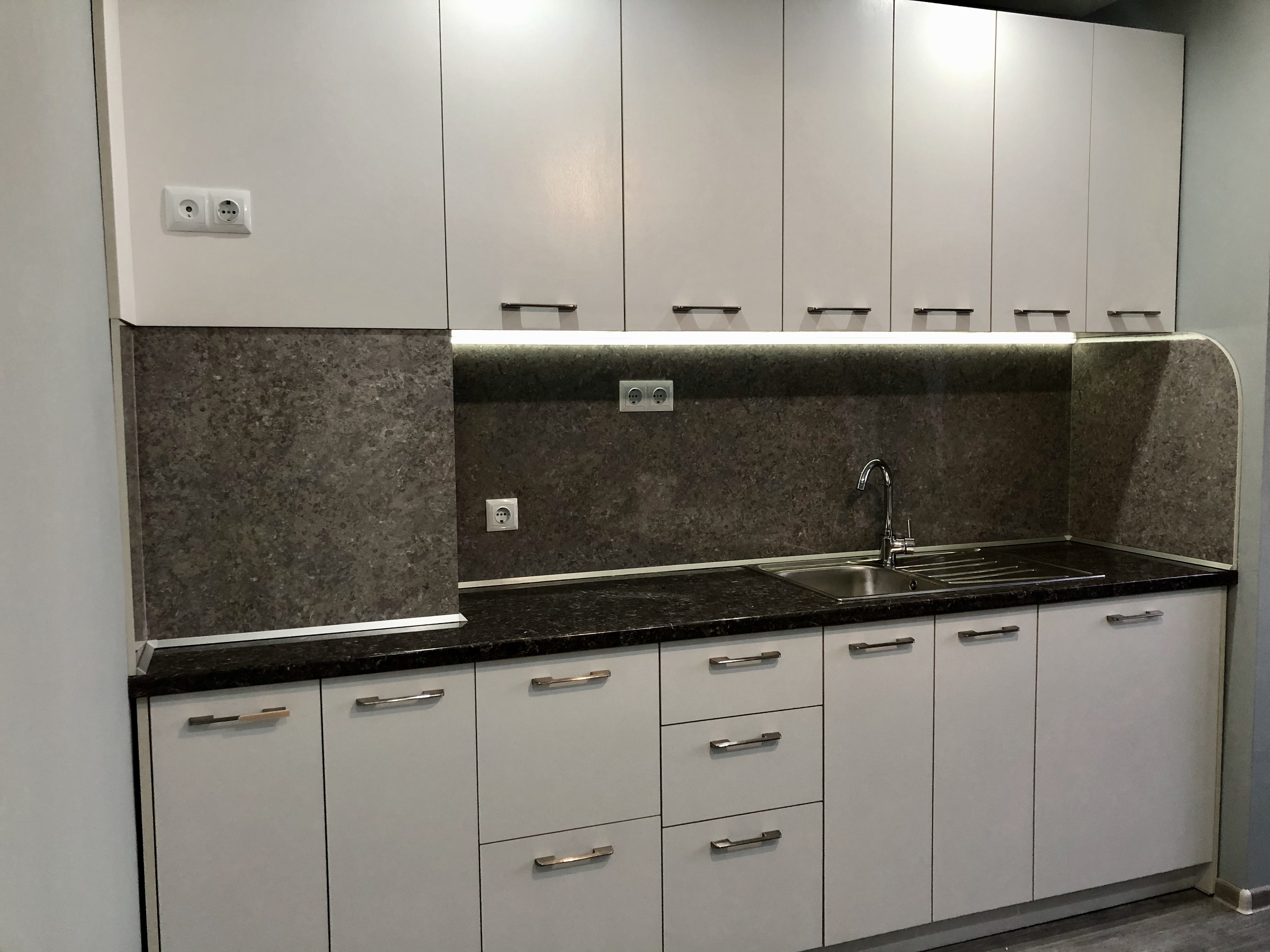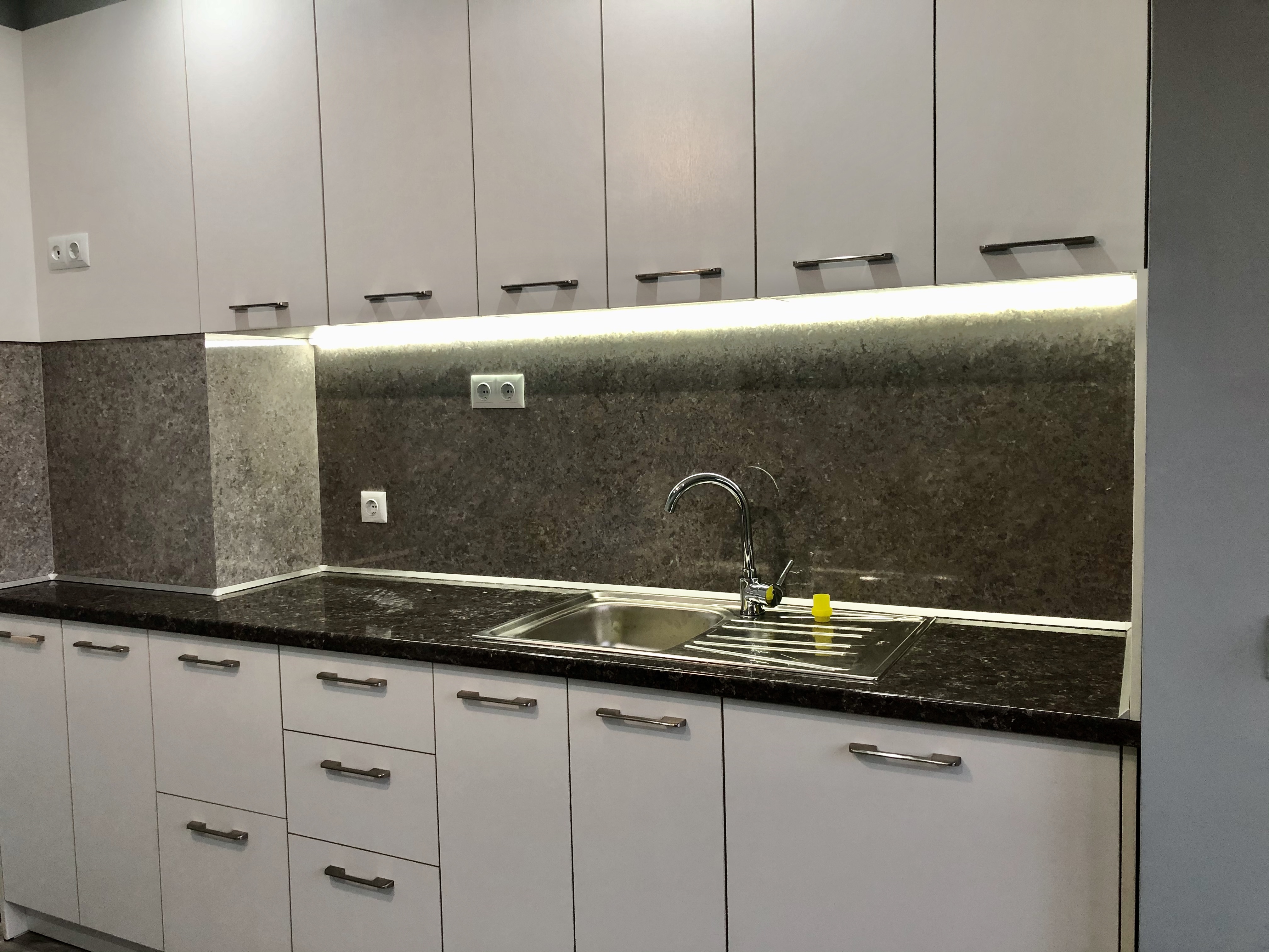 Кухня с комбинация от бяло релефно ПДЧ и плот мозайка