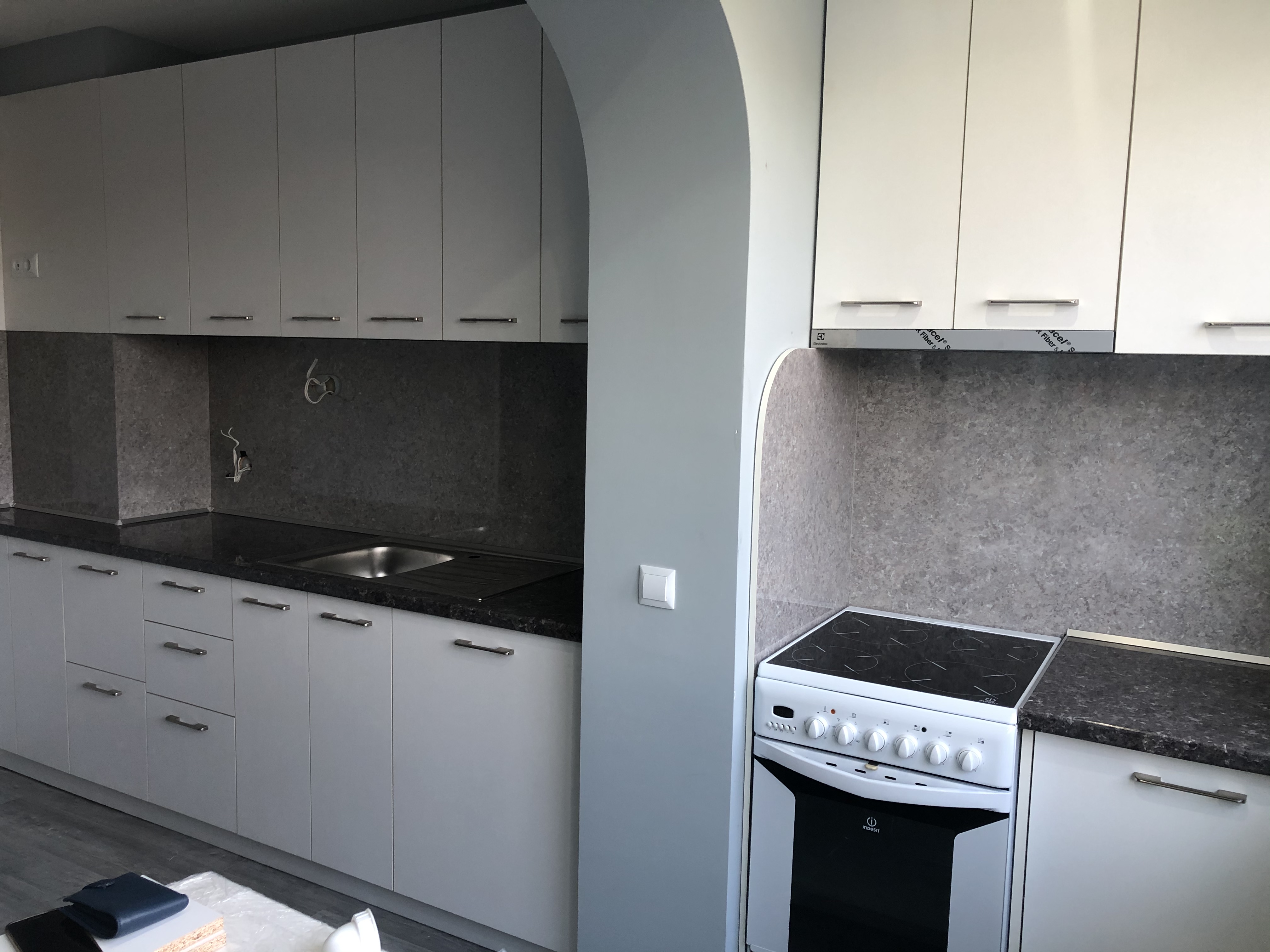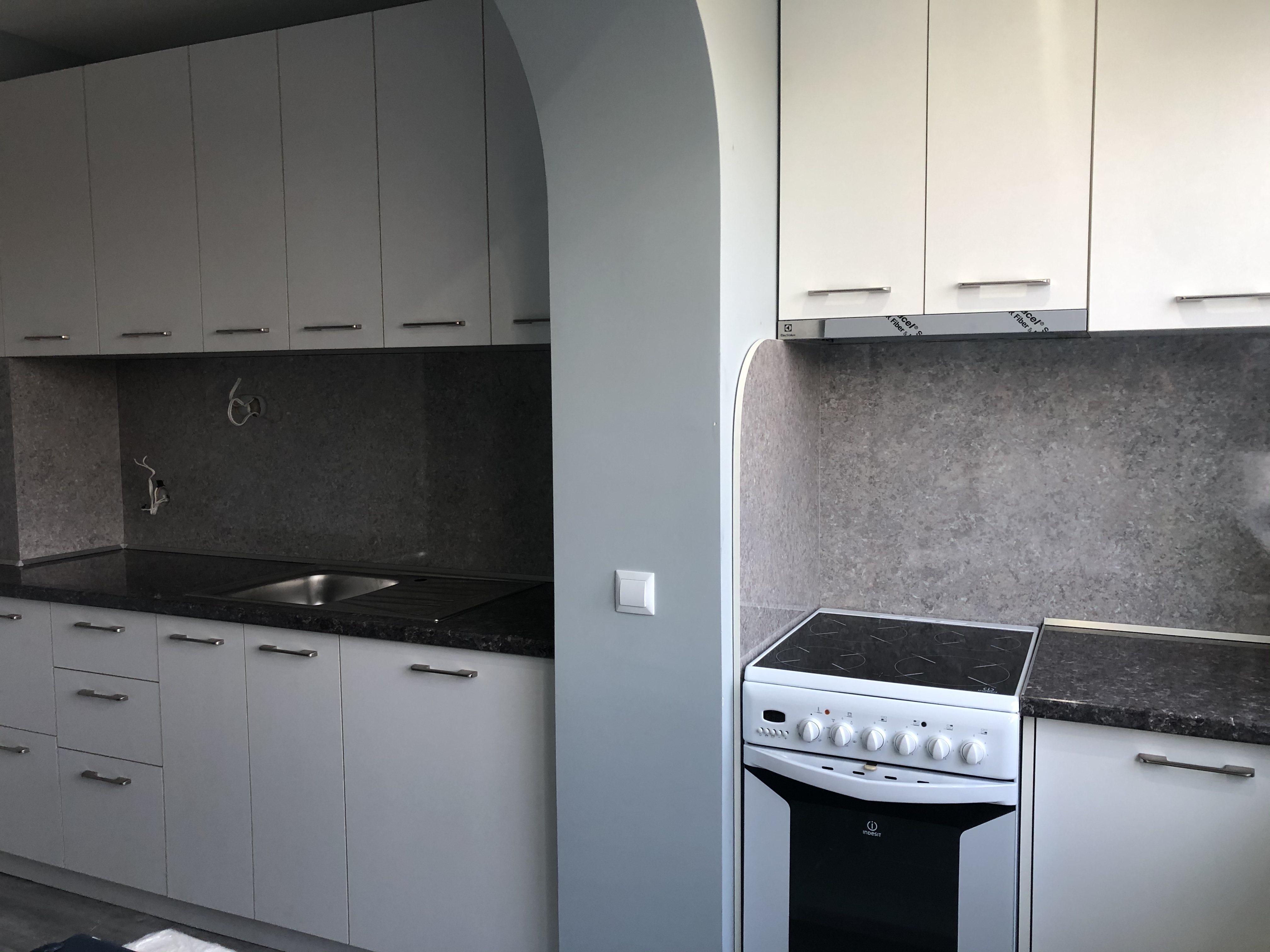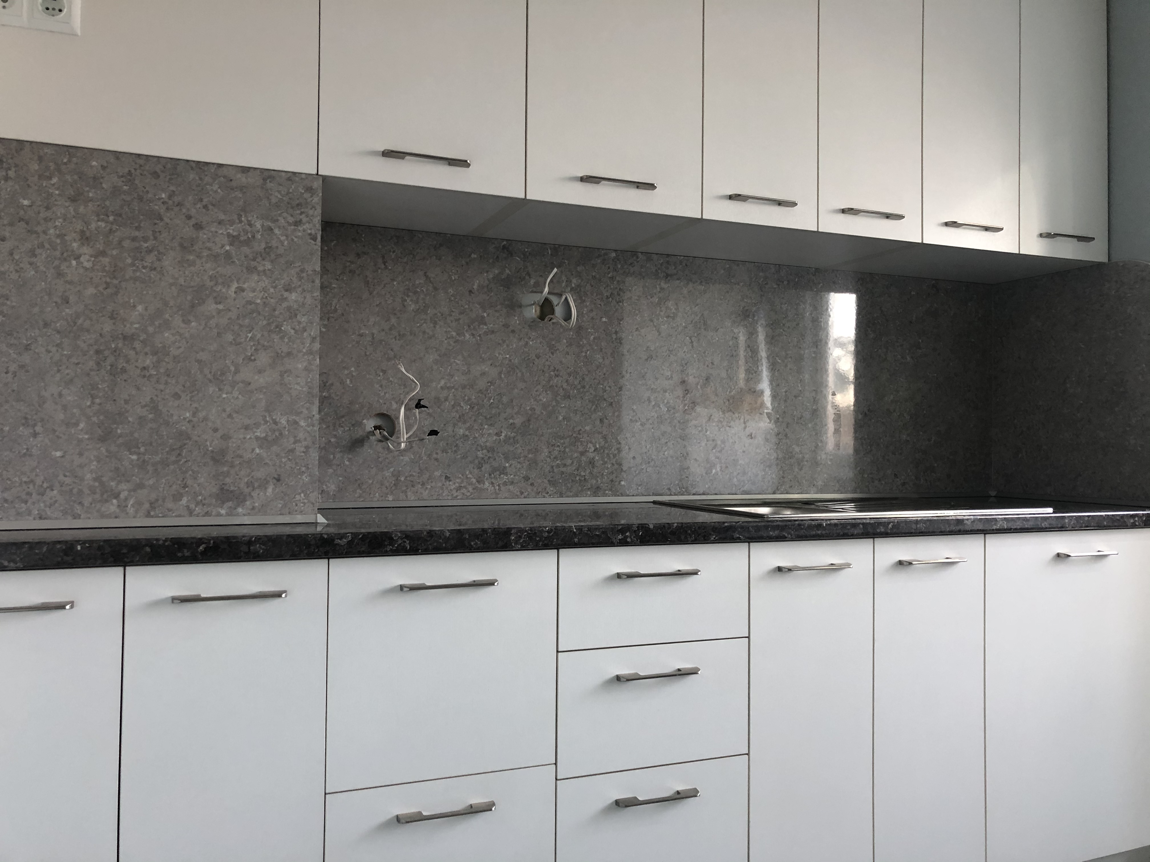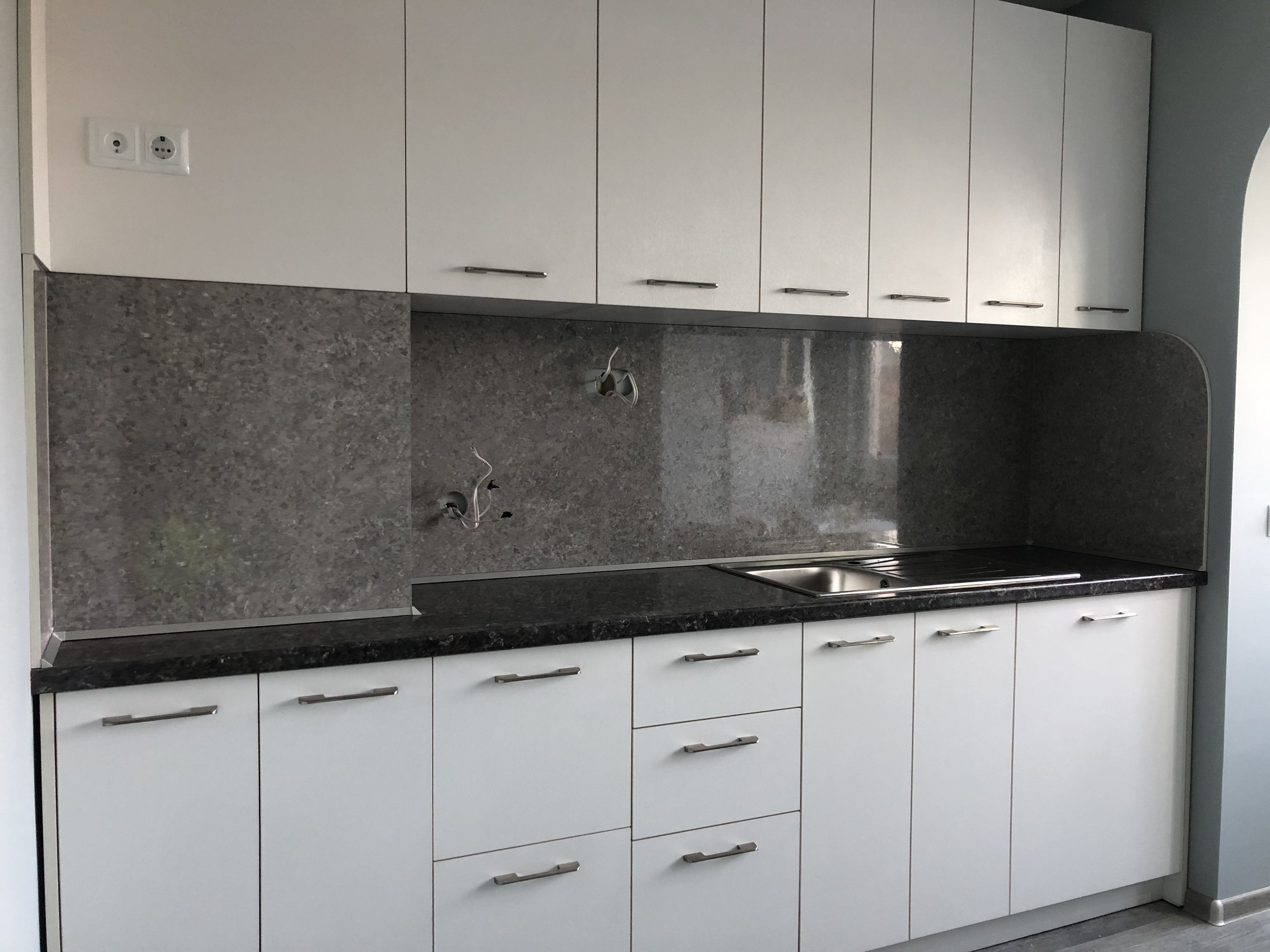 Кухня с комбинация от бяло релефно ПДЧ и плот мозайка