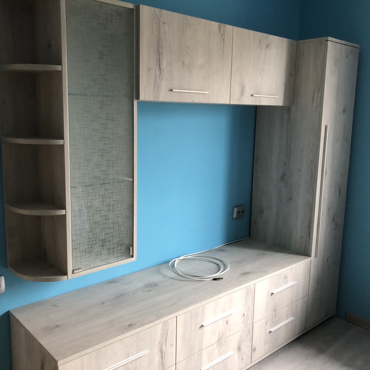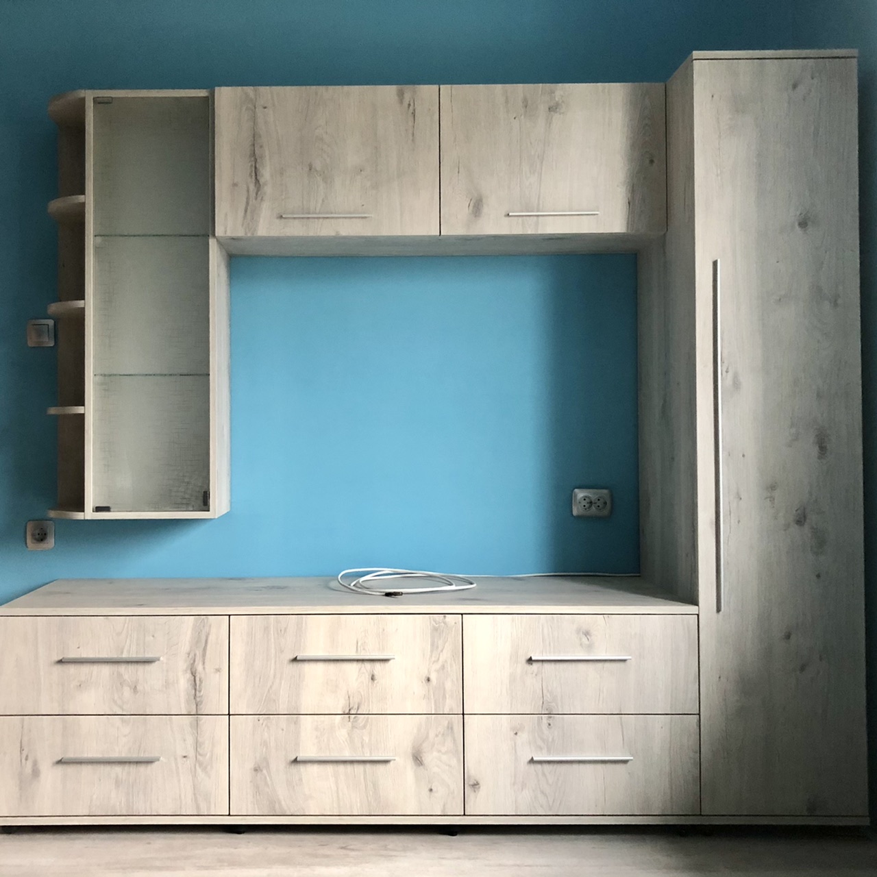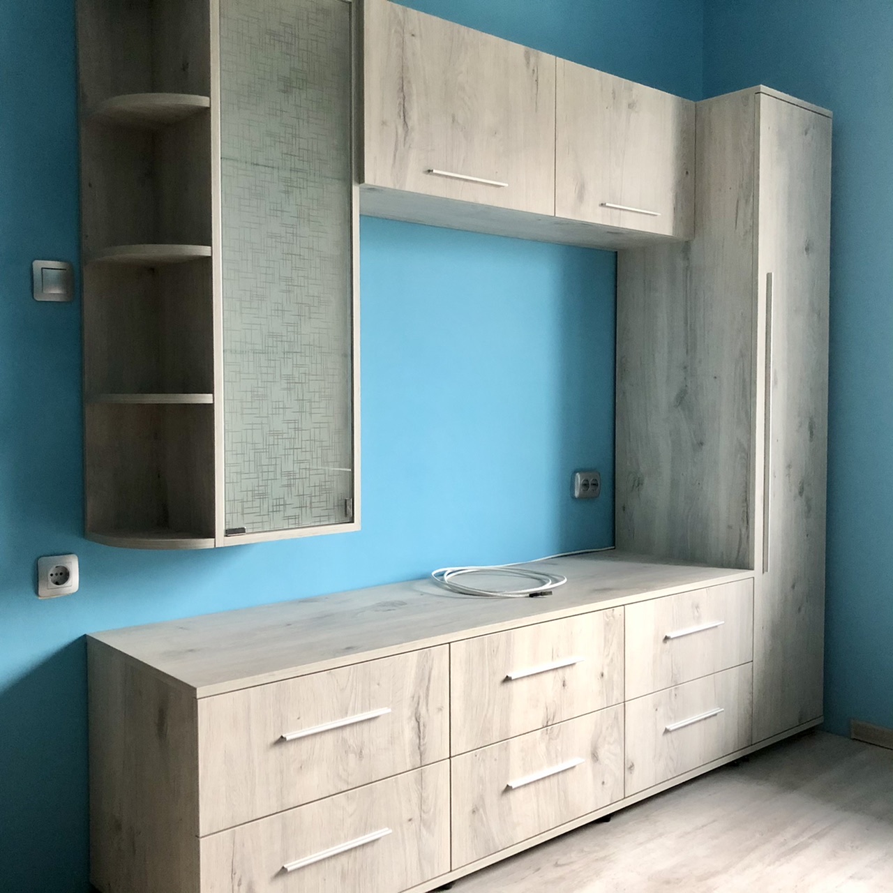 Холна секция “ Виора” Холна секция с чекмеджета плавно затваряне, витрина със стъкло, горен модул и гардероб.