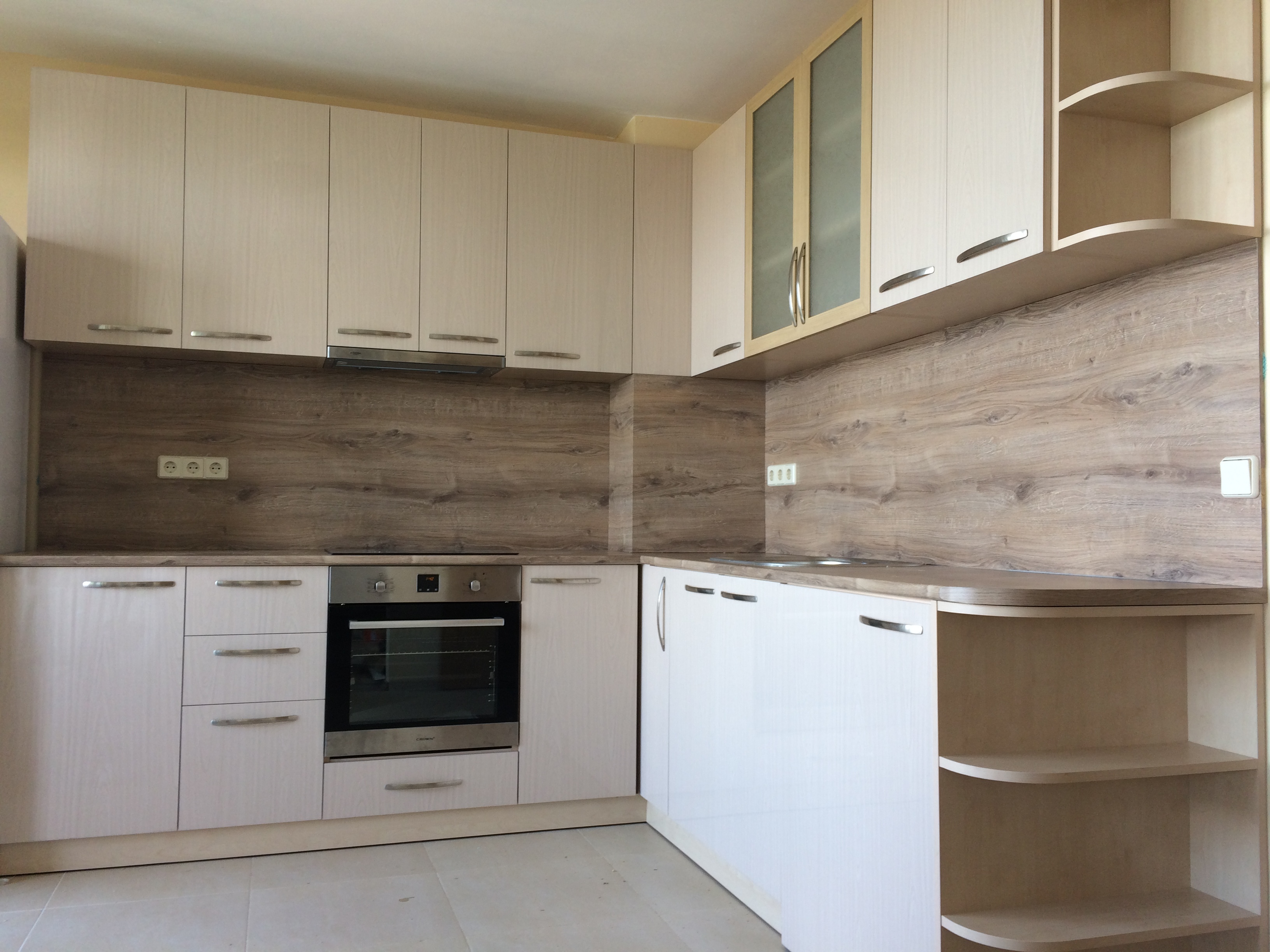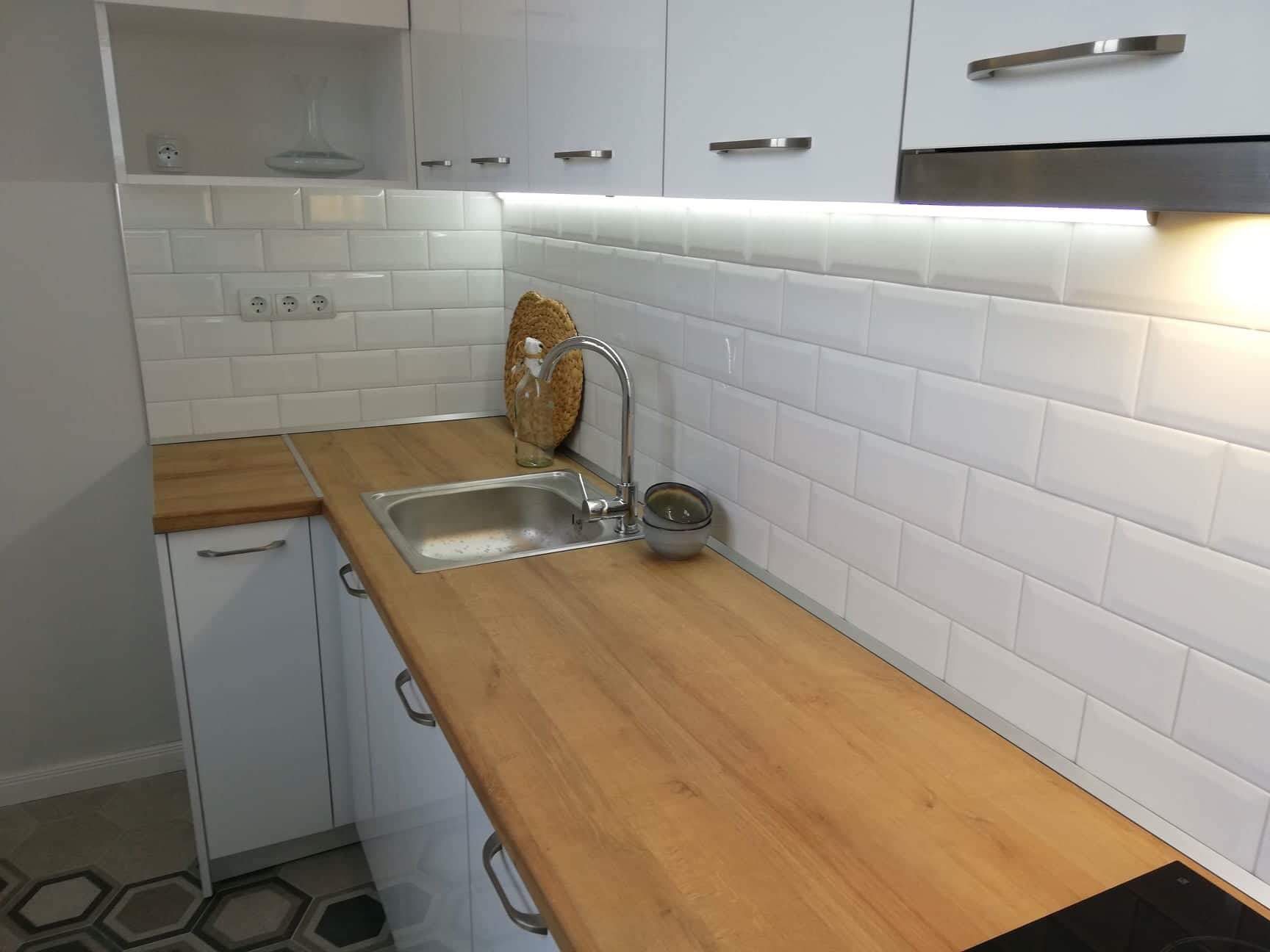 Кухня с бял MDF и дървен плот