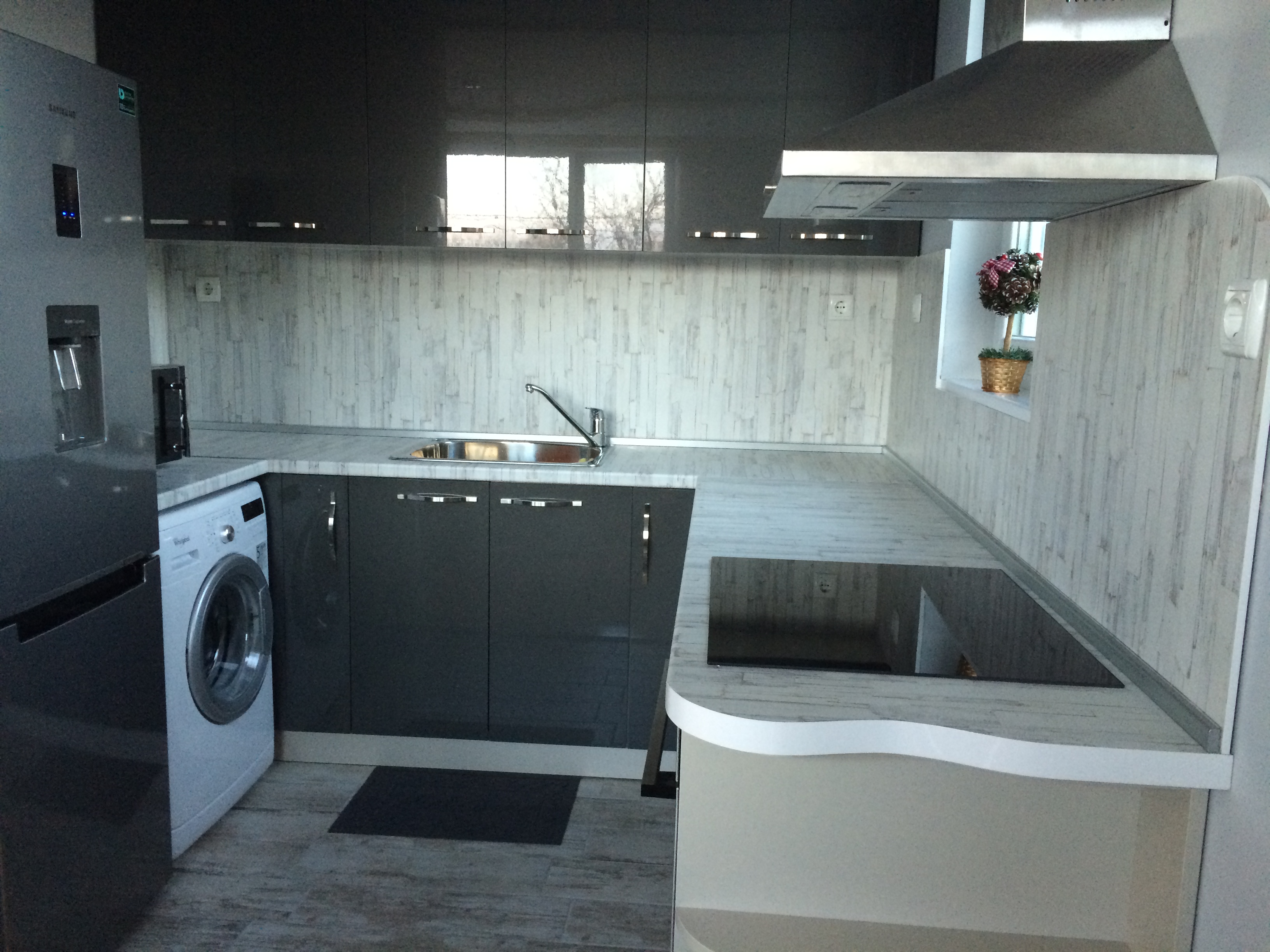 Кухня в сив глнац и ретро дърво